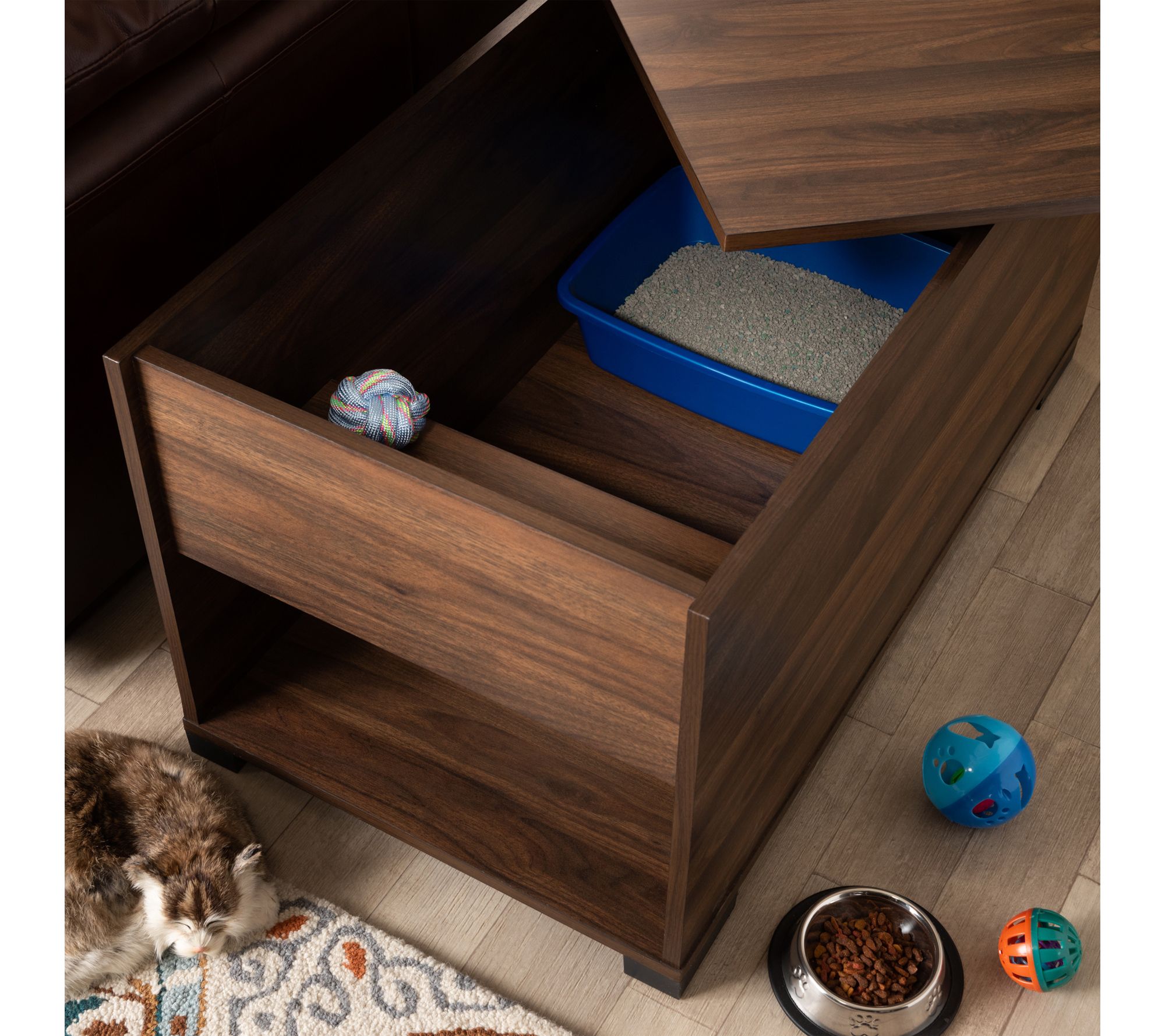 • Conceals litter box and stores supplies with an inner shelf