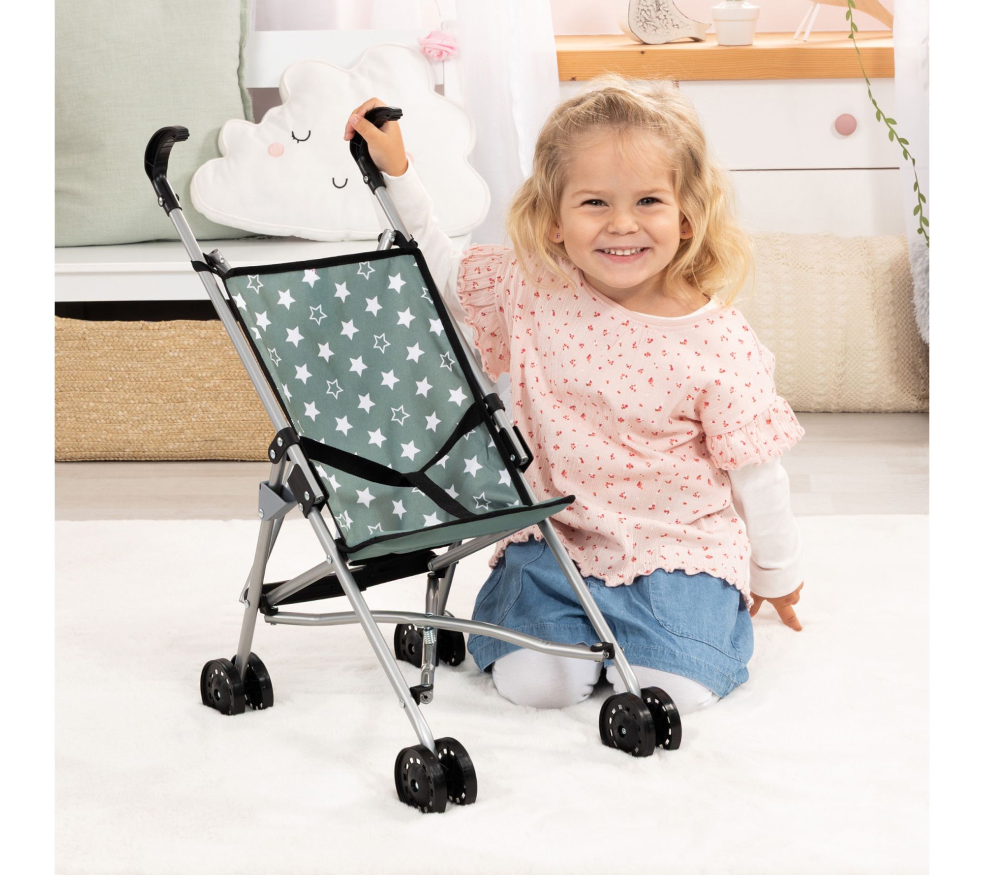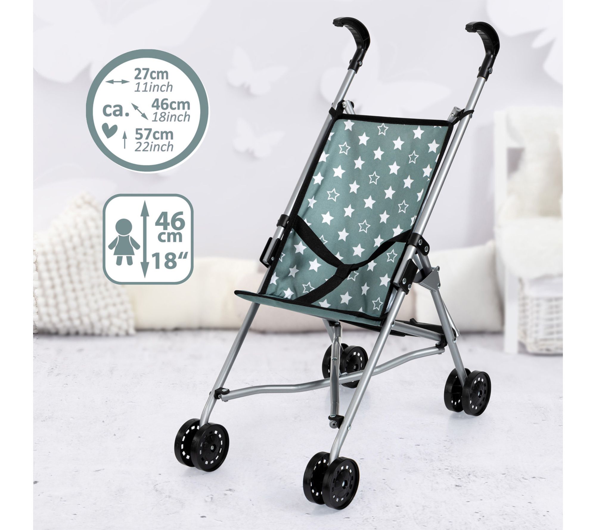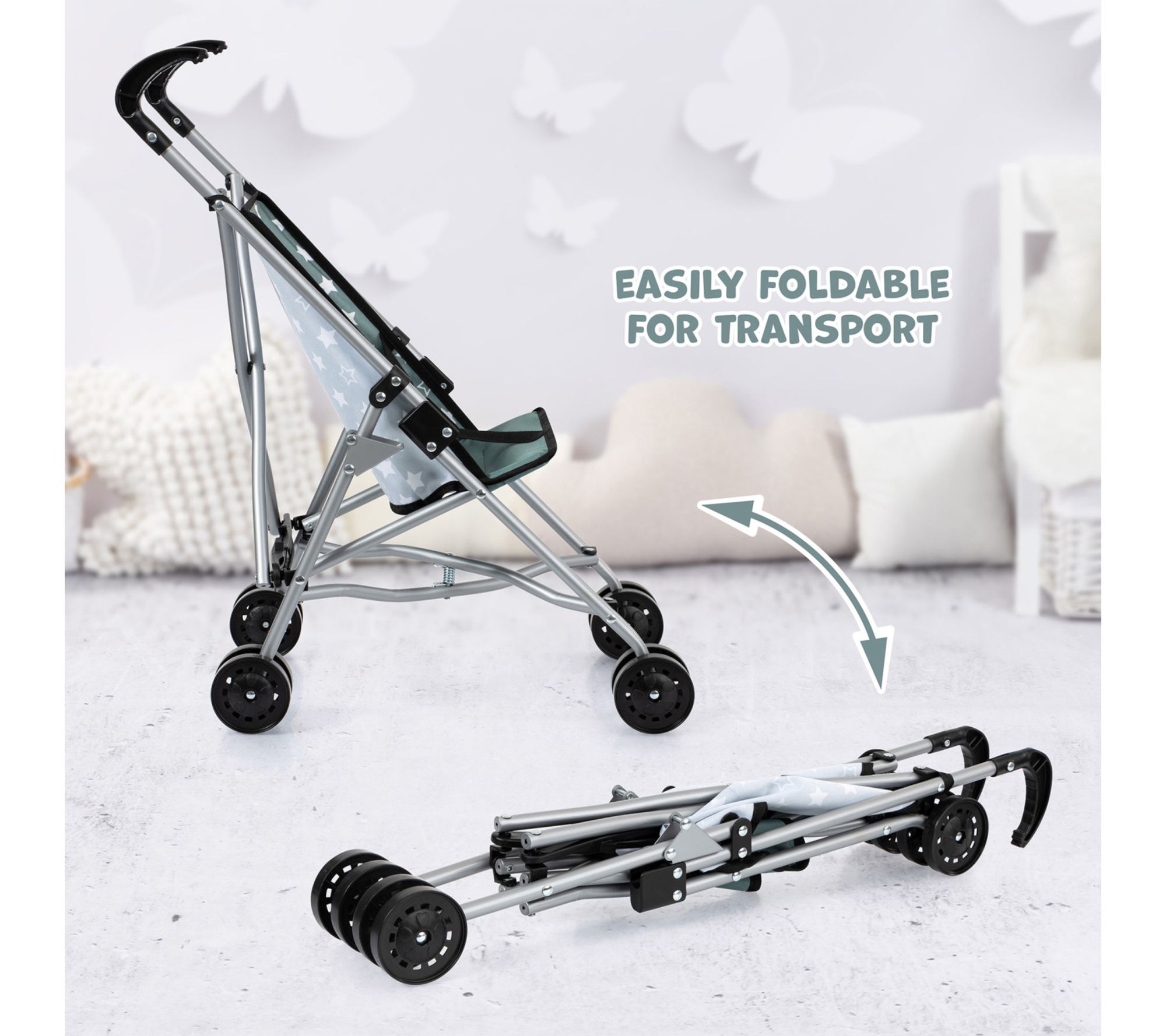 Take playtime on the go with this doll umbrella stroller, featuring charming green and white stars. Effortlessly foldable and equipped with an integrated safety belt, it's made for strolls around the house or neighborhood, ensuring plushies and dolls up to 18 inches are comfortably secured. Dual wheels make for smooth movement, encouraging imaginative adventures wherever the day takes you. From Bayer Design.