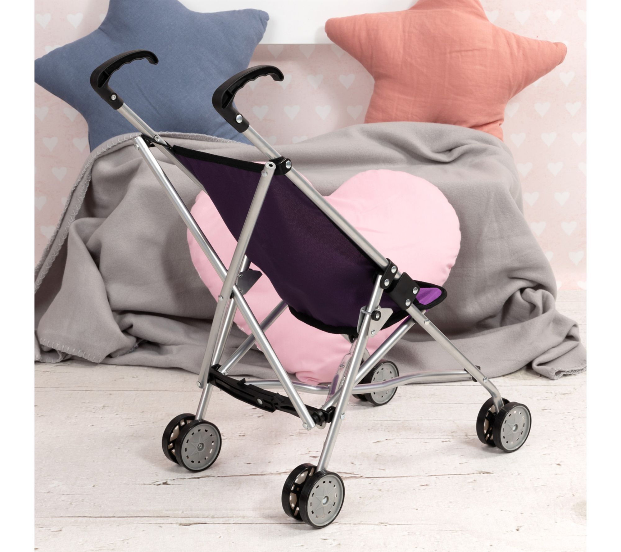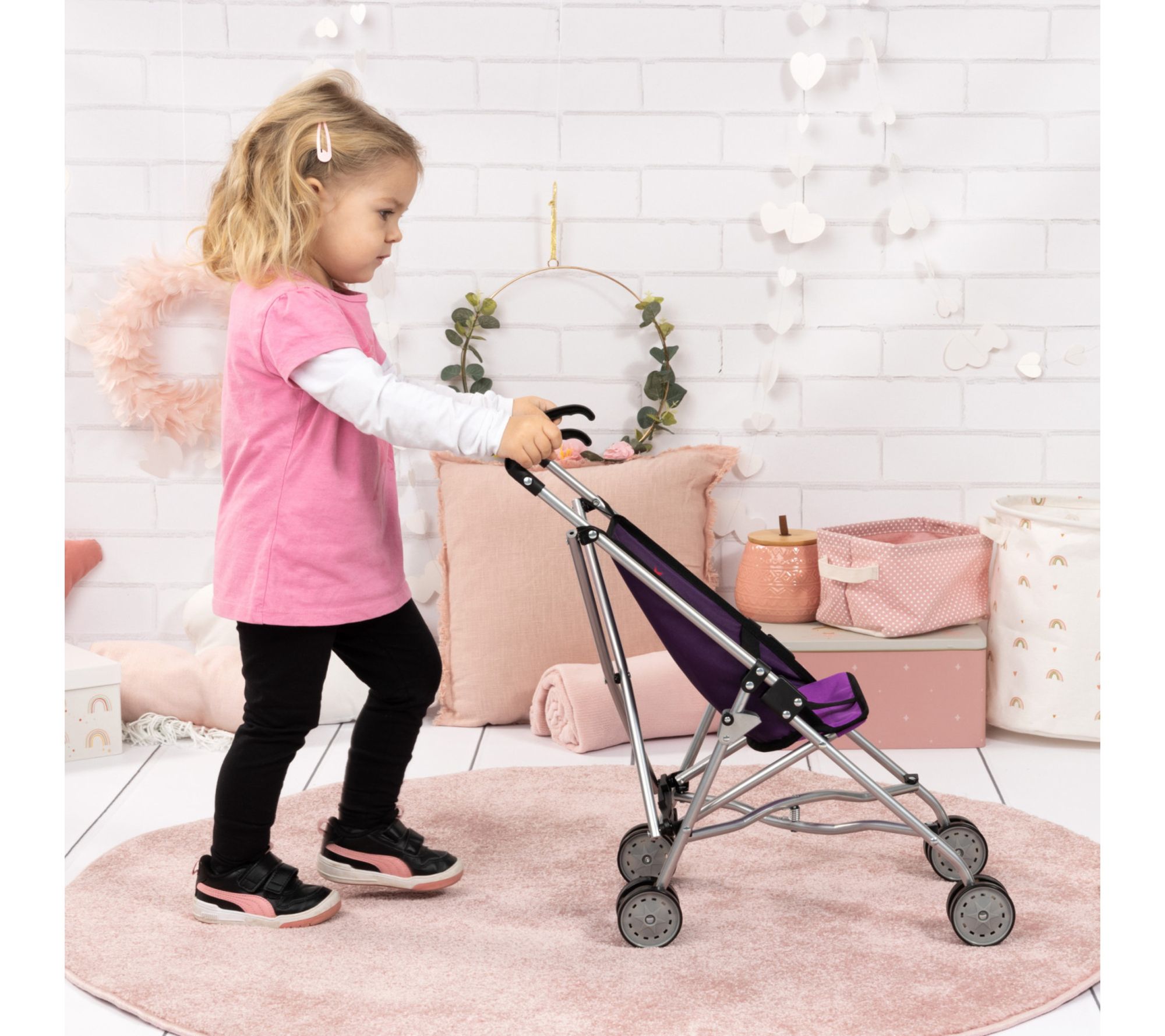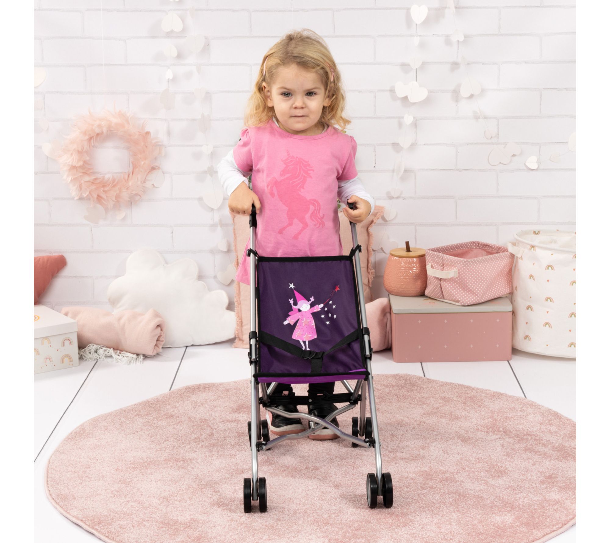 Watch your little one's imagination soar during playtime as they stroll, care for, and adventure with their favorite dolls and plush companions in this fairy-themed doll buggy. Its foldable, lightweight design means playtime can happen anywhere, while an integrated safety belt and cheerful purple fabric add extra charm and comfort to each outing. From Bayer Design Dolls.