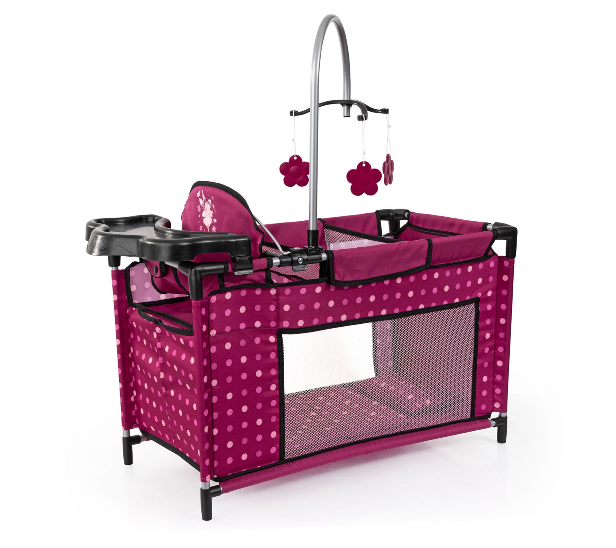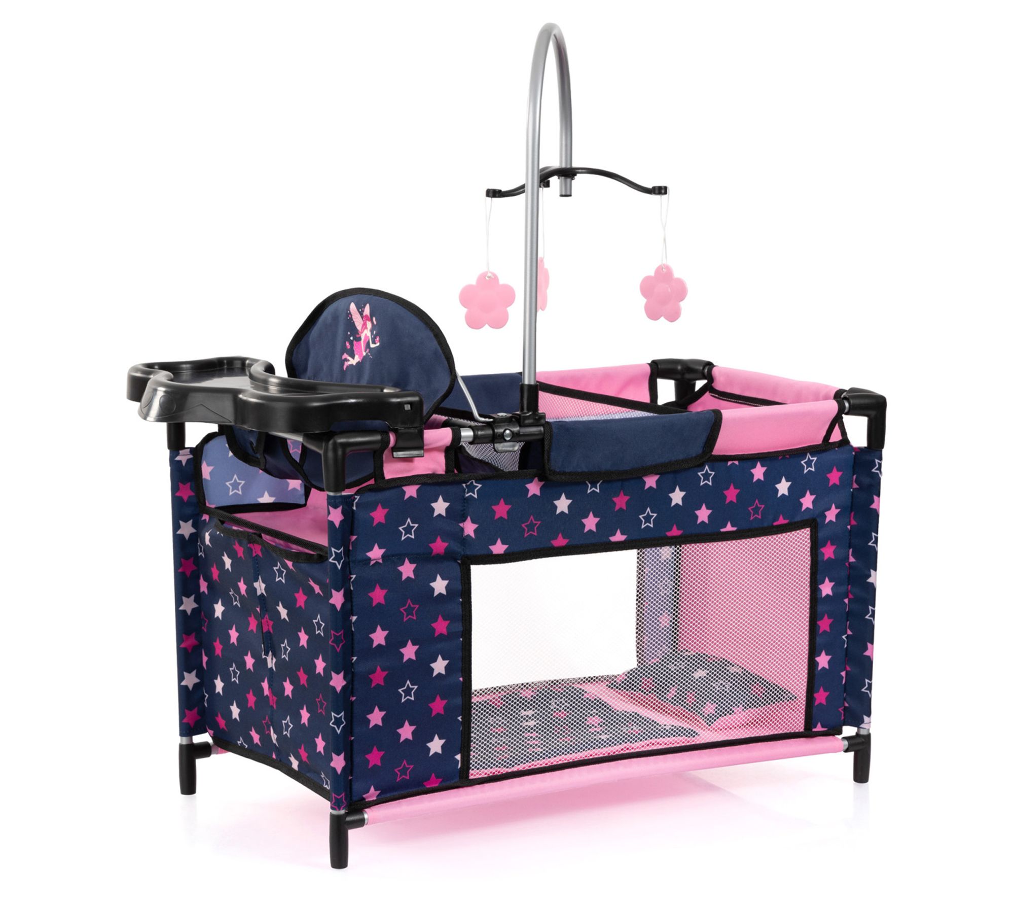• Includes 1 bed with integrated high chair, 3 hangers, 1 pillow, 1 blanket, 1 mobile, 1 changing pad