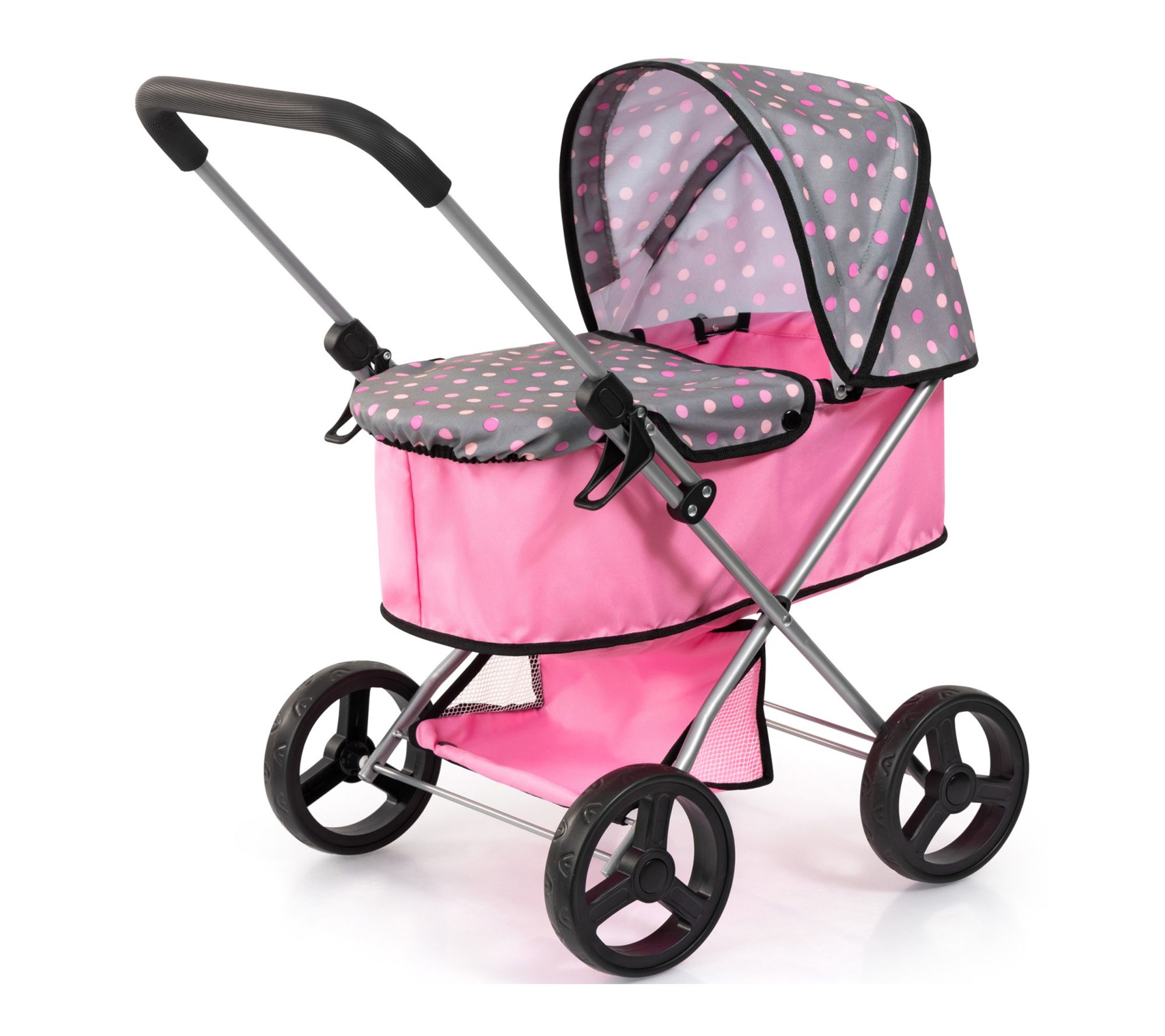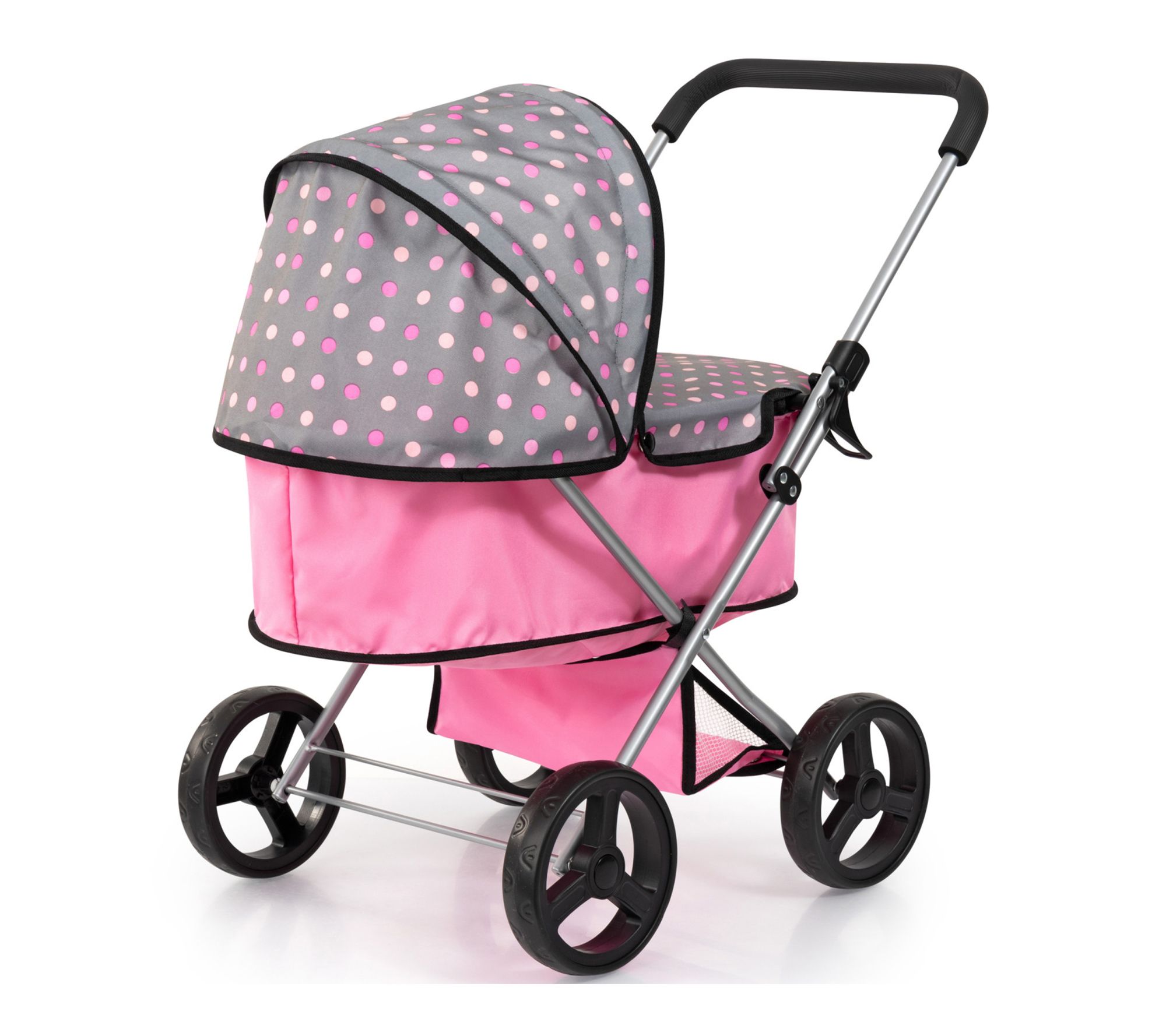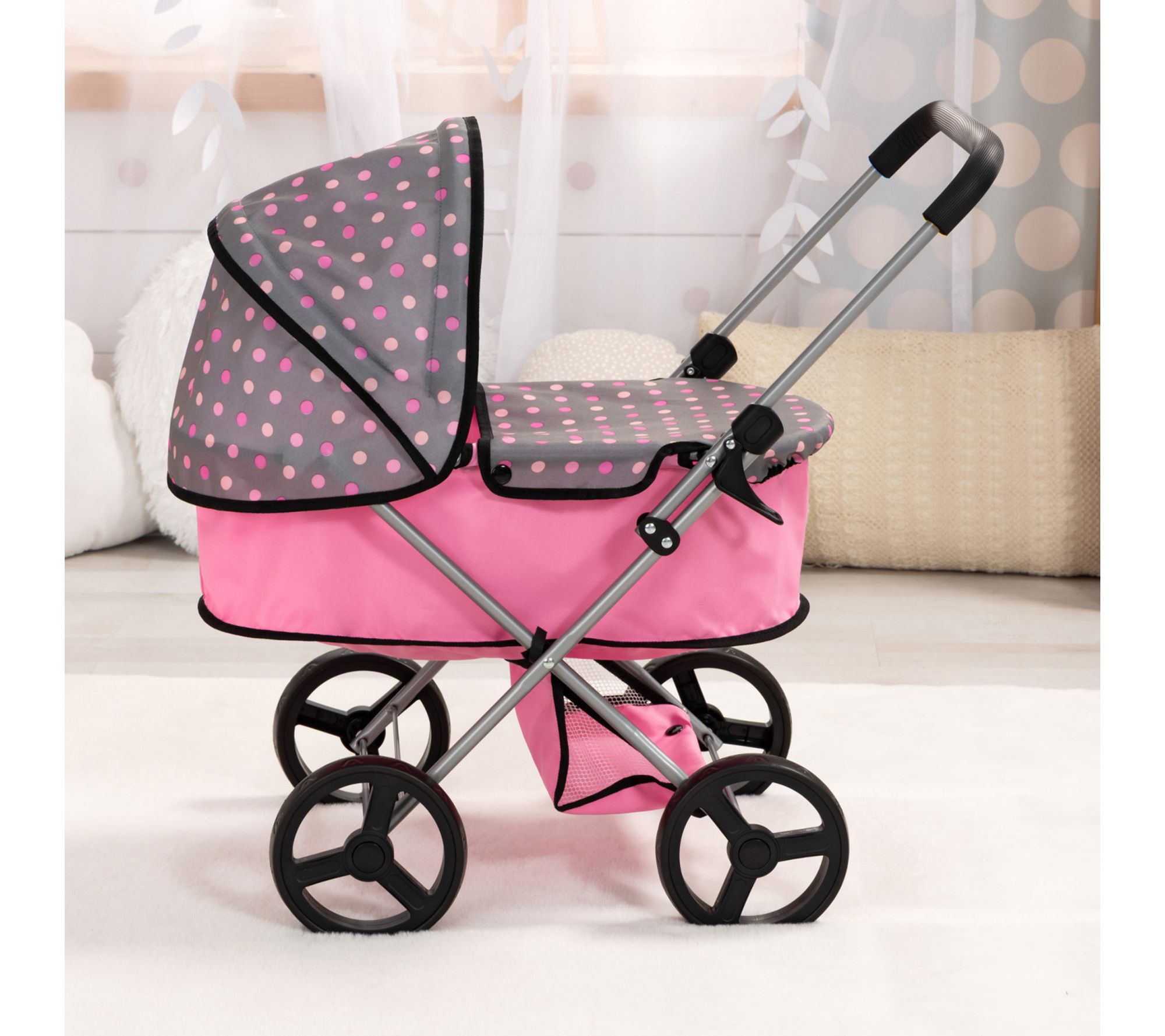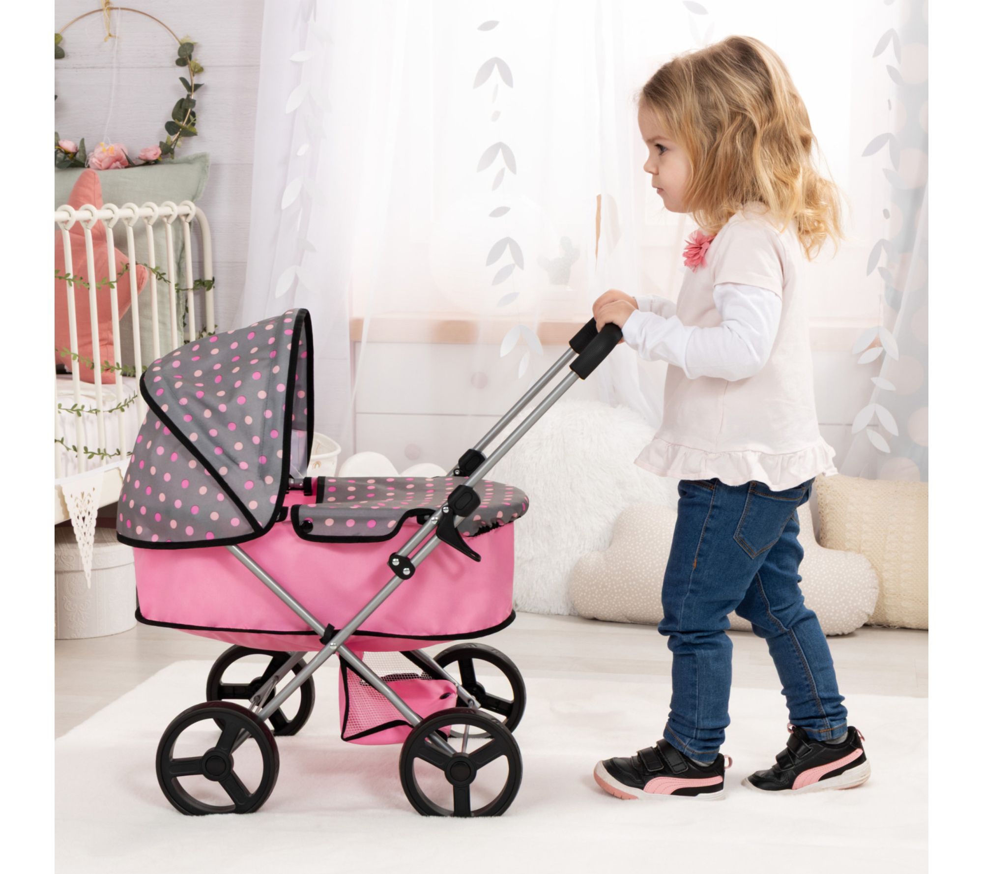 Little ones can step into a world of nurturing play as they stroll through the living room or park with this doll pram, designed for taking favorite dolls or plush on imaginative outings. With its lightweight frame, easy steering handle, protective carrycot cover, and roomy basket for accessories, every adventure becomes an opportunity for creativity and role play. From Bayer Design.