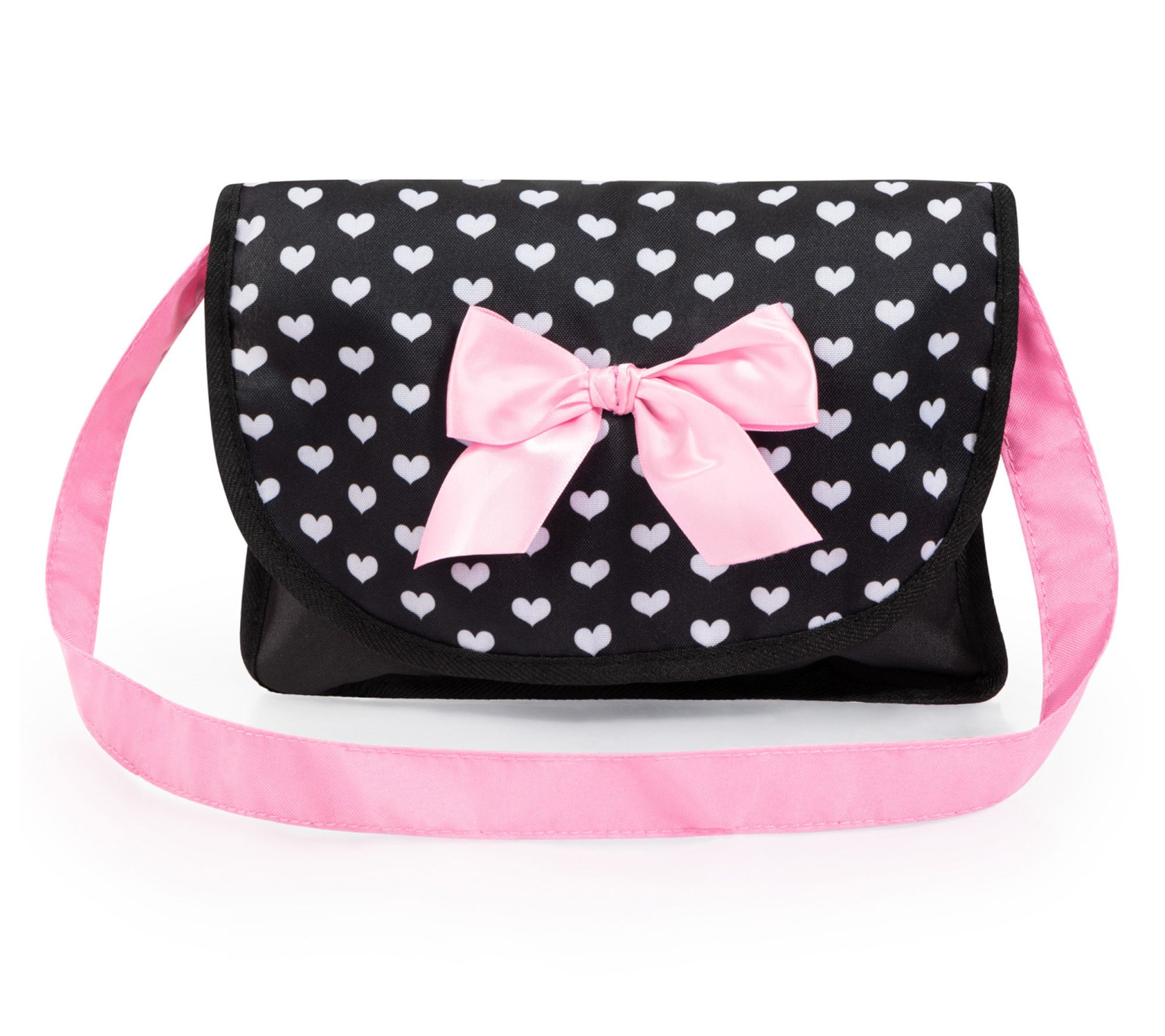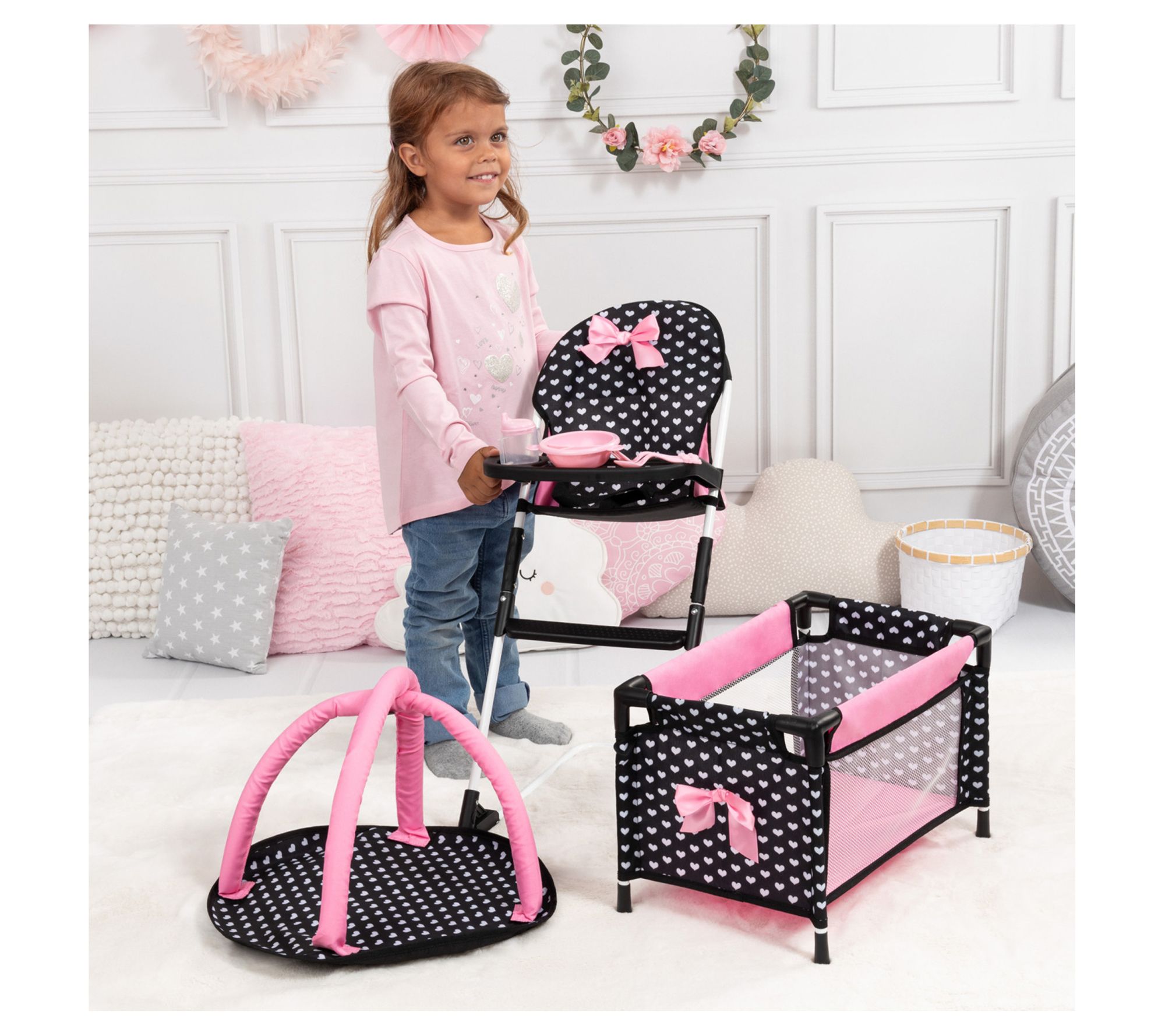 Introducing the ultimate travel companion for your child's dolls and plushies: The Bayer Design doll travel set! With a chic black and pink hearts theme, this 9-piece set includes everything needed for on-the-go adventures, from a fashionably designed highchair to a cozy port-a-crib. Your child's imagination will soar as they embark on exciting journeys with their beloved companions. From Bayer Design.