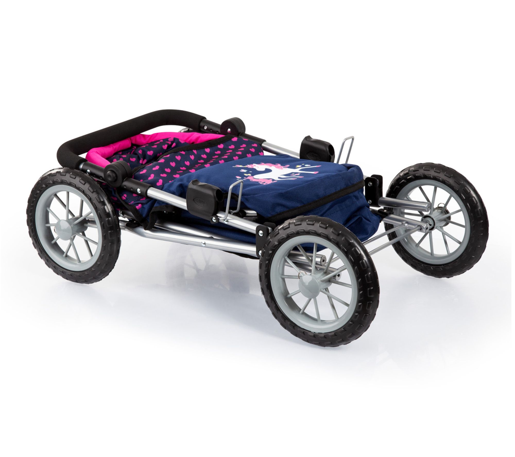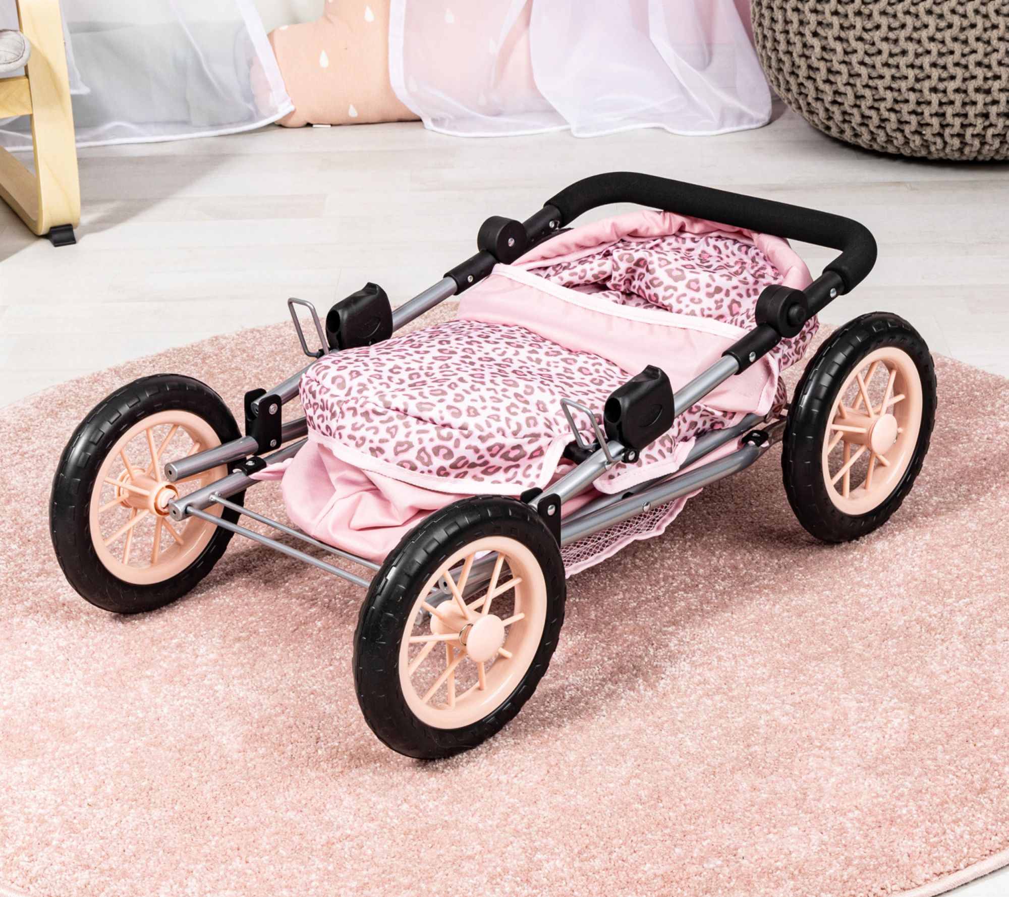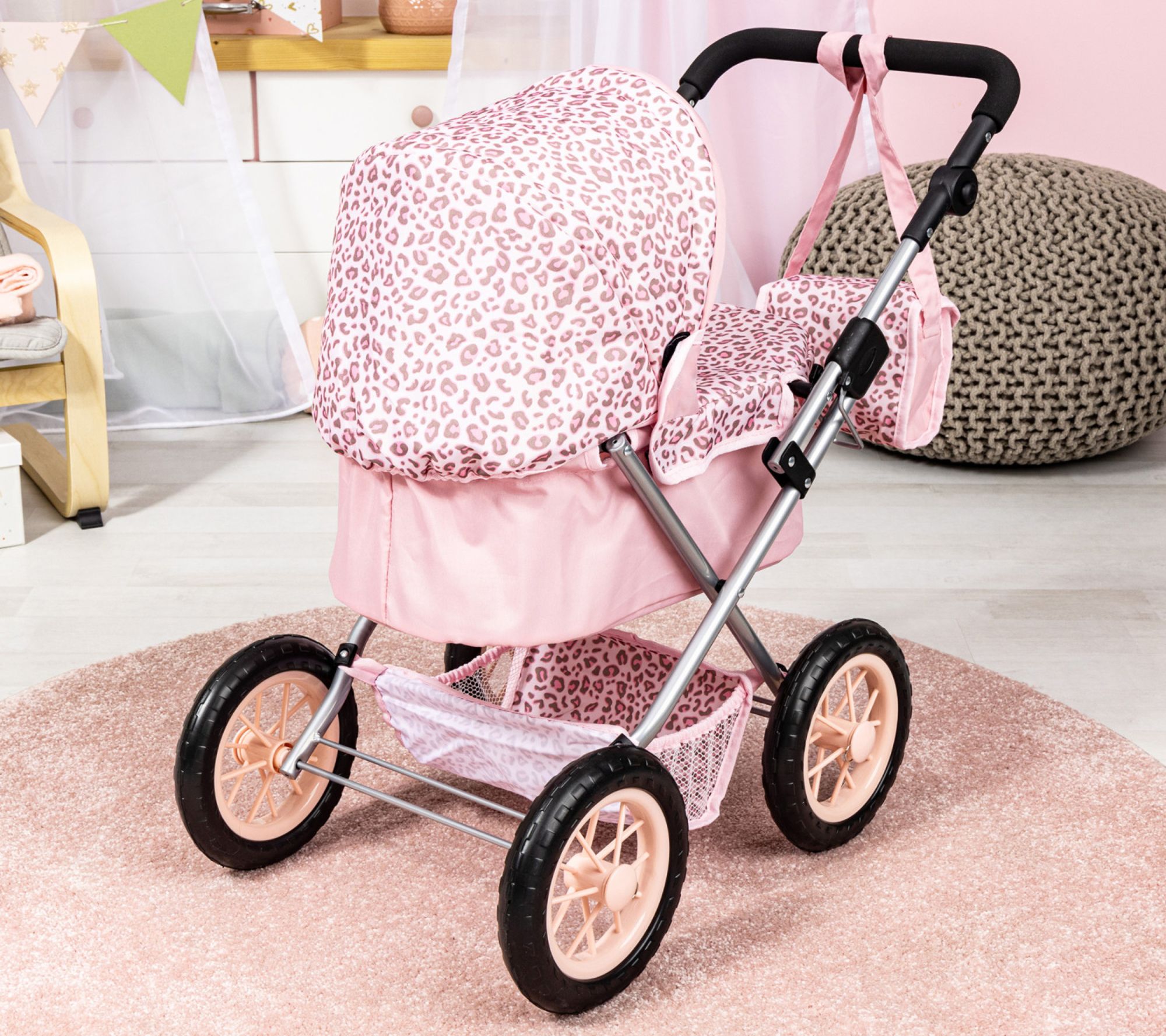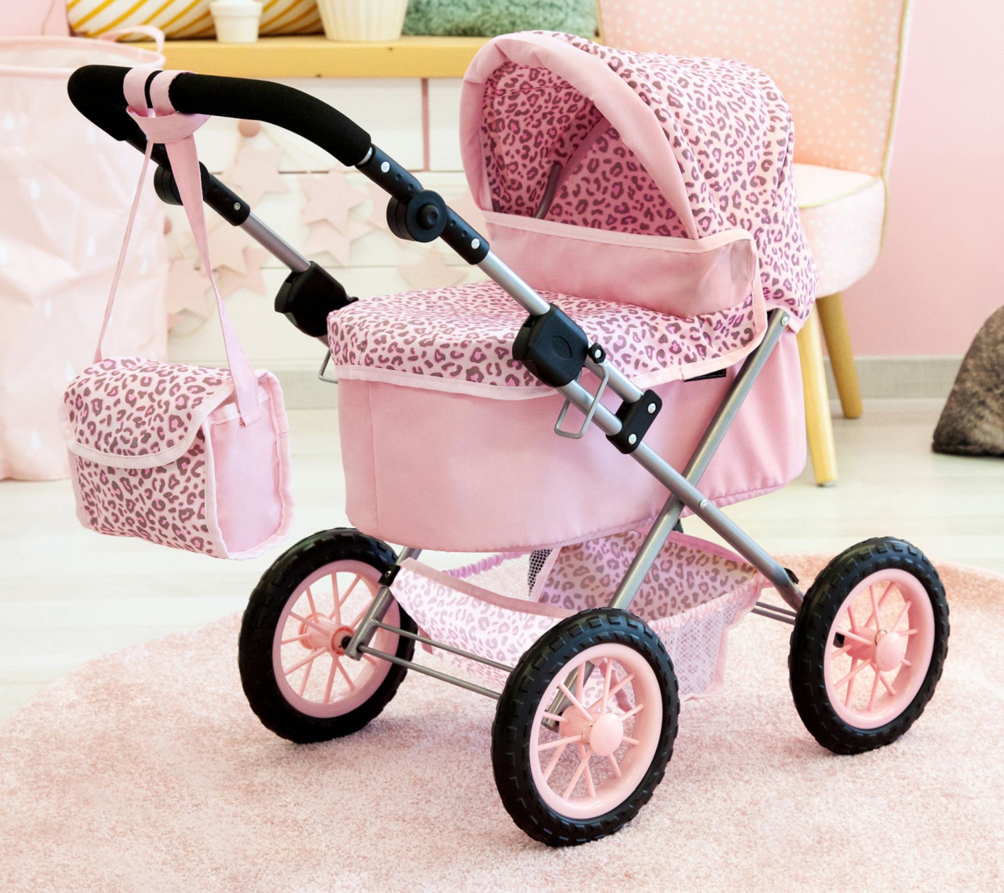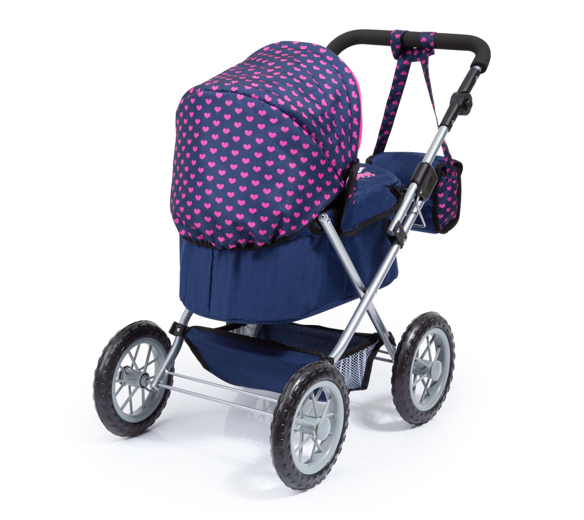 Little ones can embark on imaginative adventures with this stylish doll pram and matching shoulder bag, designed for dolls, plush toys, or stuffed animals up to 18 inches. Adjustable handle height and large tires make strolls easy, while the folding frame and spacious basket add convenience for playdates and tidy storage. From Bayer Design.
