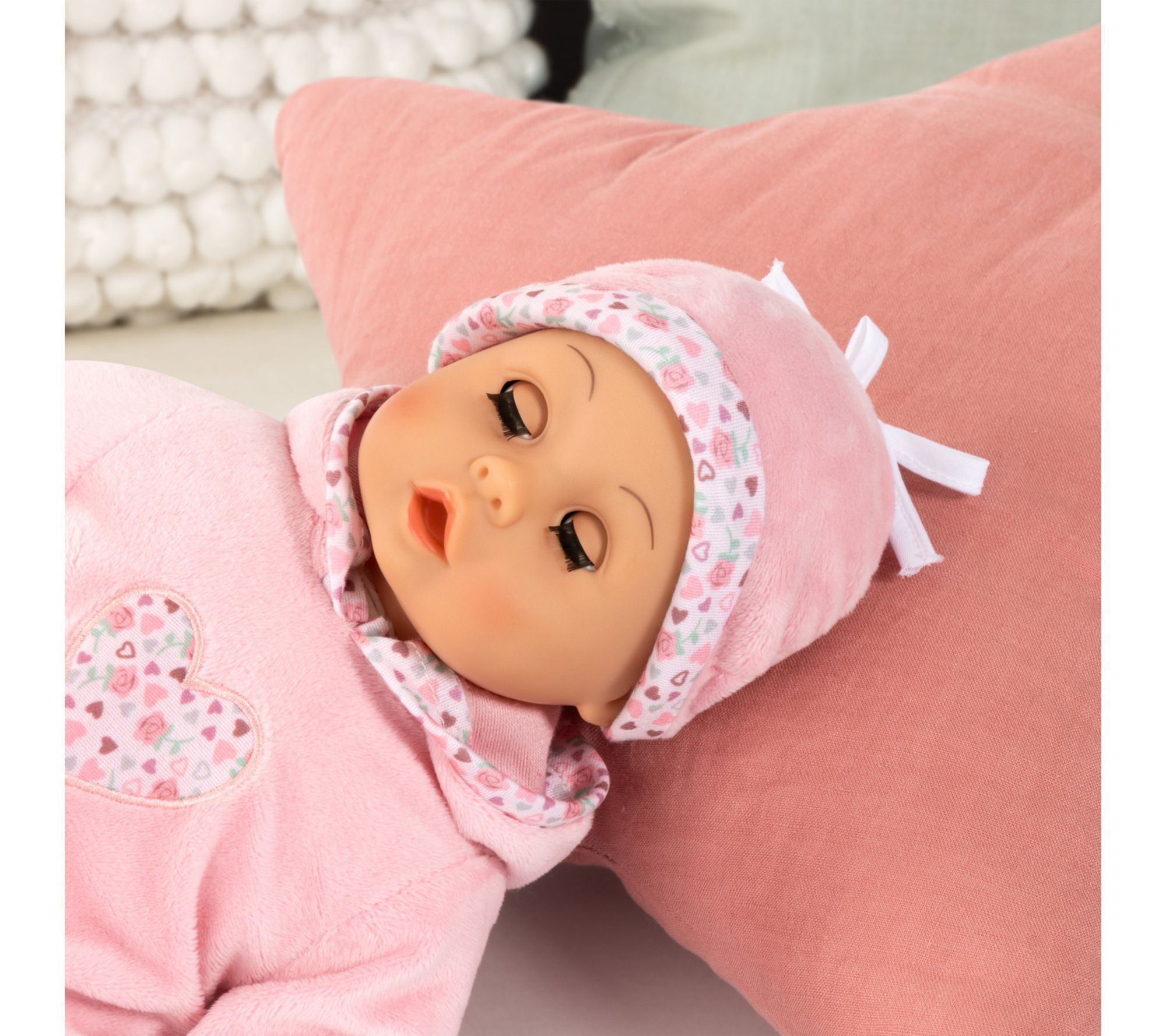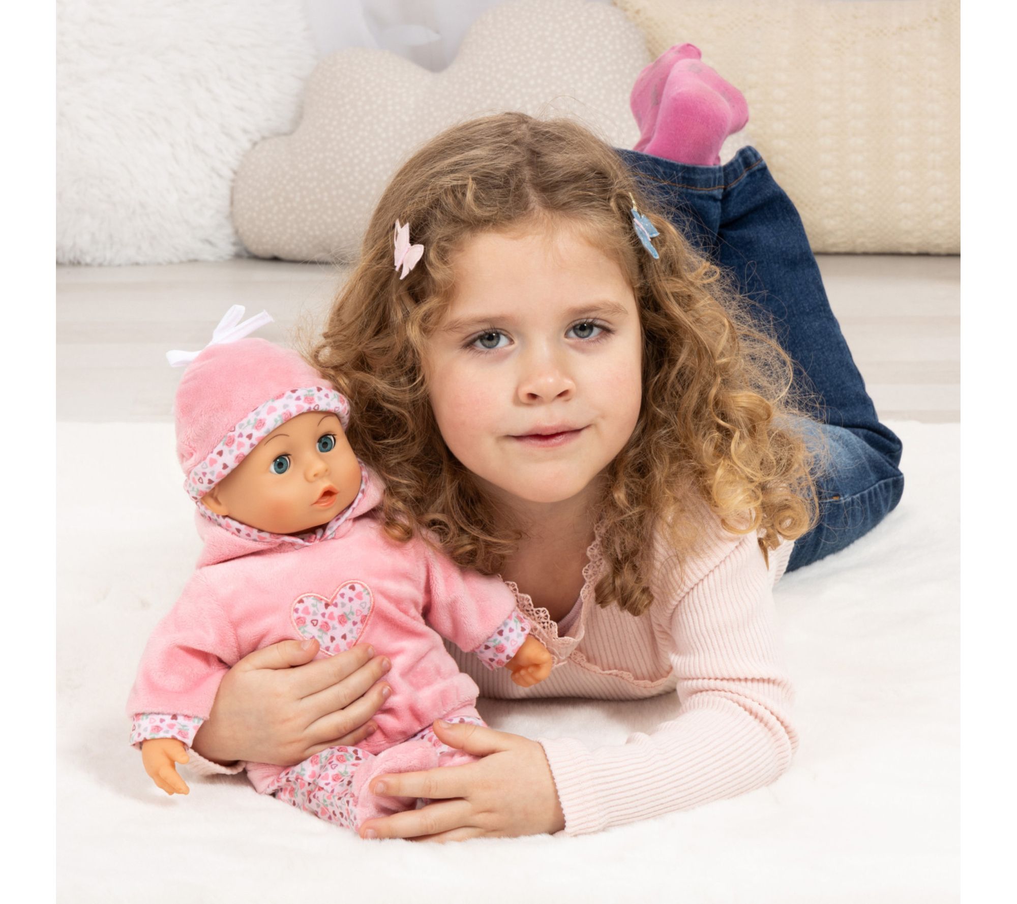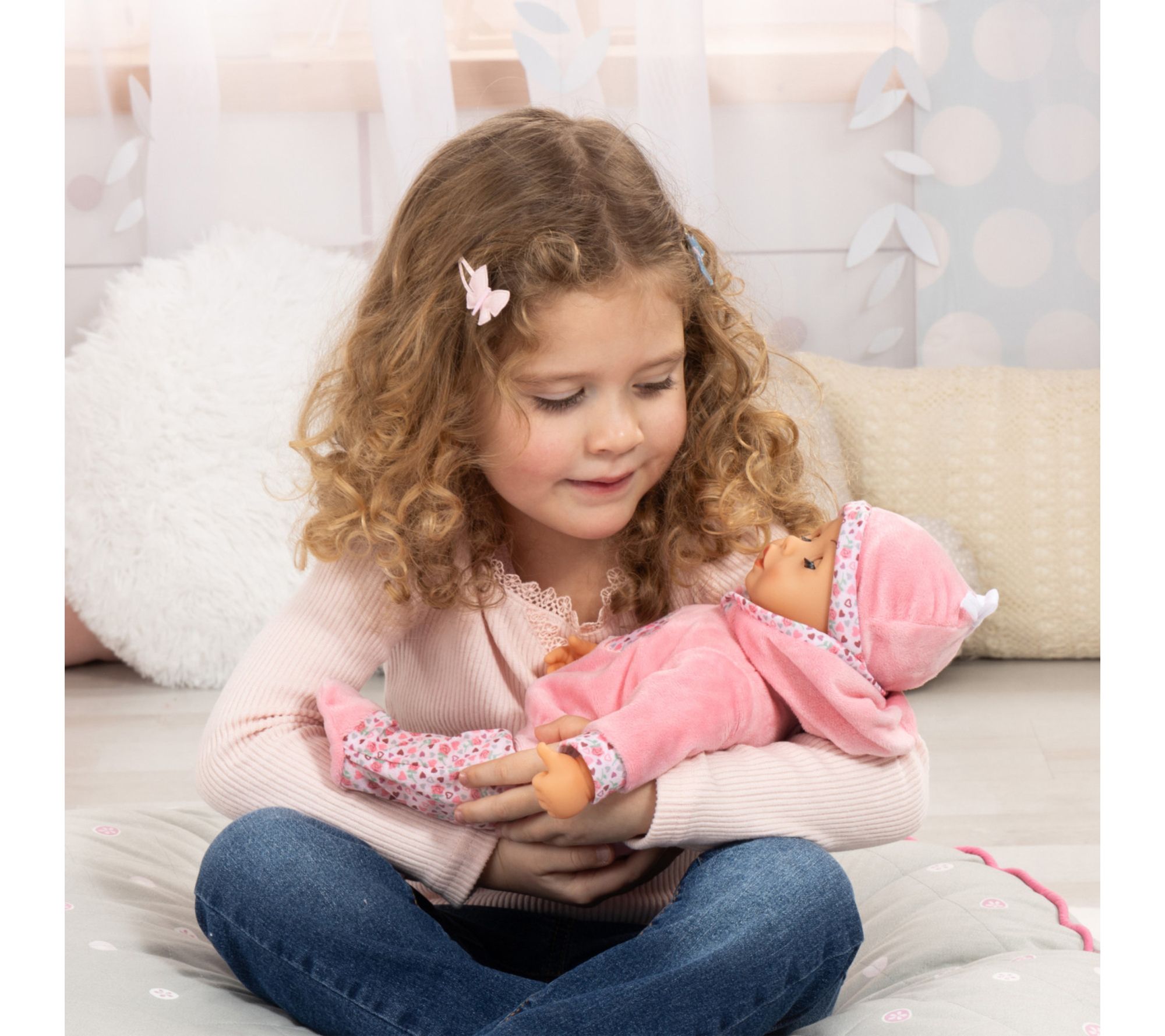 Little ones can practice nurturing play with this soft-bodied doll, designed for cuddles and realistic role-play. Her expressive sleeping eyes, gentle smile, and lifelike baby sounds create engaging moments, encouraging empathy and storytelling as children feed, comfort, and care for her with the included pacifier and bottle. From Bayer Design.
