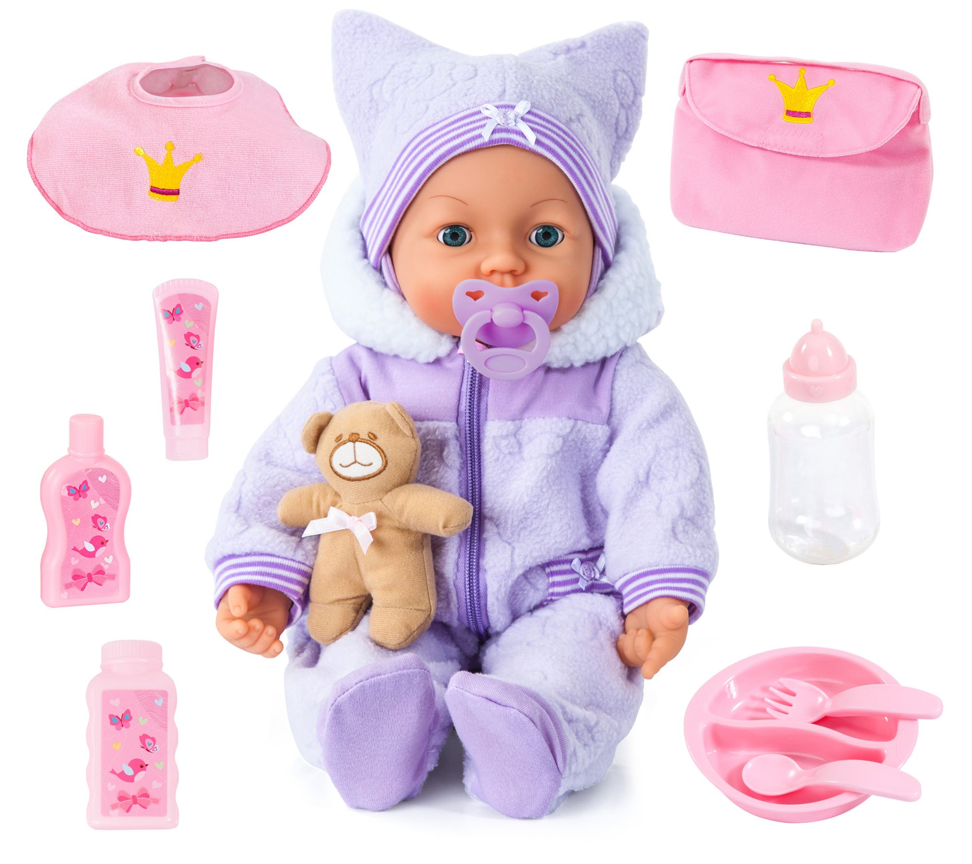 • Includes 18" doll, one extra bag, one bib, one teddy bear, one plastic tableware, one care accessories, one pacifier, and one bottle