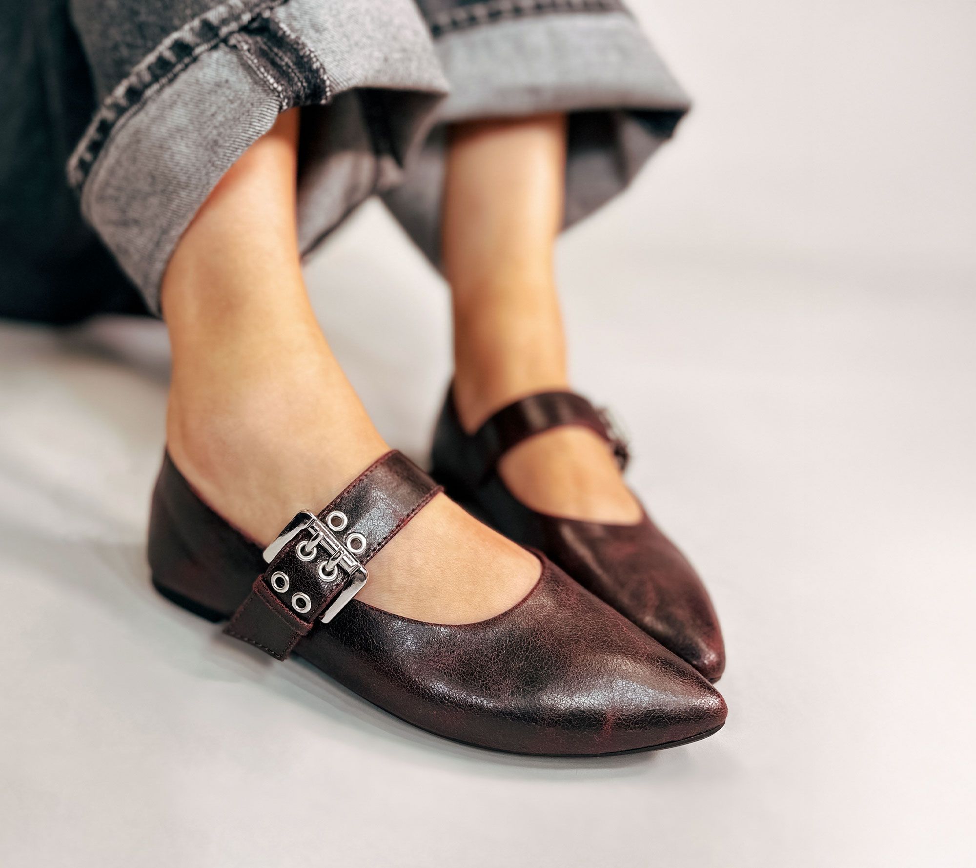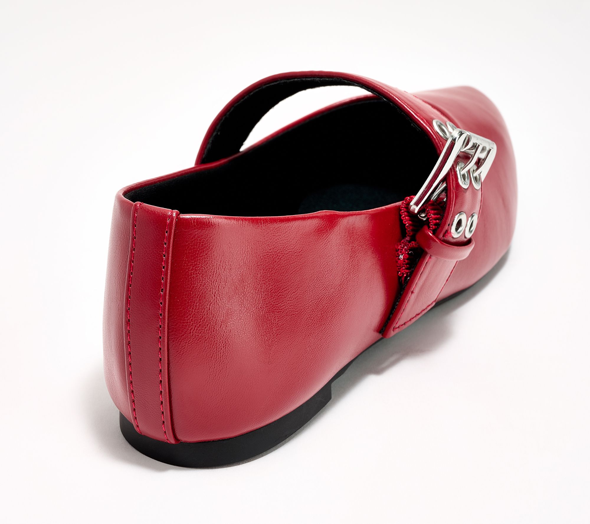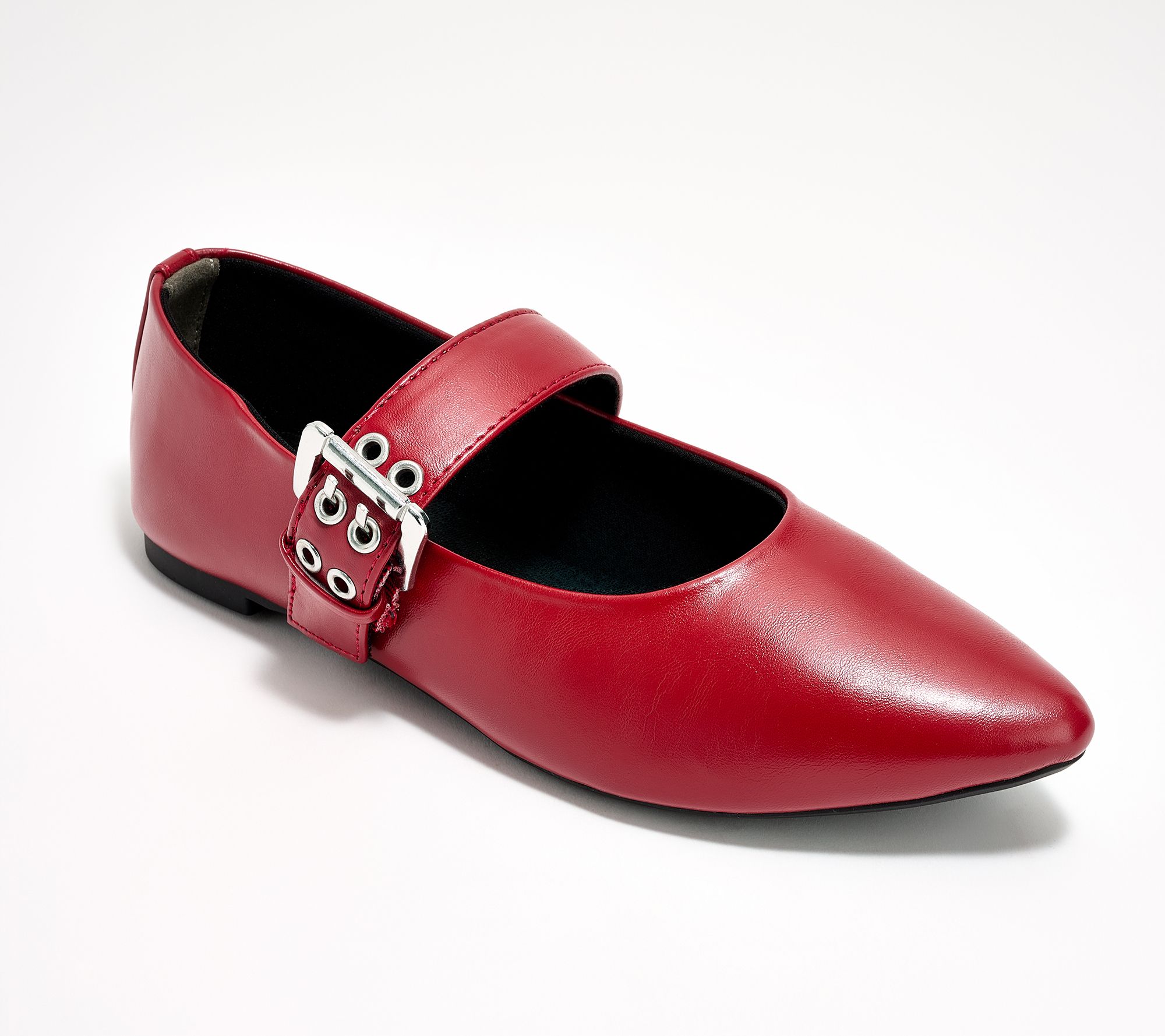 Mary-Jane design, grommeted strap with buckle closure, almond-shaped/pointed toe