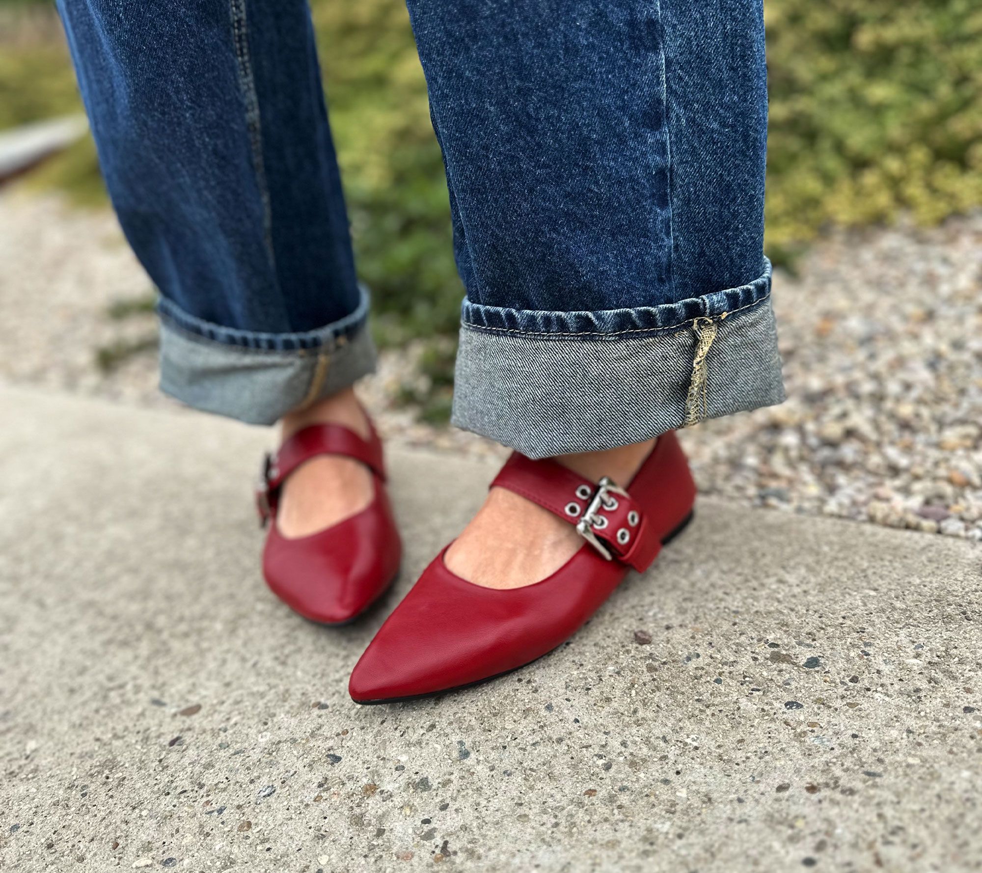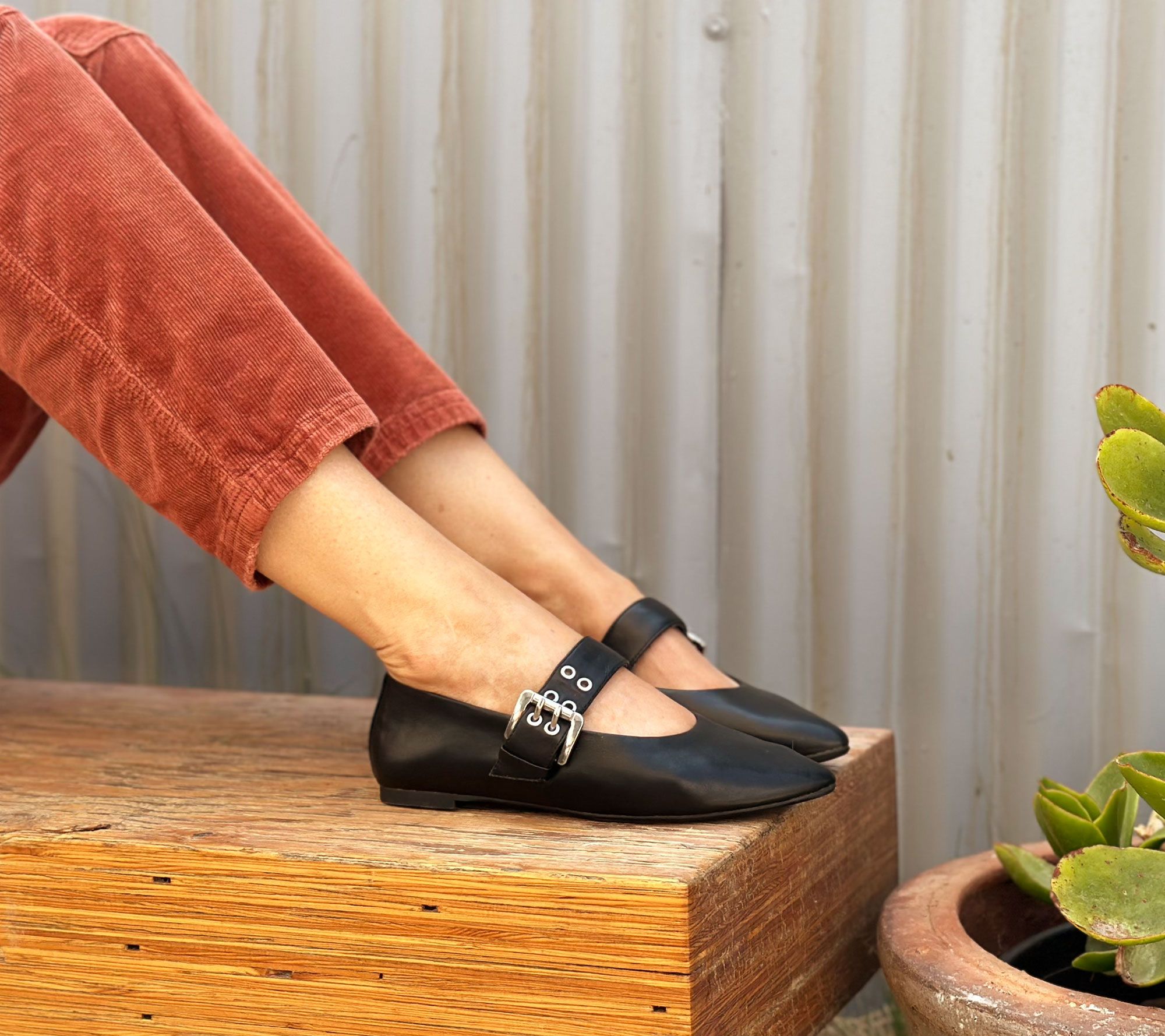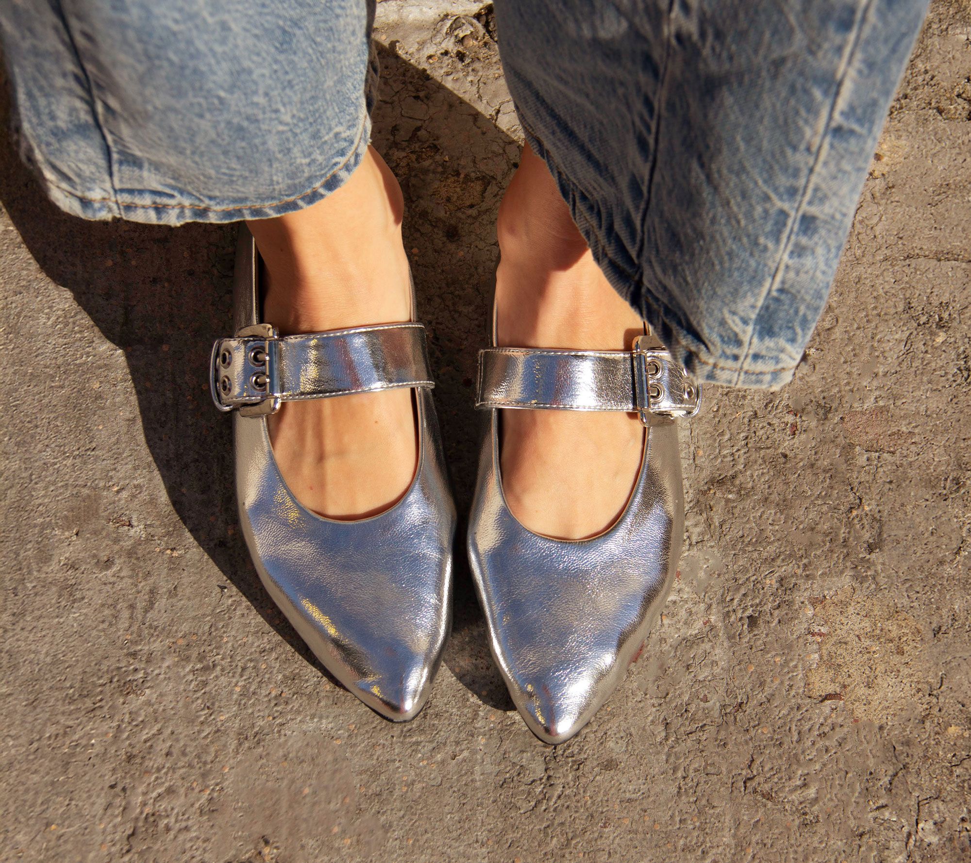 Mary-Jane design, grommeted strap with buckle closure, almond-shaped/pointed toe
