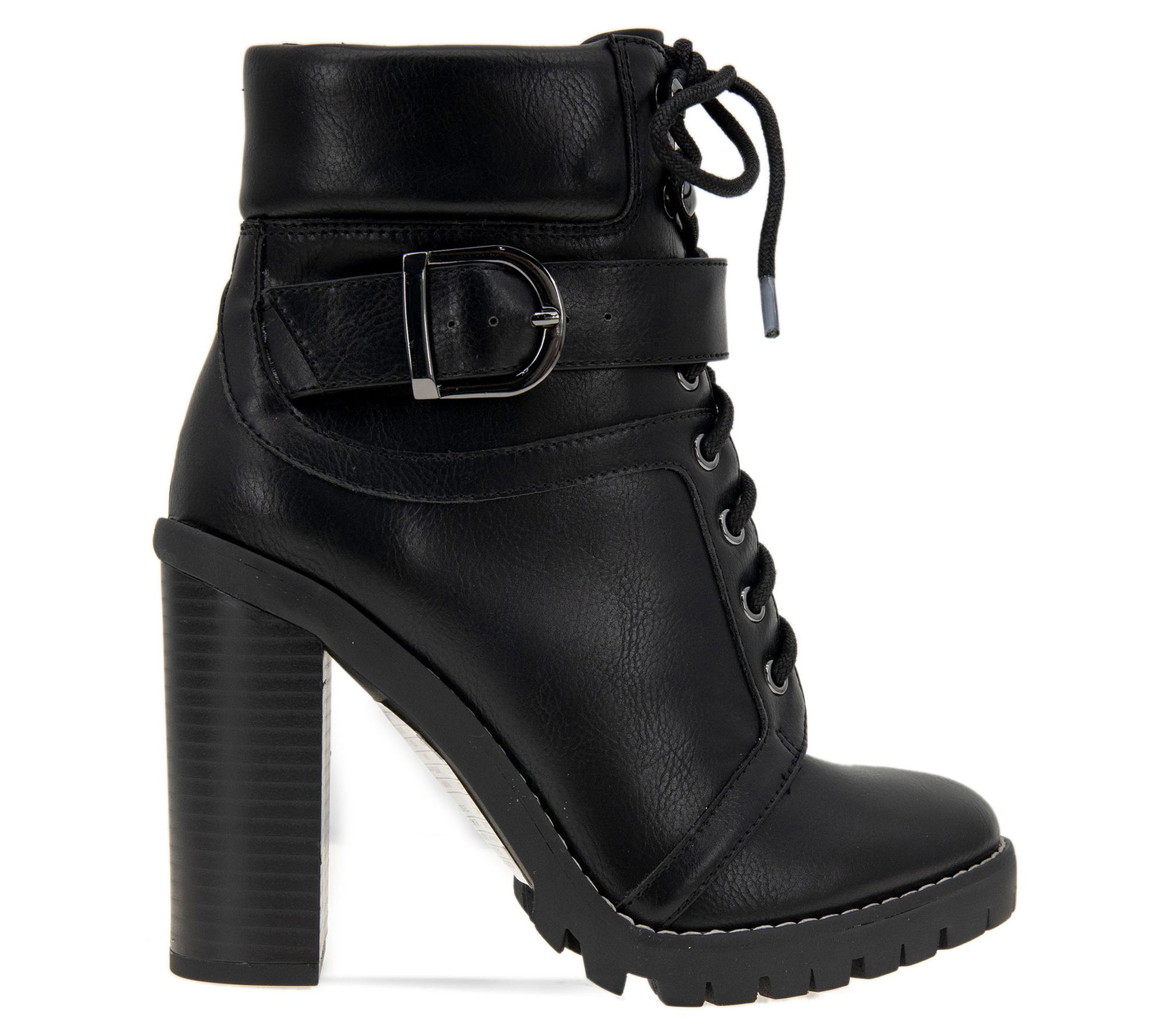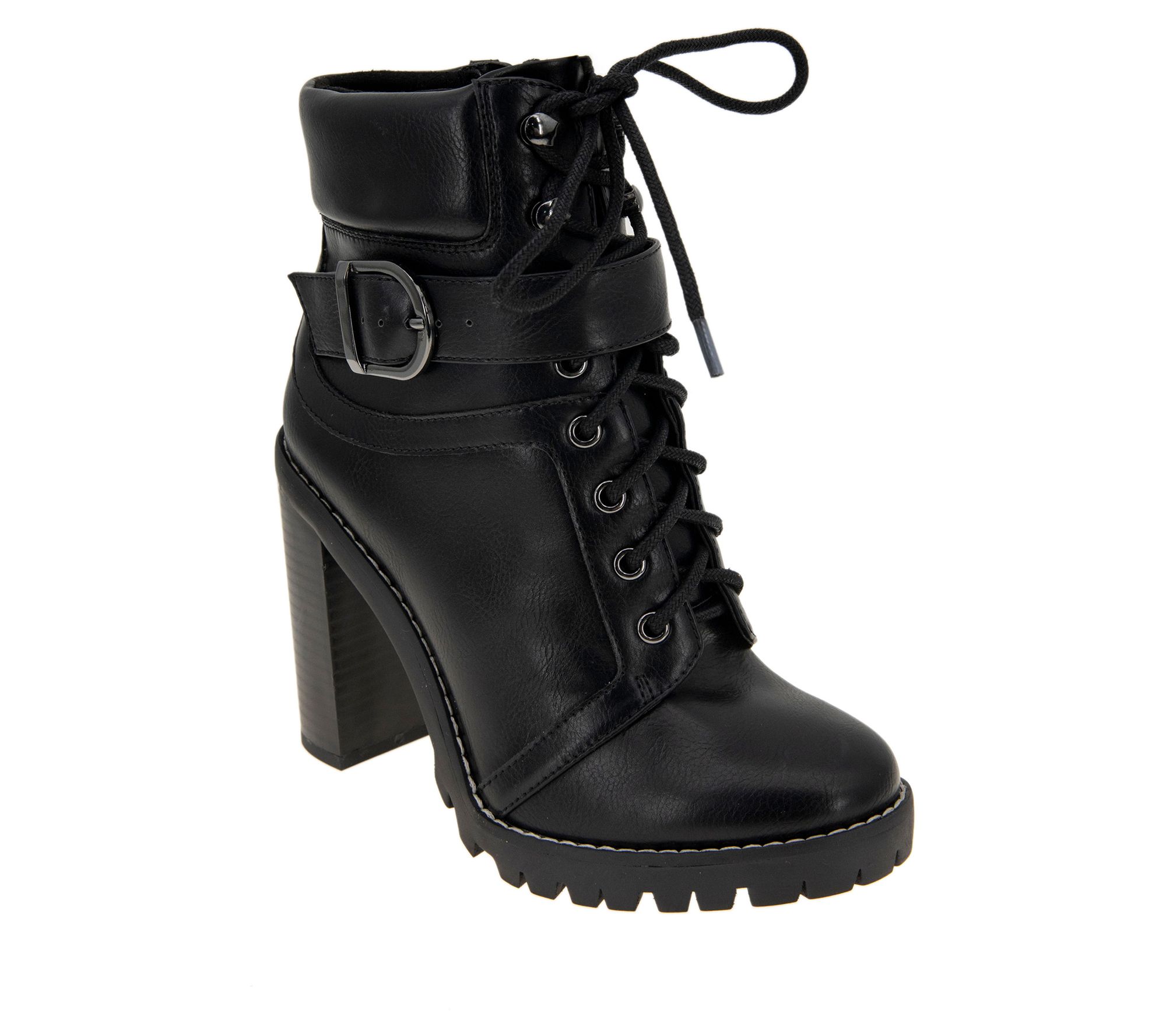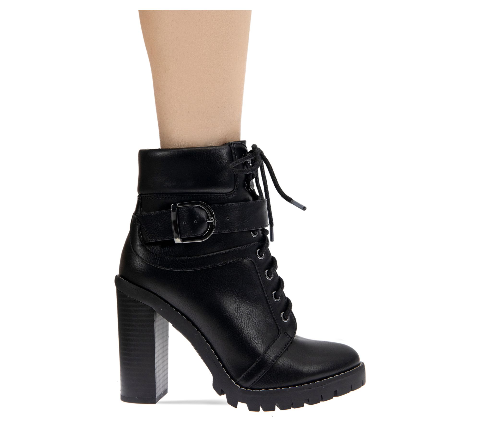 Metallic buckles bring modern style to these Padina booties set on a lug platform and chunky heel. From BCBGeneration.