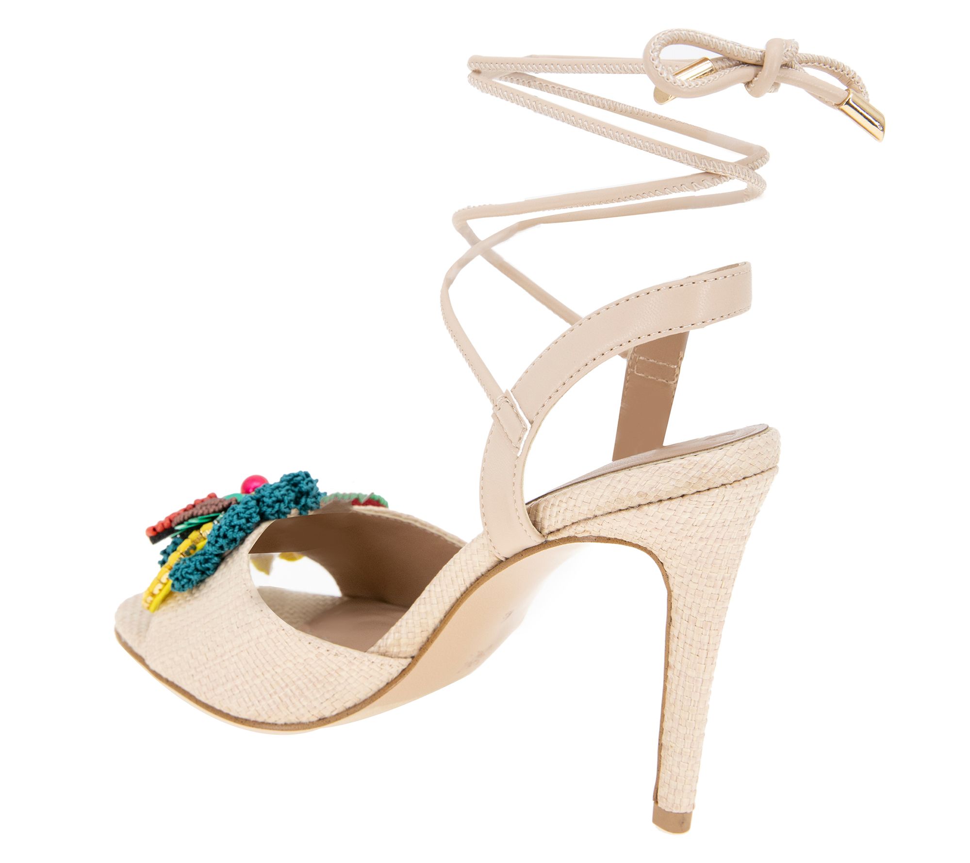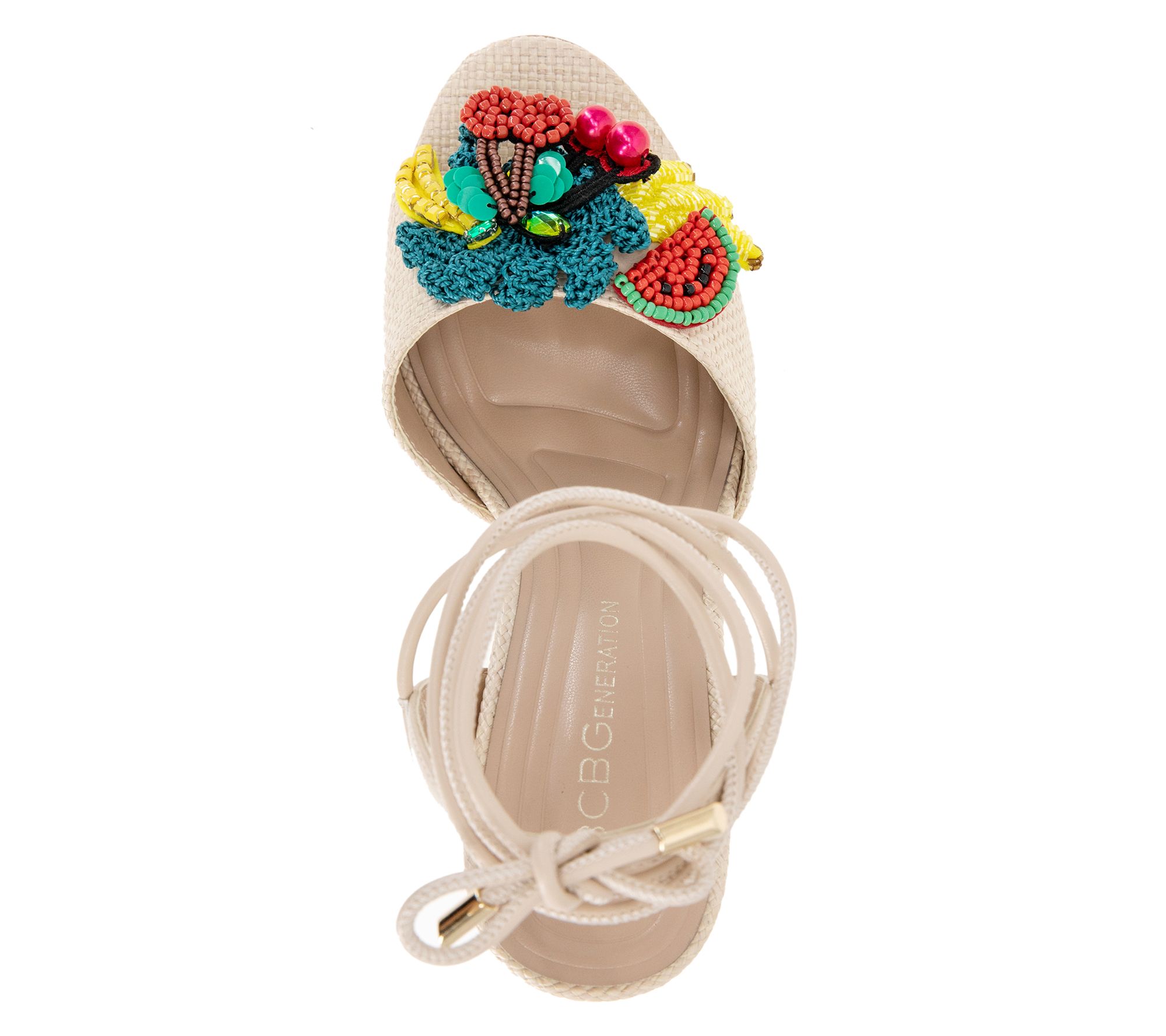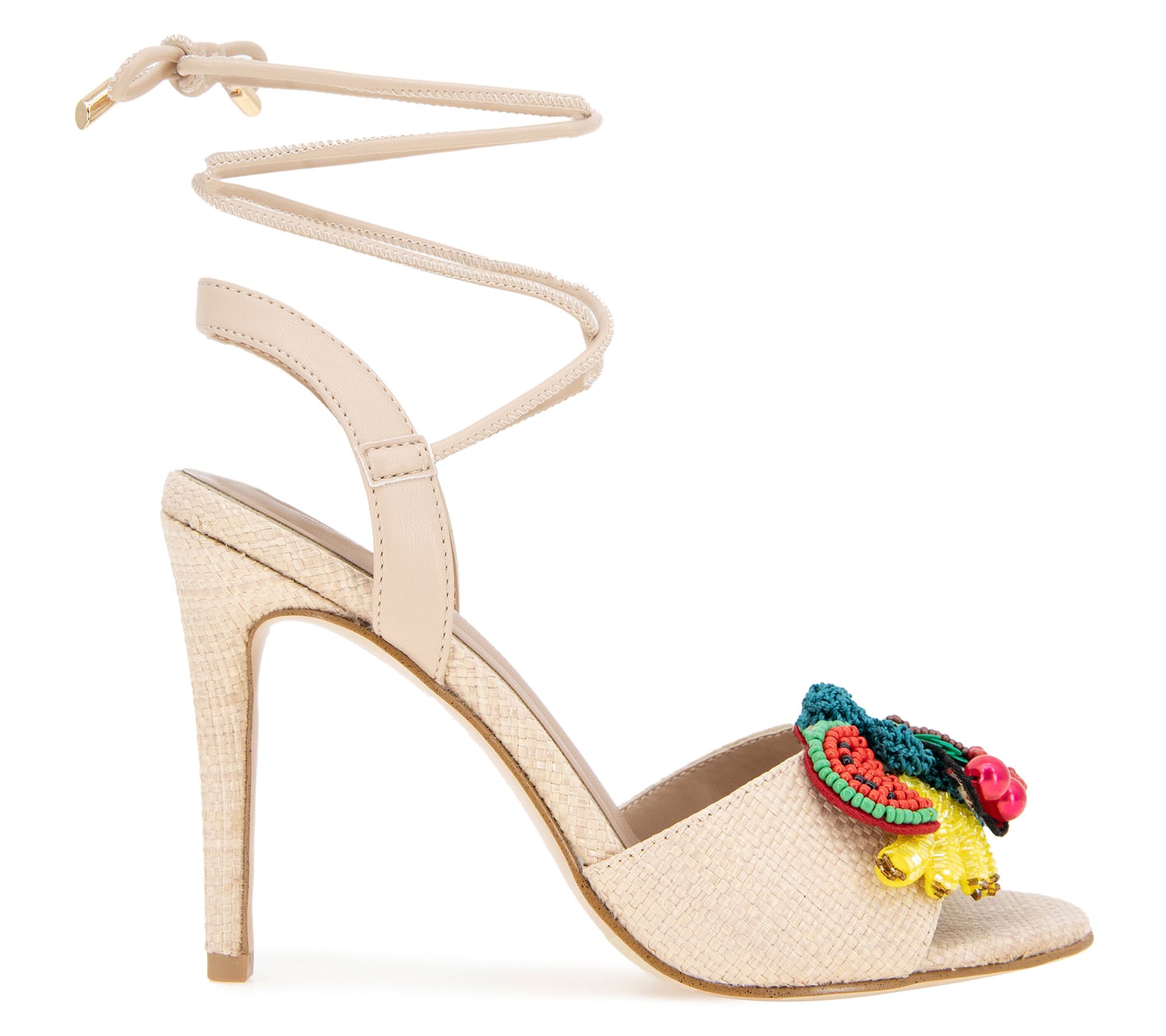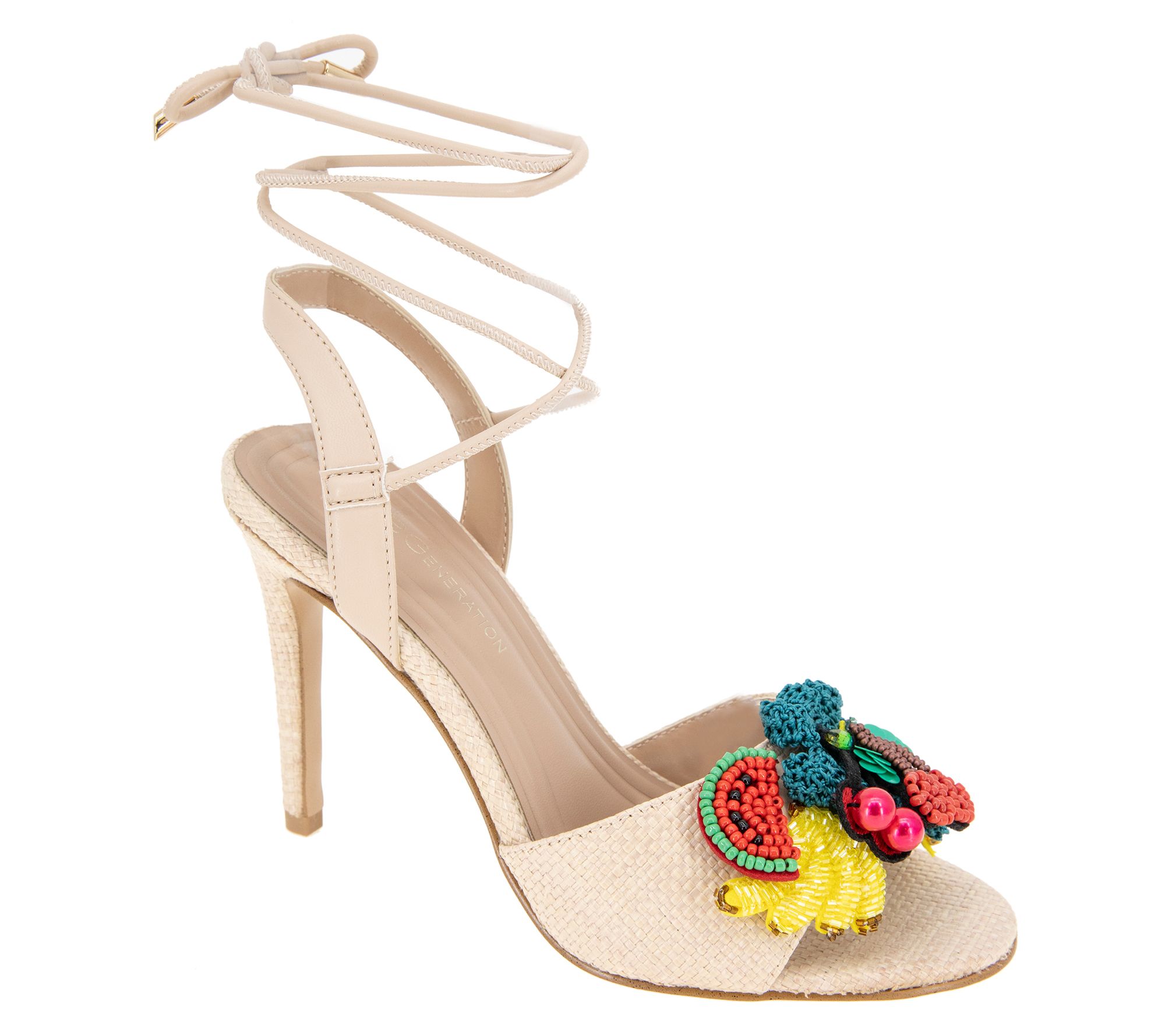Sun-drenched afternoons deserve the playful charm of these embellished sandals. Perfect for a garden brunch, the tie-up strap adds a whimsical touch as colorful fruit decorates each sandal. This pair's alluring design and rounded toe allow for effortless movement, making it an ideal choice for spring and summer gatherings. Step into a world full of lively details that refresh your footwear collection with a burst of sunny optimism. From BCBGeneration.