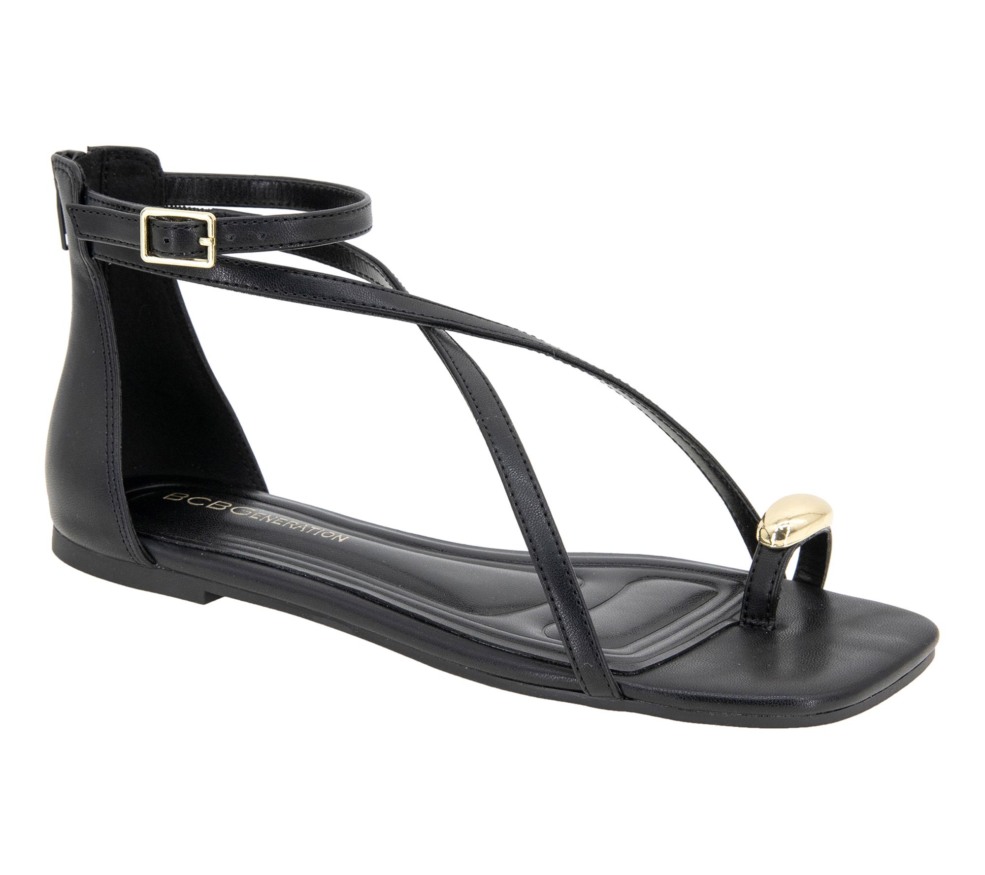 Warm weekends call for a go-to sandal that combines style with simplicity. Slip into the BCBGeneration Kline flat sandal for a chic look featuring a criss-cross strappy upper and a metallic toe ring. Perfect for brunches, summer strolls, or beach escapes, these sandals add a touch of elegance to any casual outfit. From BCBGeneration.