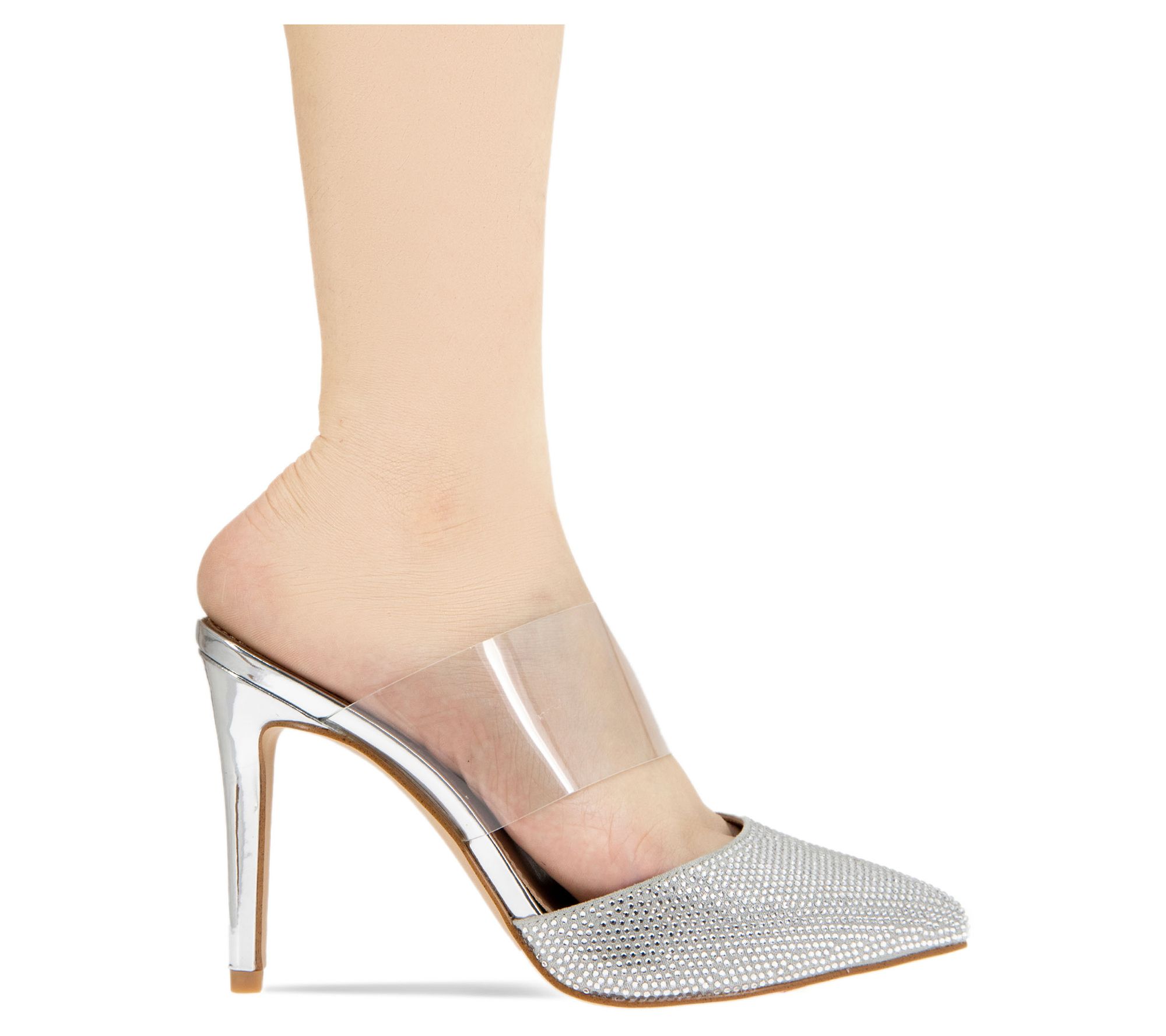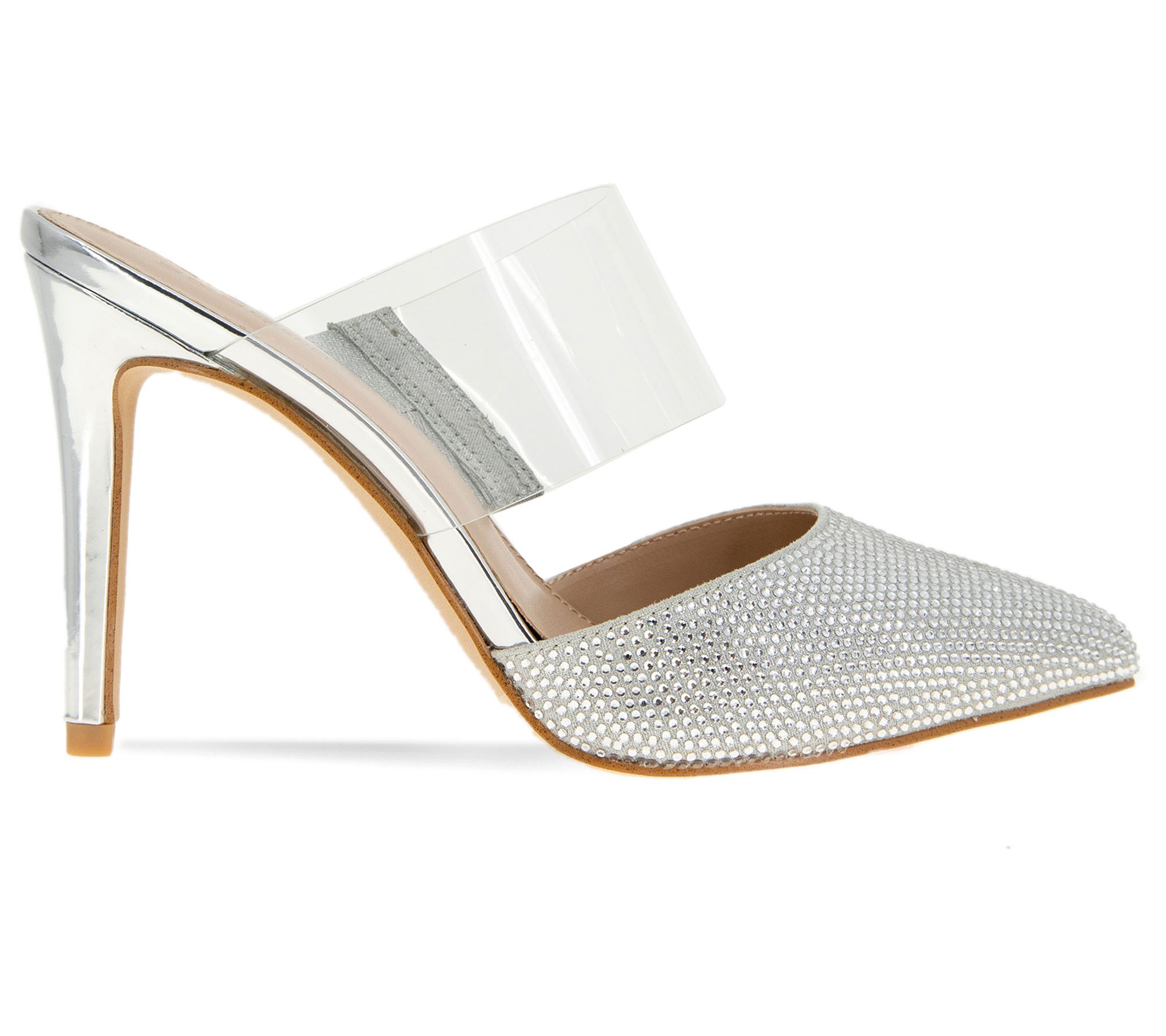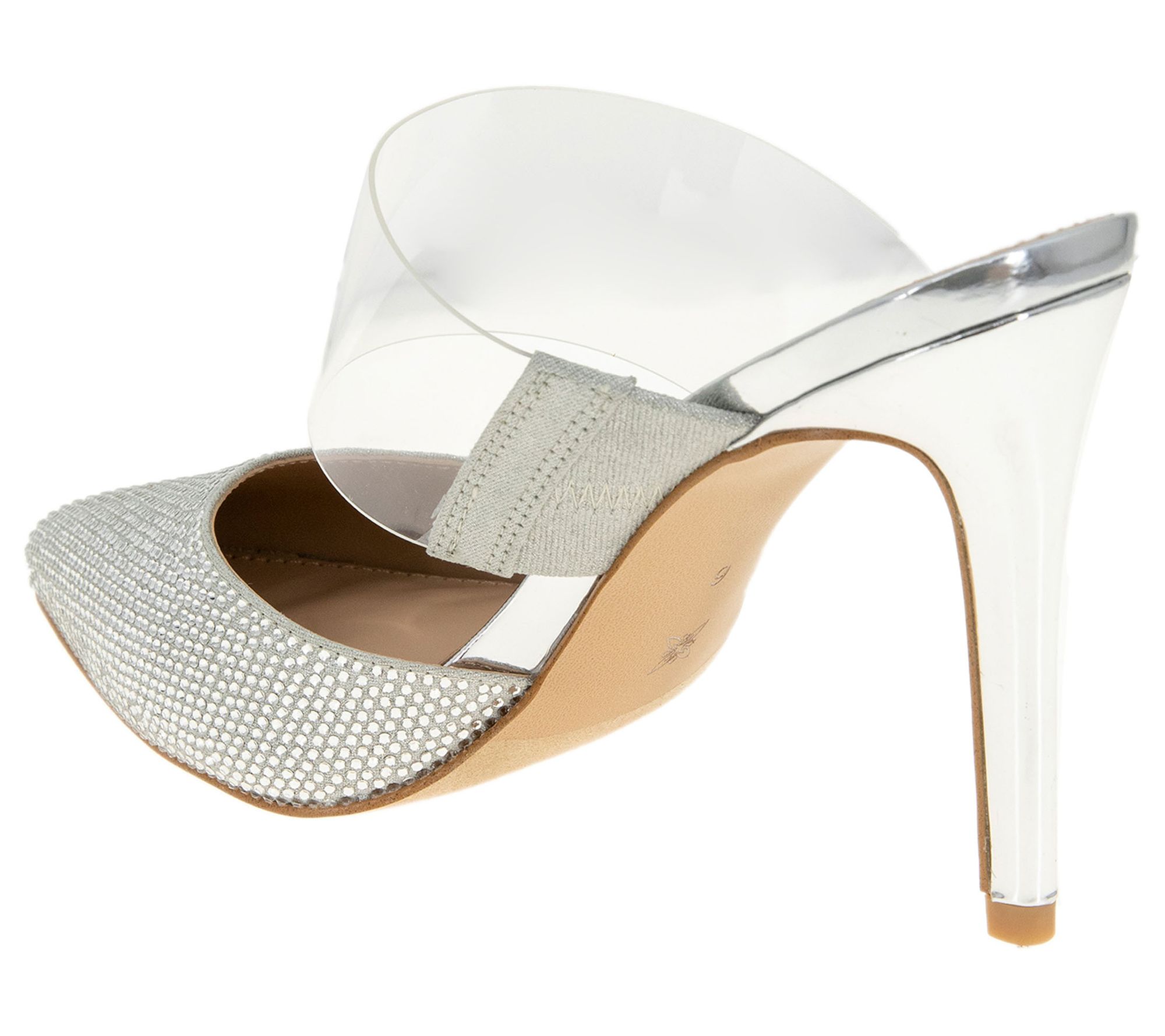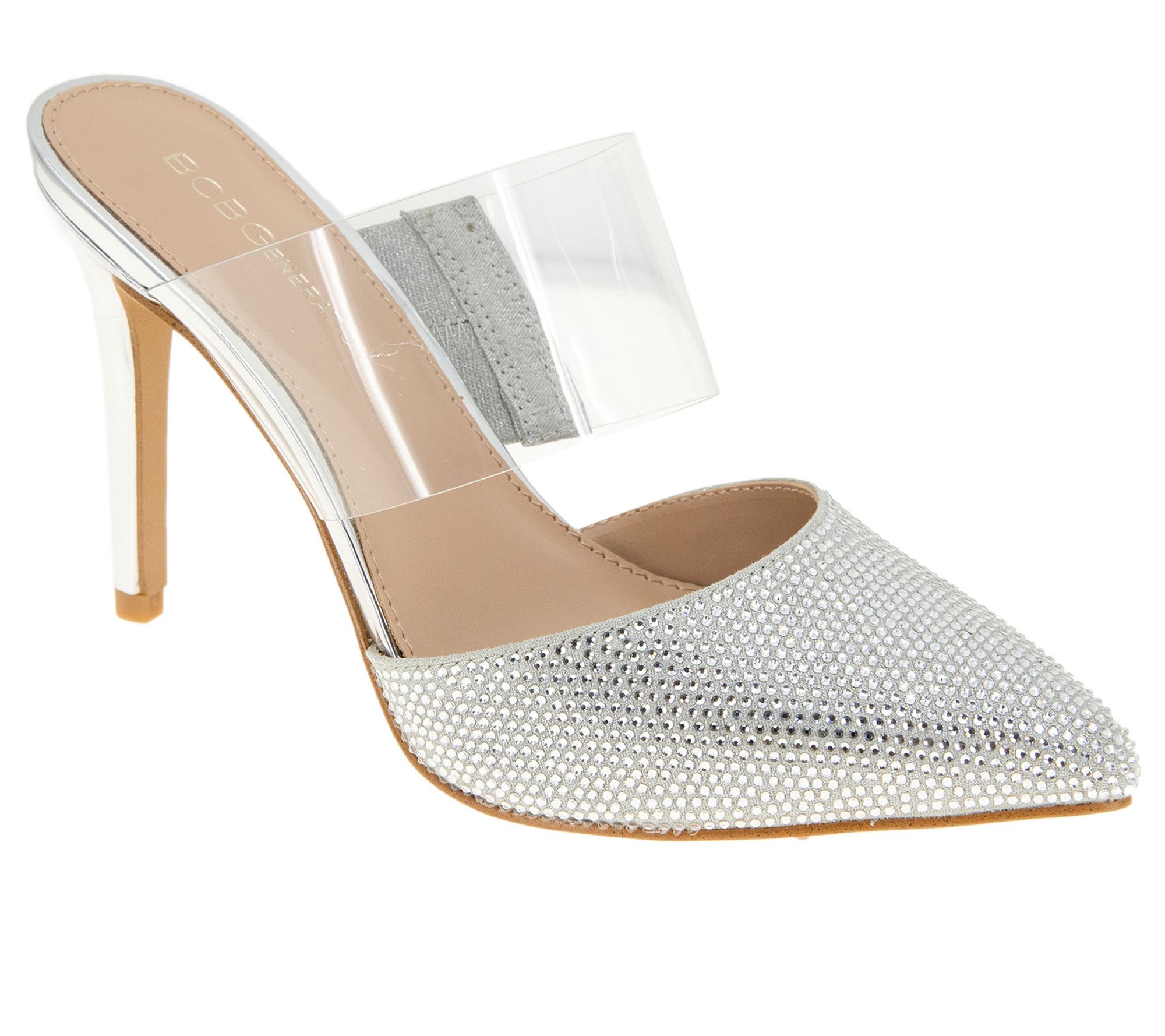 Put a little sparkle in your step with these sleek pointed-toe mules sporting clear-strap accents and a shimmering metallic finish. From BCBGeneration.