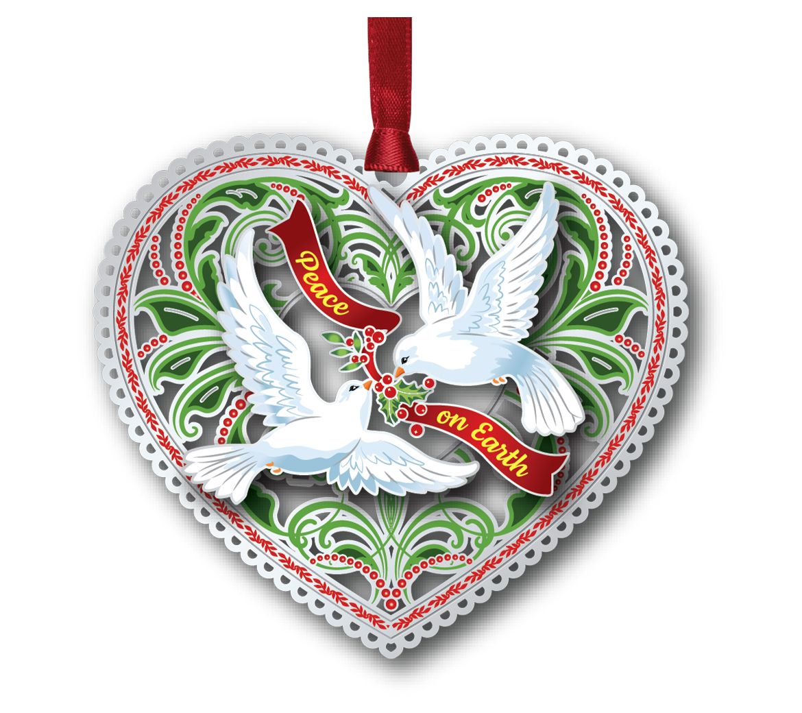 Add a beautiful touch of peace to your home during the holiday season with this heart-shaped ornament, showcasing a pair of doves and a sweet sentiment. From Beacon Designs.