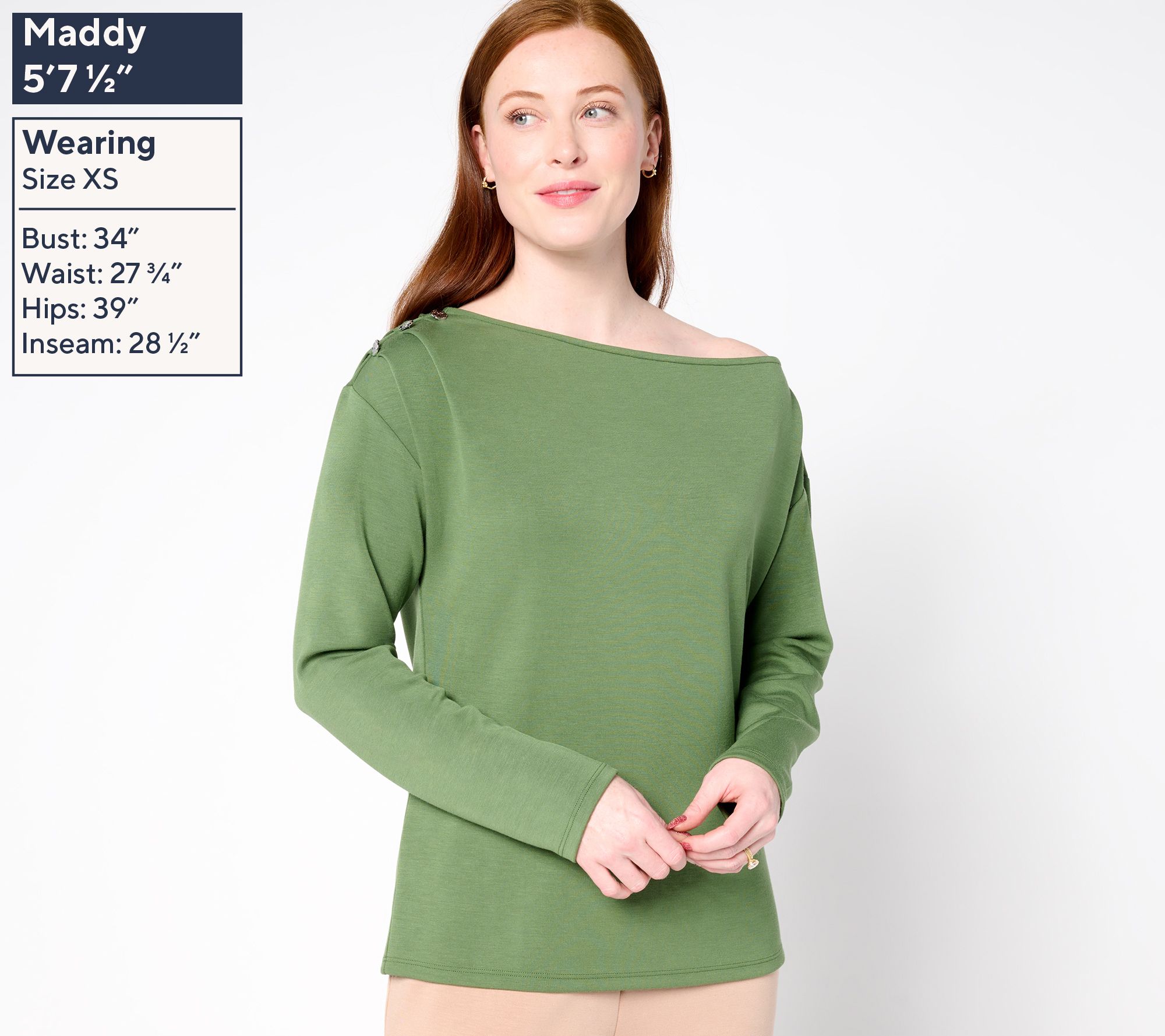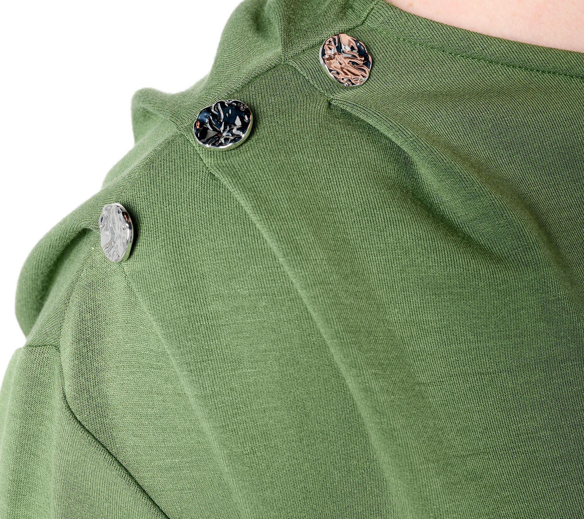 Features: finished boat neckline with interior binding, one drop shoulder, one shoulder with decorative gathering and buttons, clean finished back hem with double needle top stitch