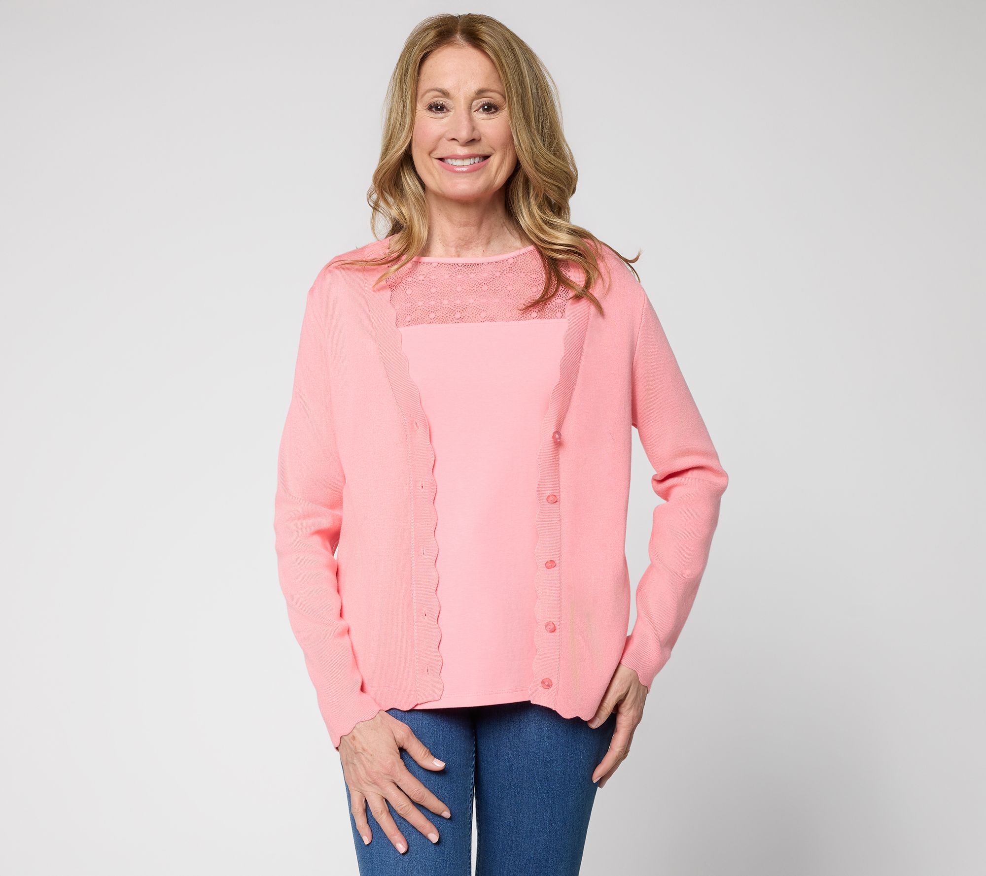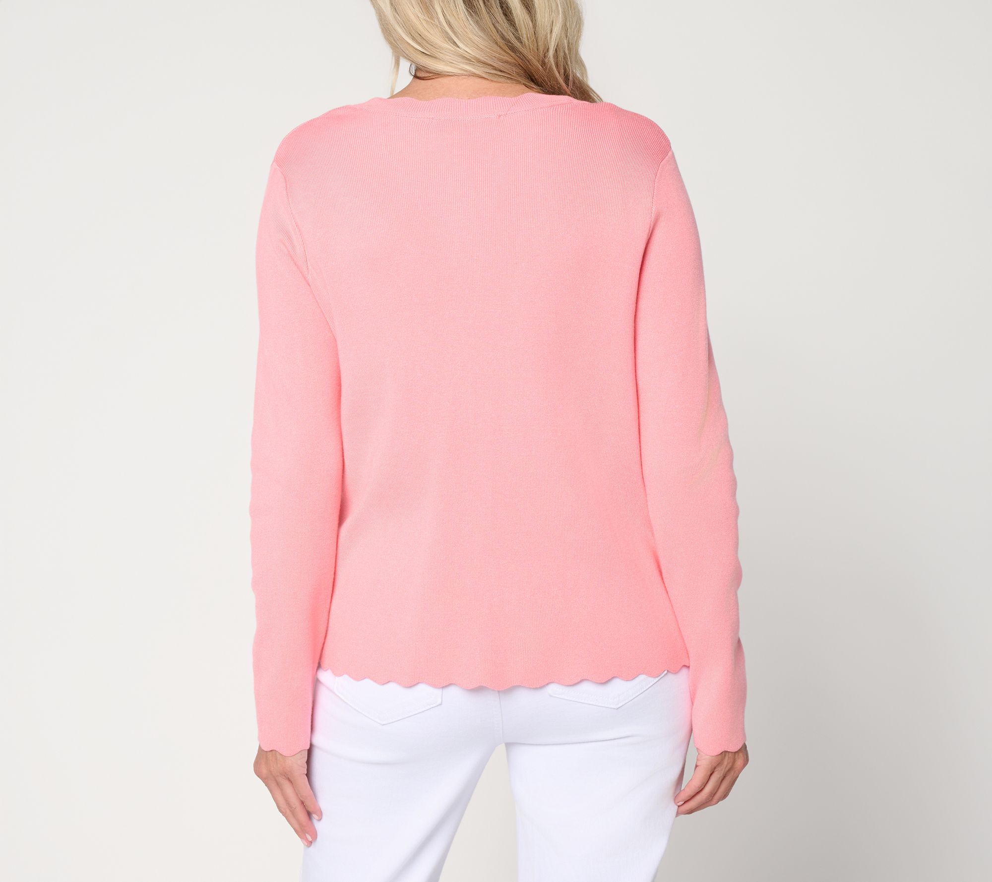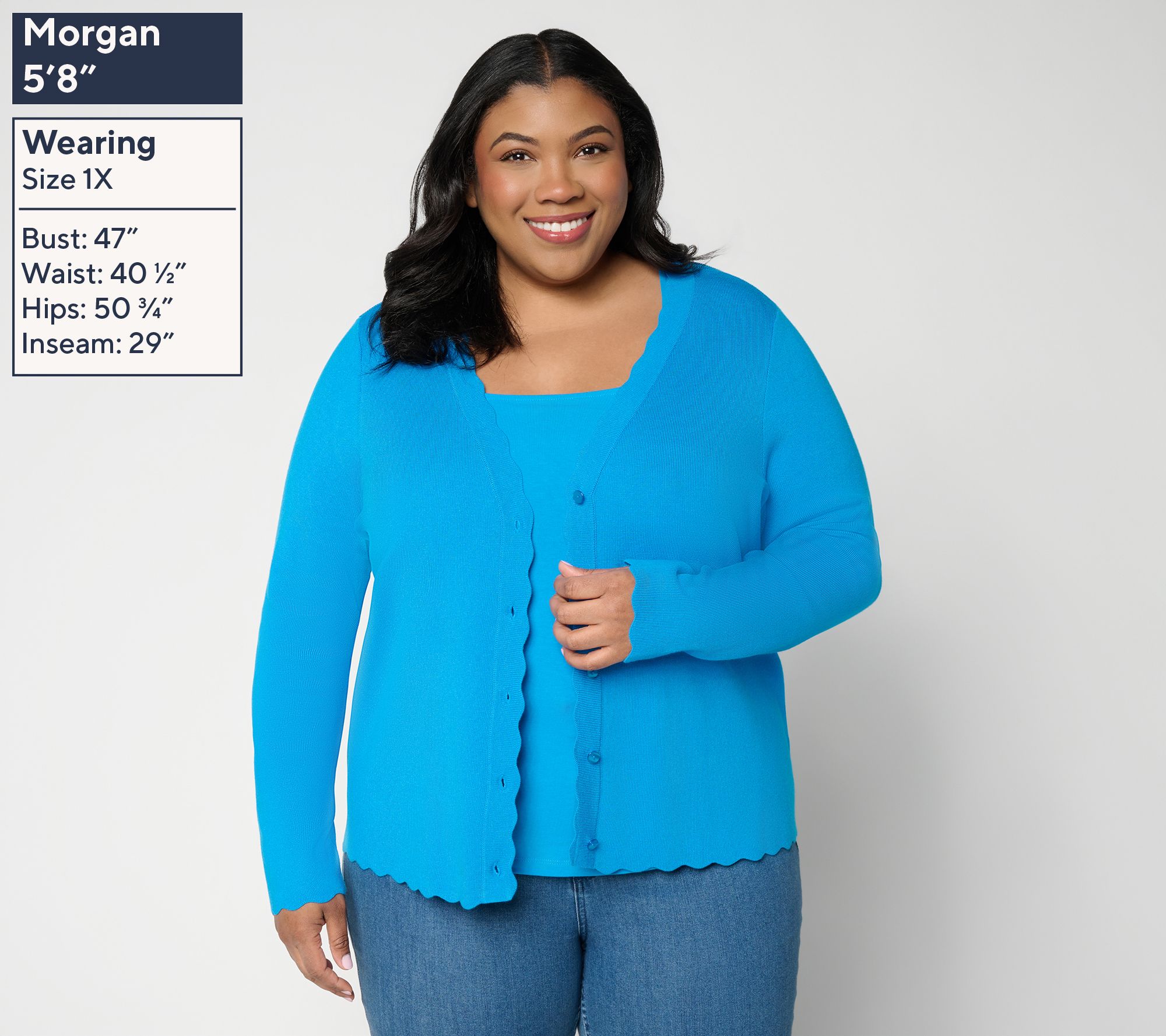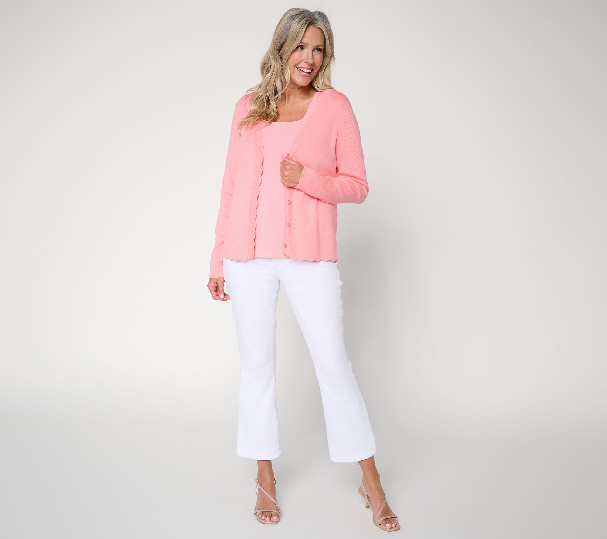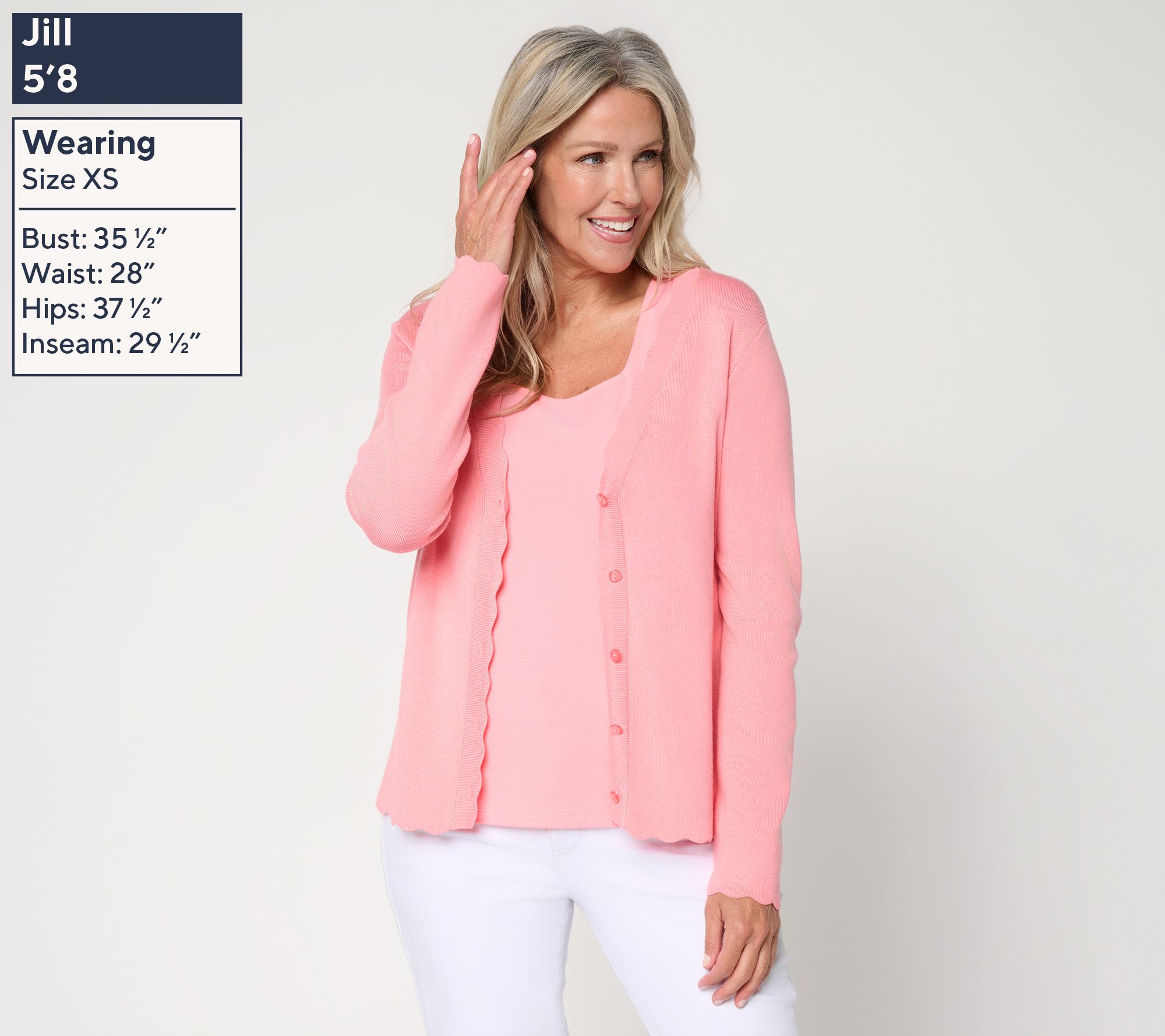 Style meets comfort as you reach for this cardigan sweater -- the ideal choice for relaxed brunches or a busy day at the office. Its semi-fitted silhouette and scallop-edged neckline add subtle elegance, while button-front styling makes layering effortless. From BEAUTIFUL by Lawrence Zarian.