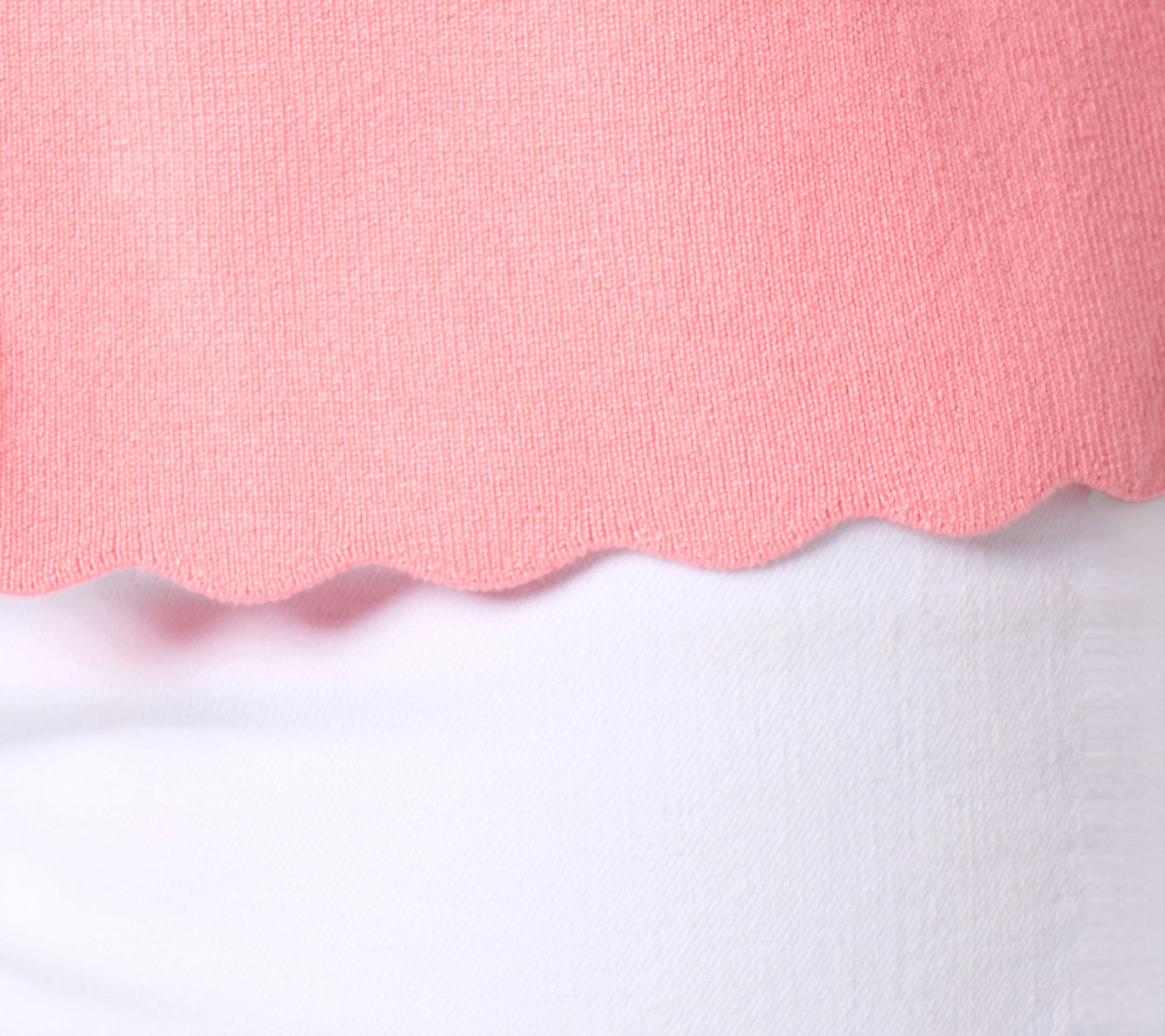 Features: button closure at front placket, V-neckline with scallop shape edge; full needle rib placket