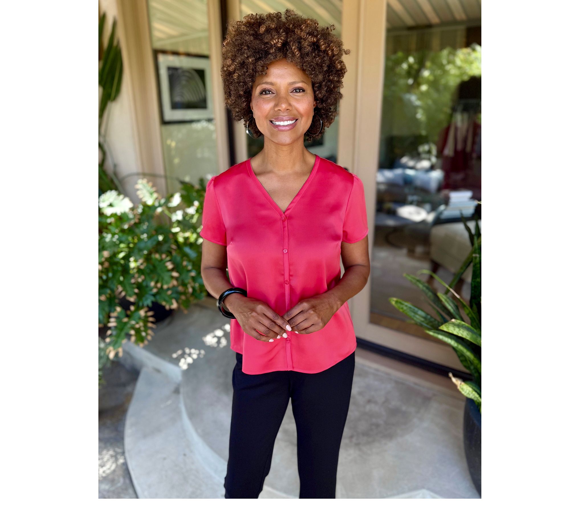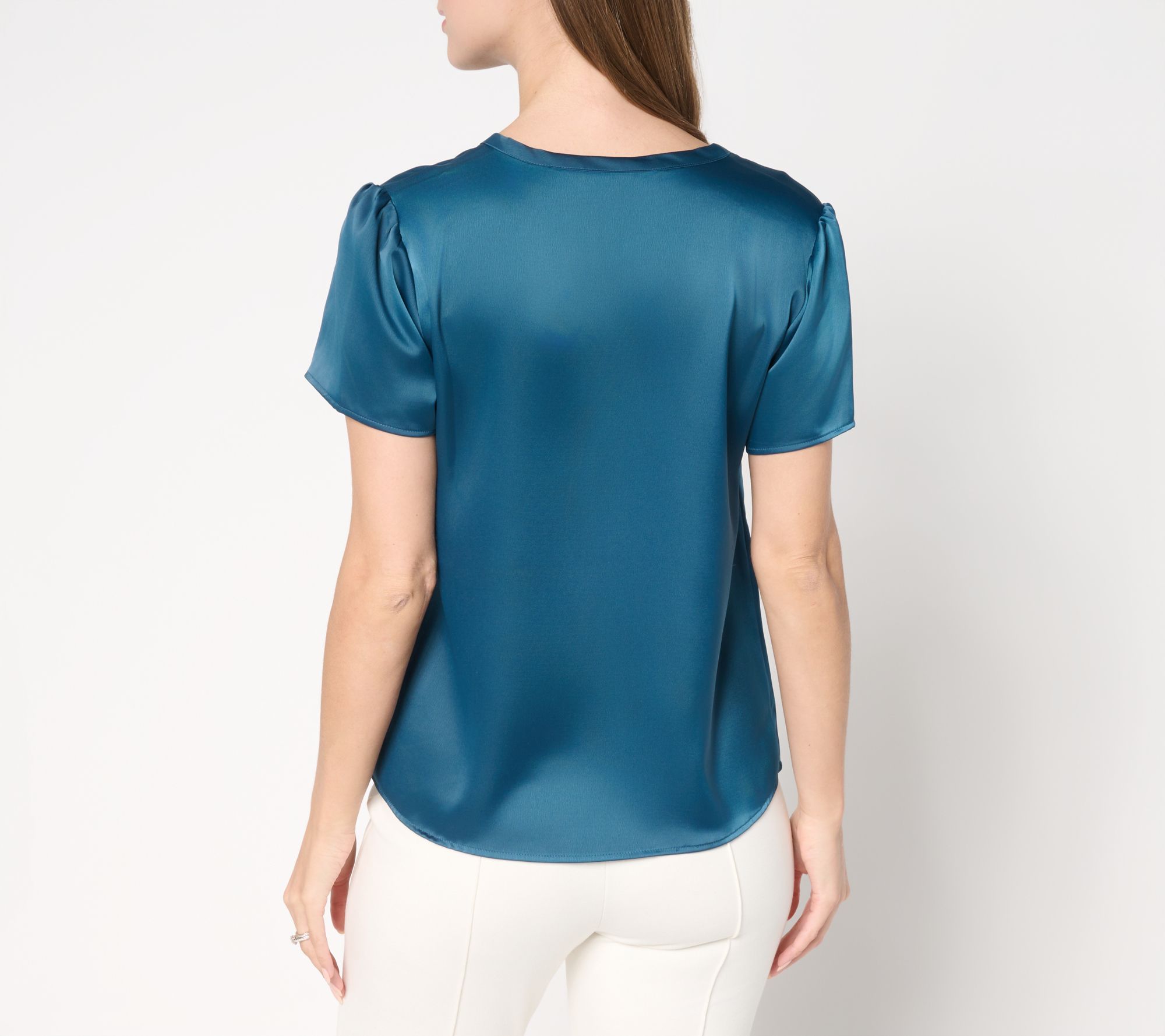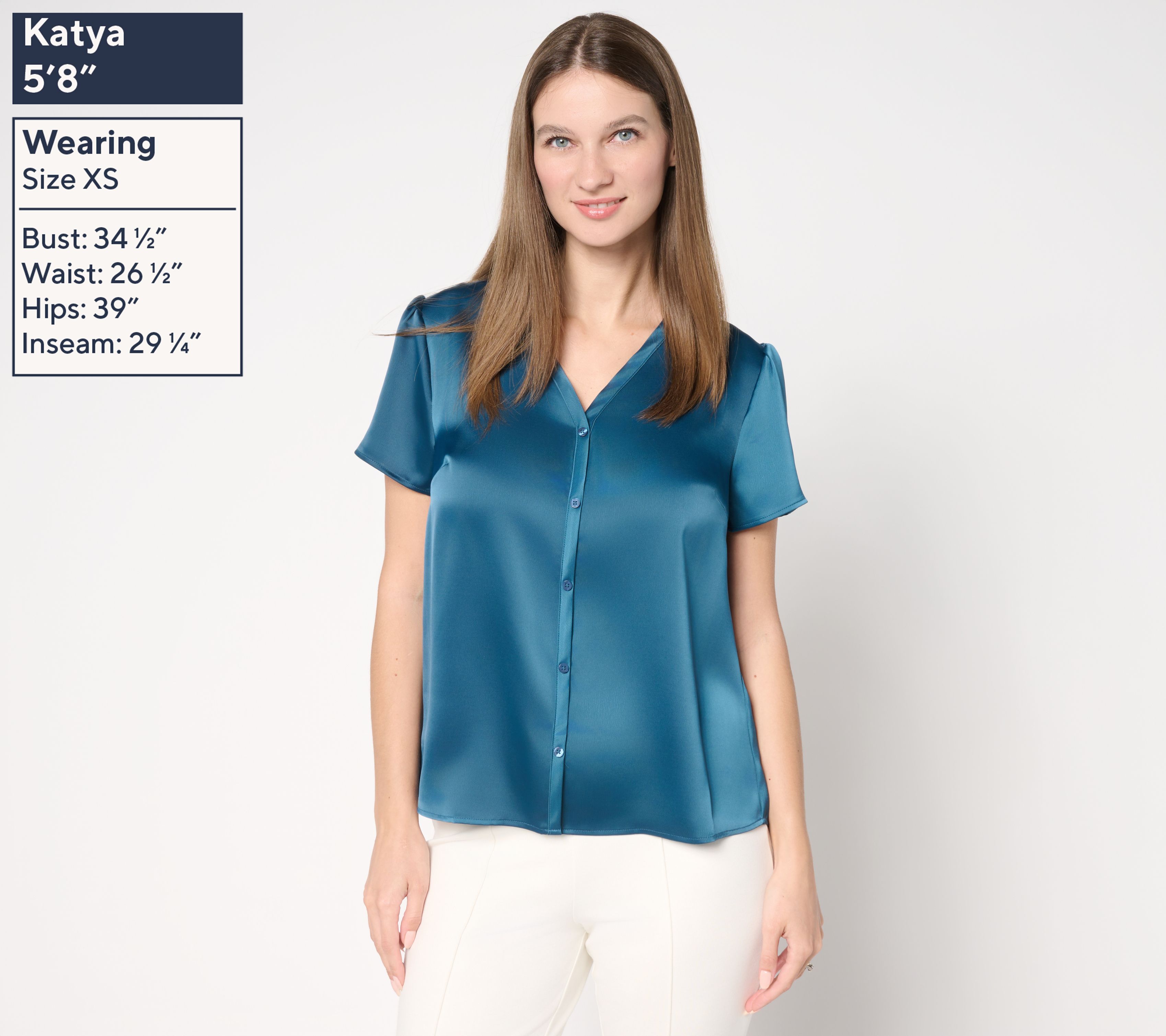Classic, not cumbersome. No more fumbling with buttons to create your next fashion statement. This silky smooth top looks like a classic button down, but there's a secret to the sophisticated look -- those buttons are just for decoration! Whether you're heading to the office or to a lovely lunch with friends, put this top in the mix to make a polished impression every time. From BEAUTIFUL by Lawrence Zarian.