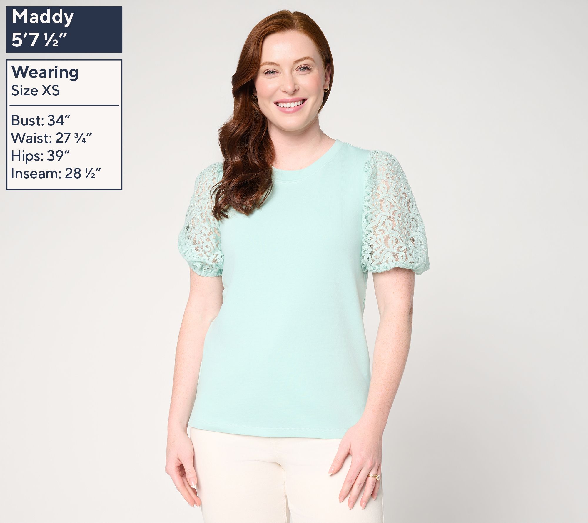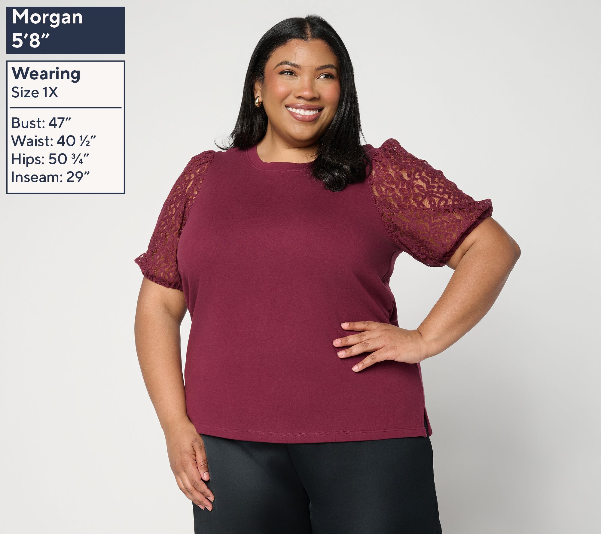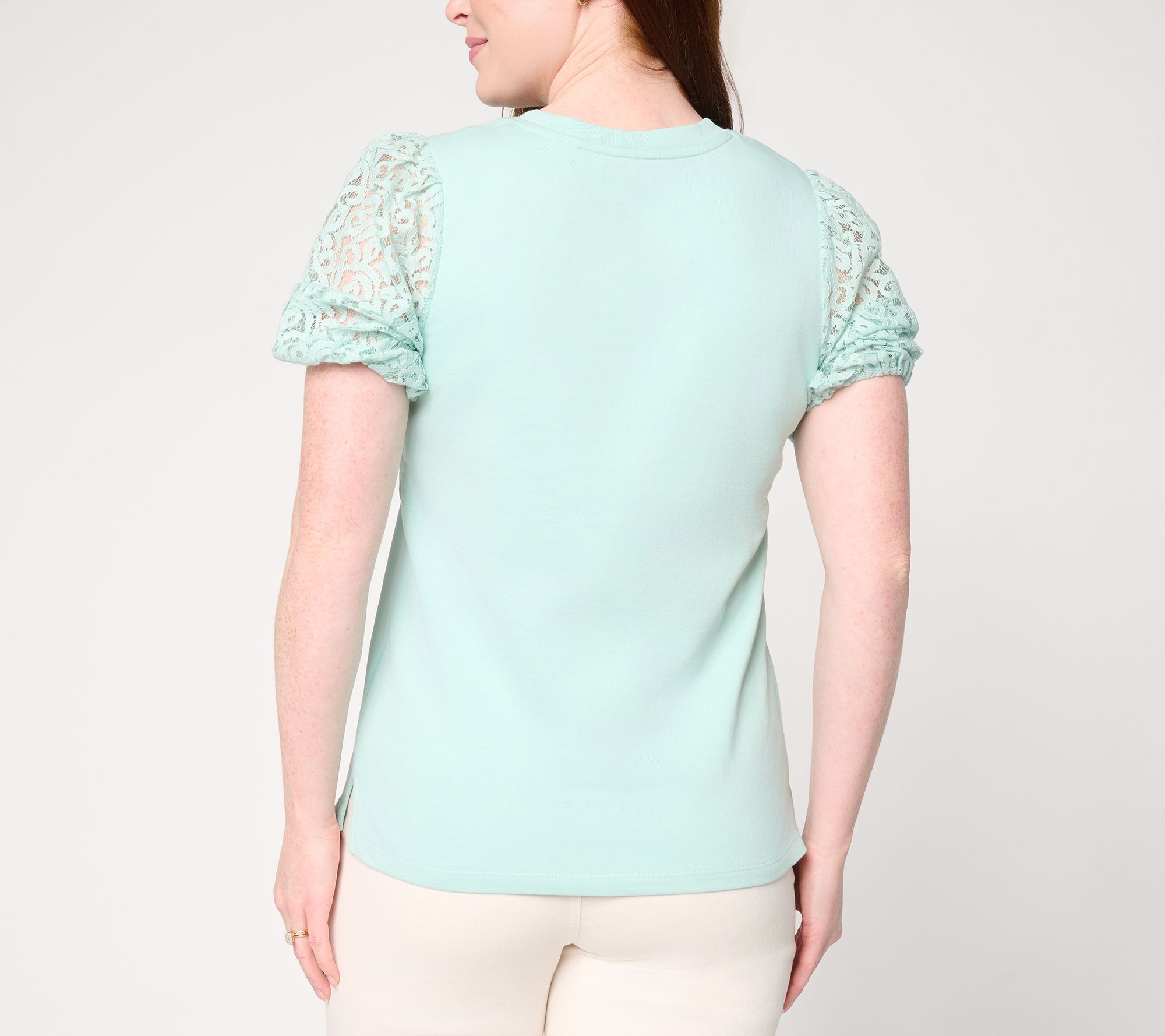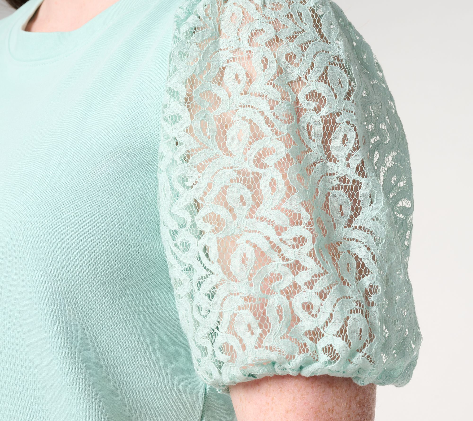 Features: crew neckline, elbow-length sleeves with lace fabric