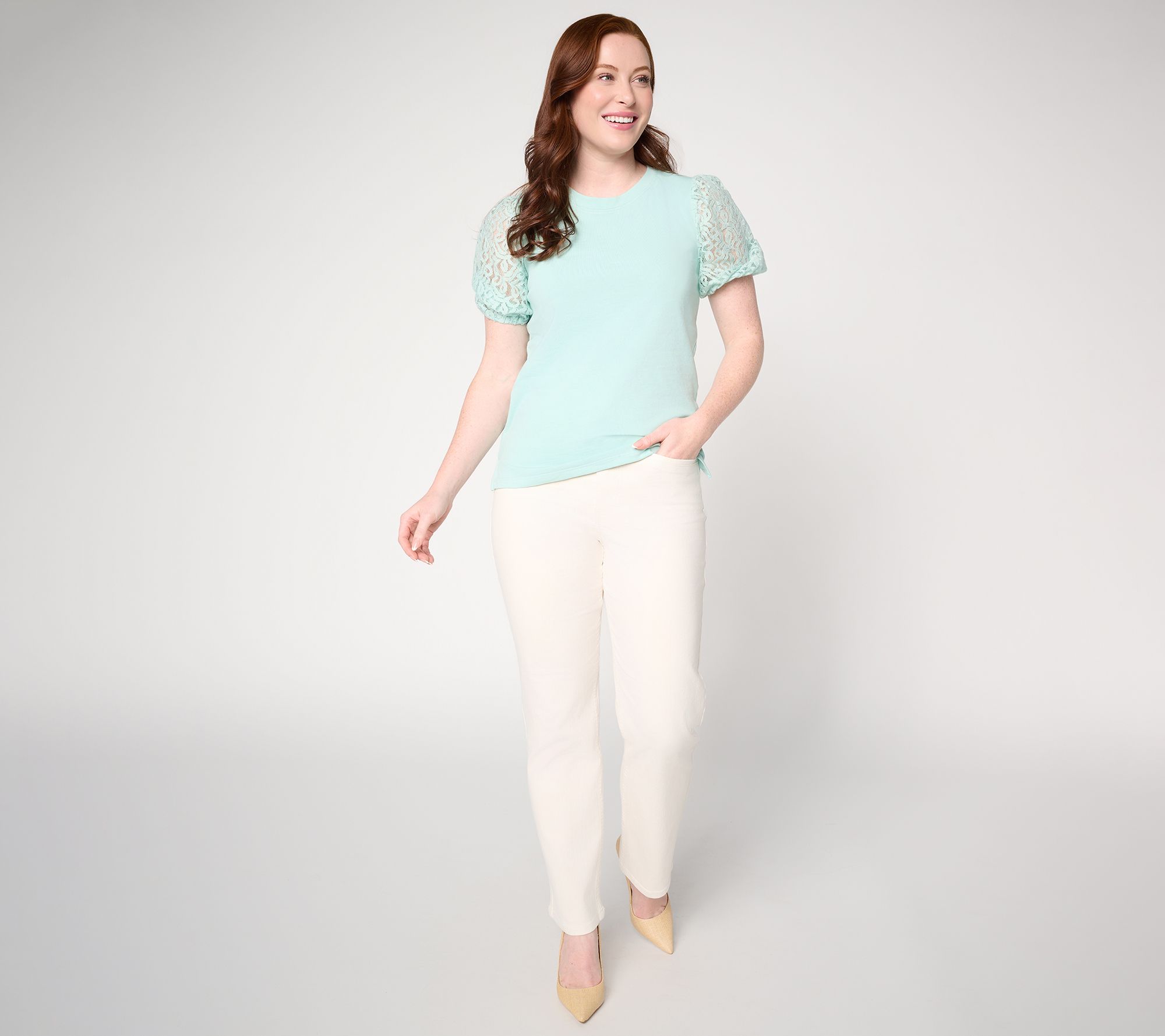 Slip on this crew neck knit top for those easy days when a touch of elegance is all you need. The lace fabric at the elbow-length sleeves lends a refined detail, ideal for upscale outings or relaxed get-togethers. From BEAUTIFUL by Lawrence Zarian.