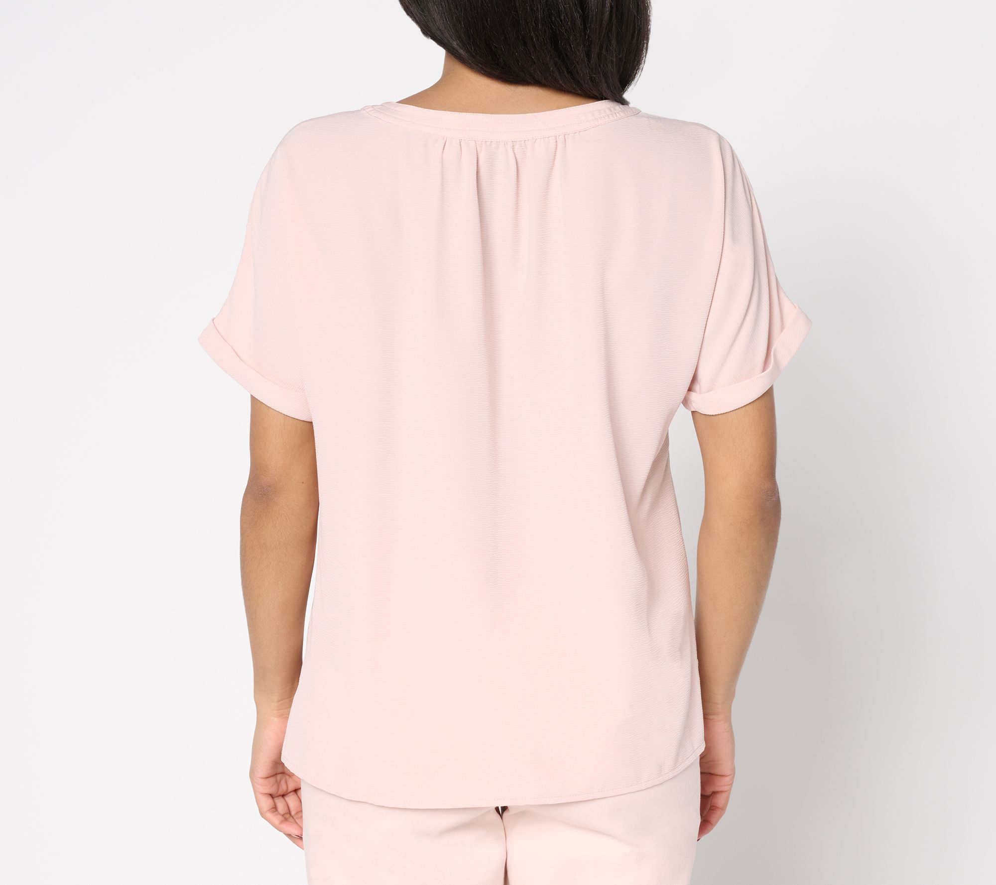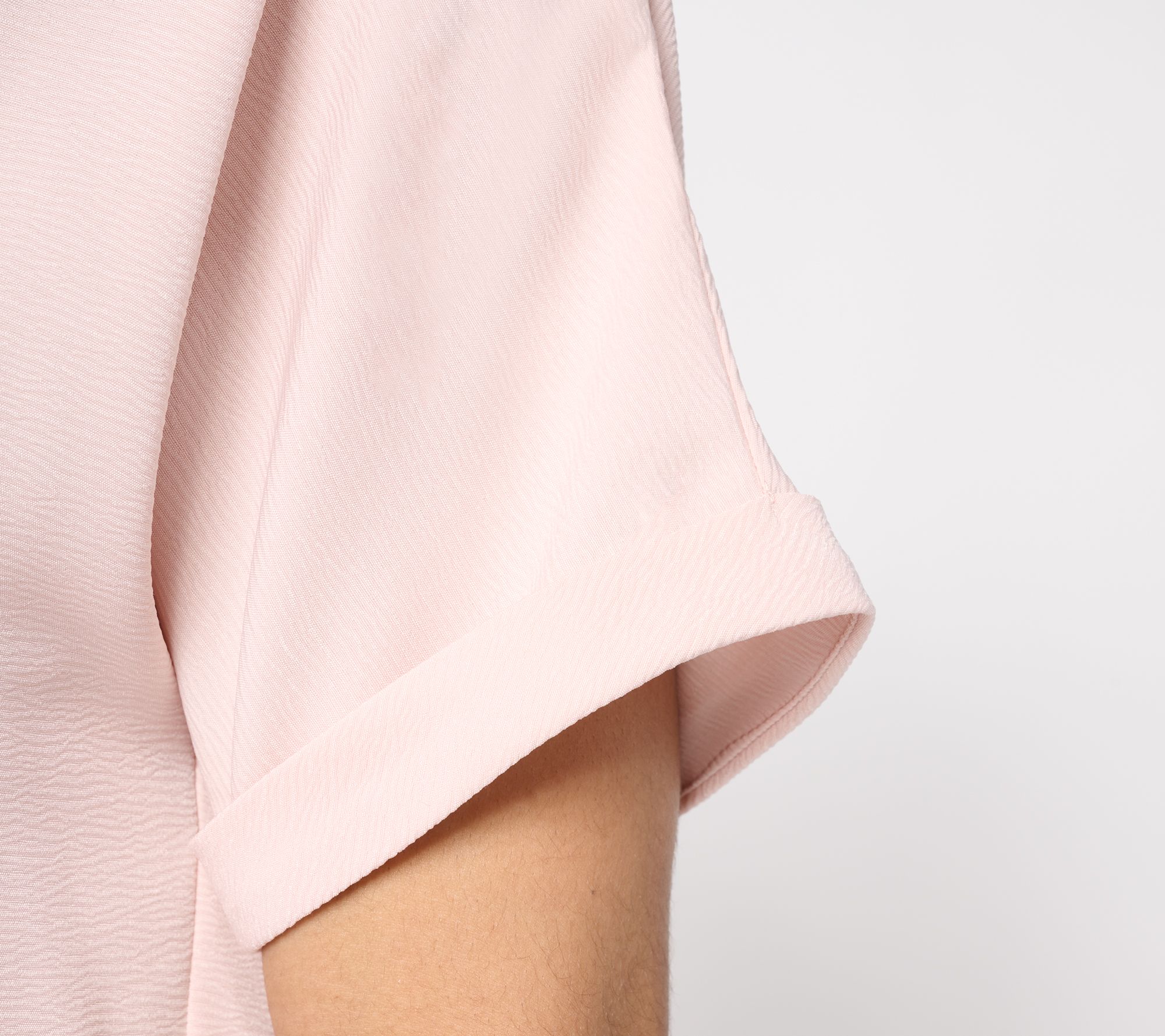 Features: rolled cuffs tacked at the inside of the outer sleeve, side slits, double turnback hem with single needle top stitch, clean finished neckline with self-facing
