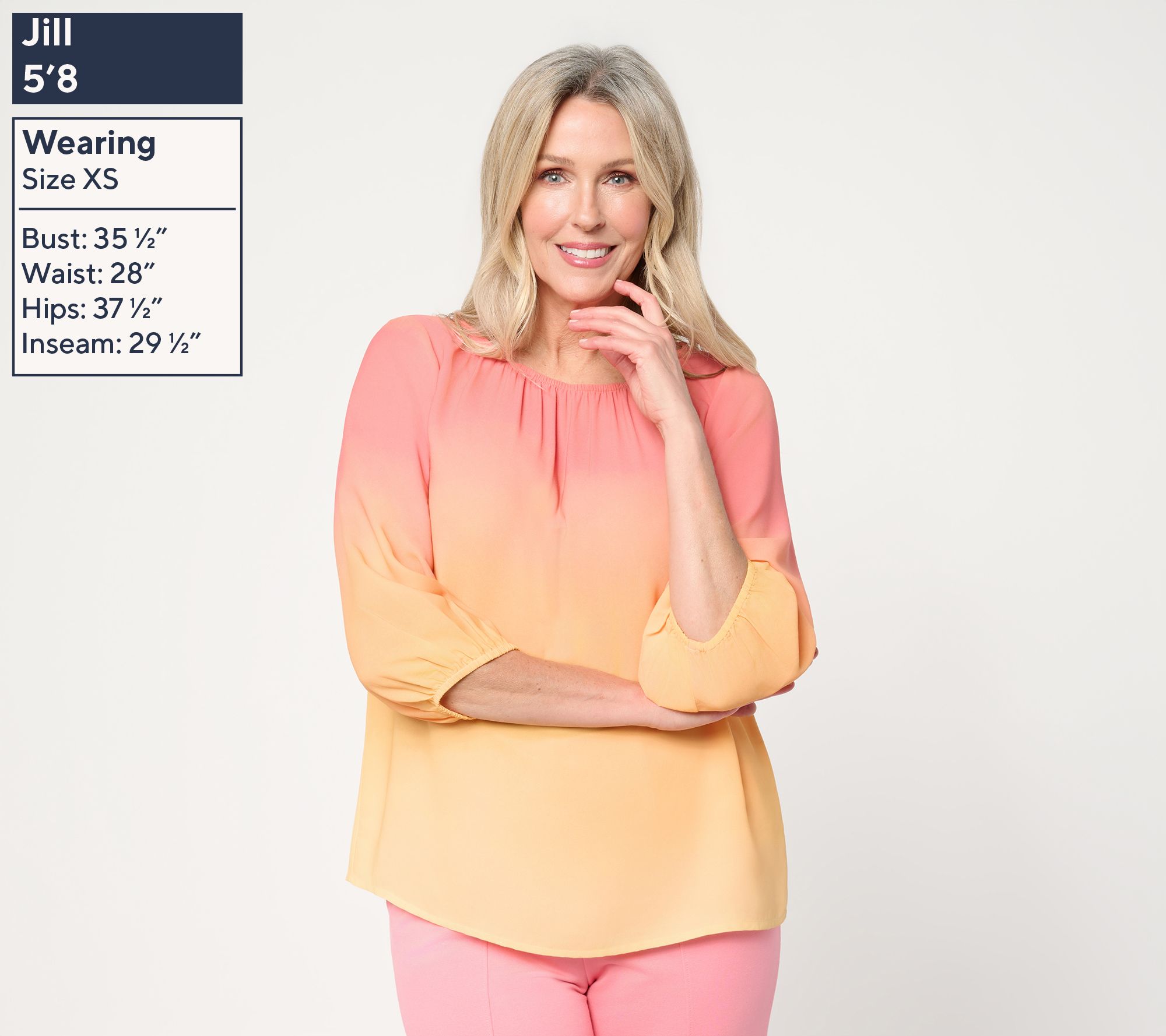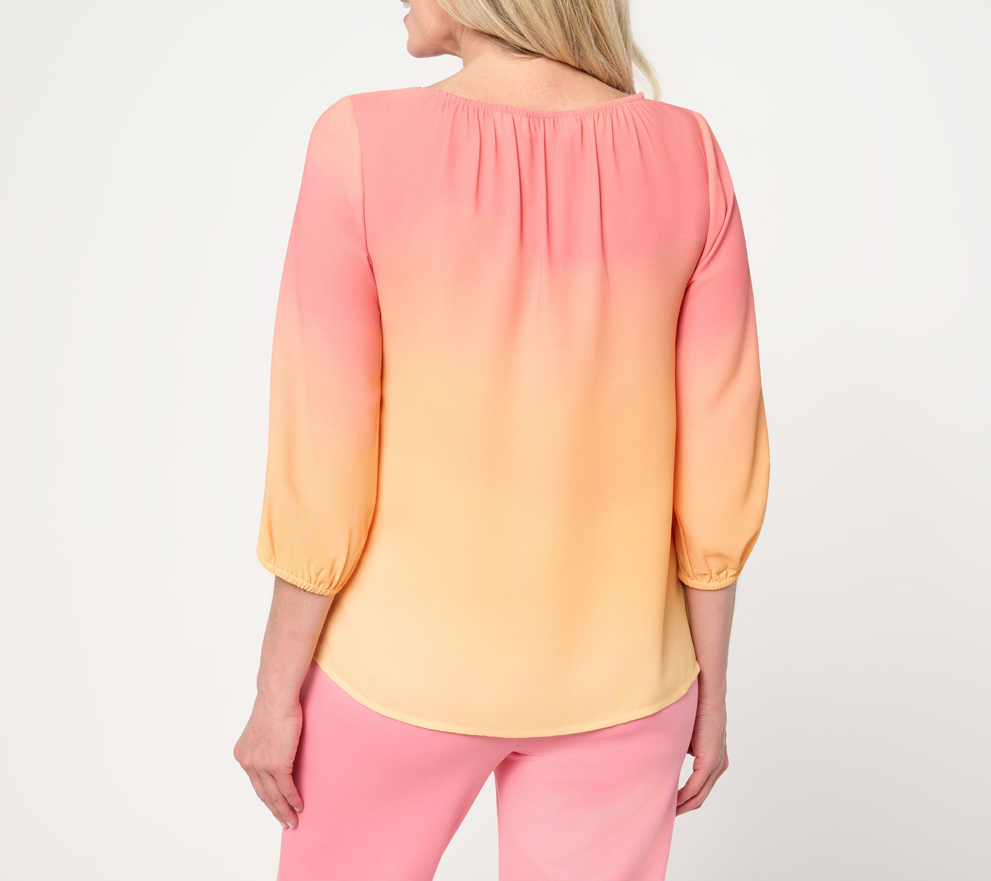 Features: ombre print, 3/4-length sleeves with elastic sleeve cuffs, shirring at neck