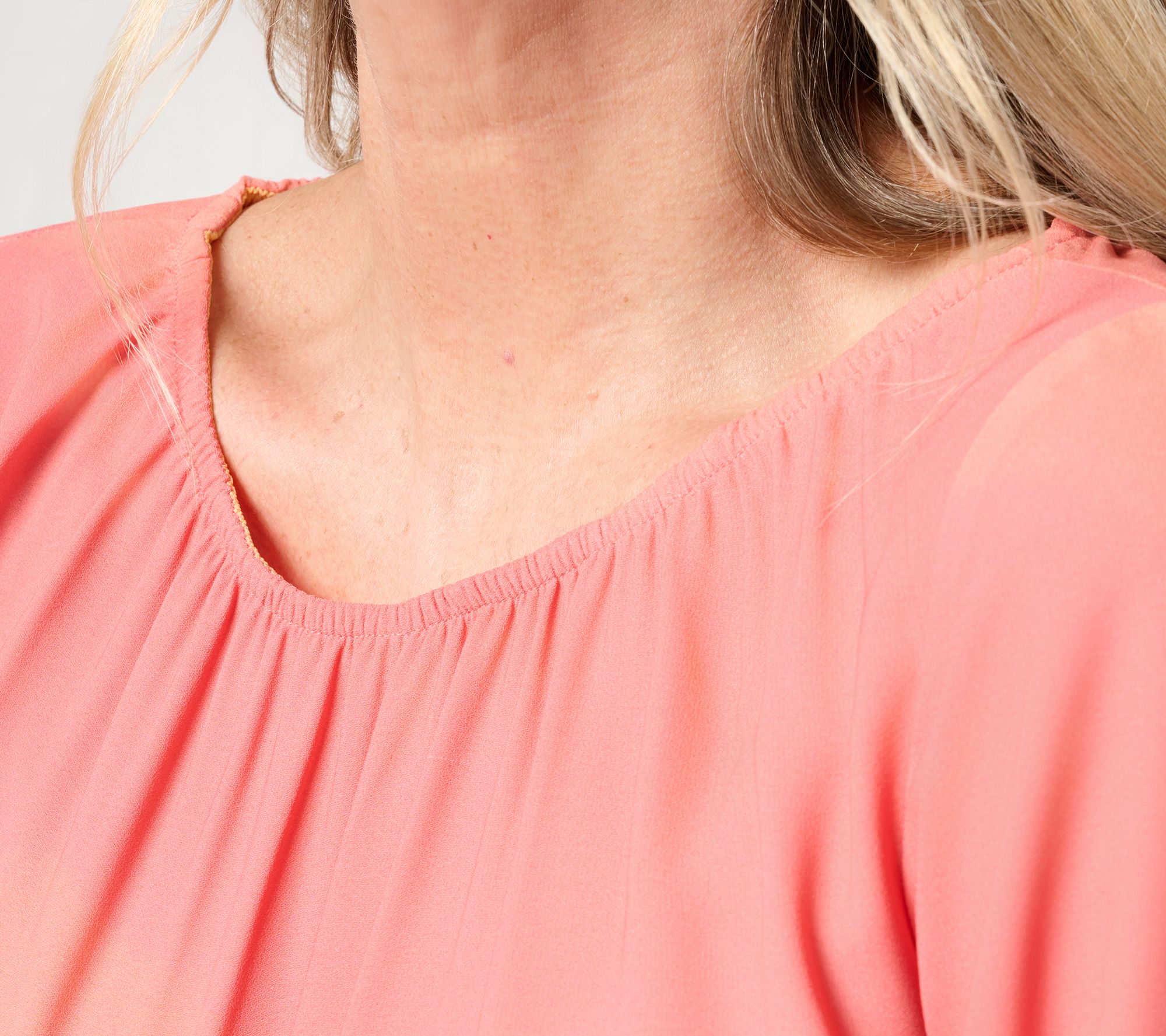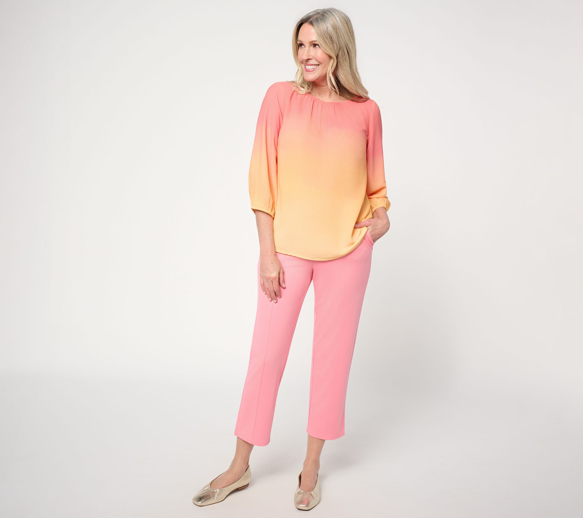 Soft color transitions and delicate shirring at the neckline bring a modern update to this classic woven blouse -- equally suited for busy workdays or casual weekends. The gradually shifting hues of the ombre print make for an "omigosh" moment. From BEAUTIFUL by Lawrence Zarian.