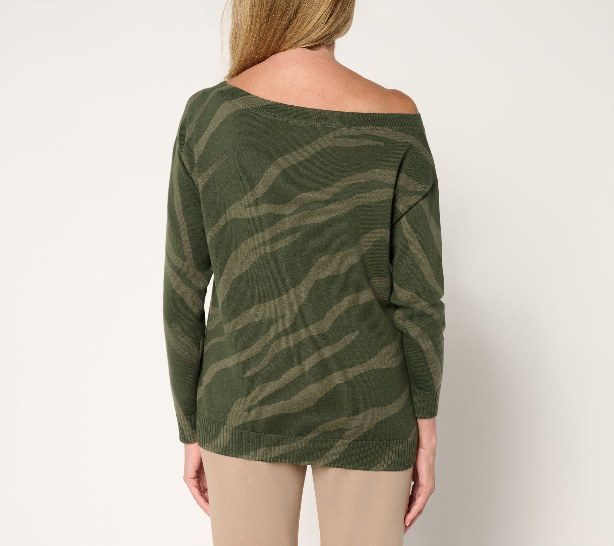 Go a little bolder and show a little shoulder. Relaxed elegance is easy with Lawrence Zarian's off-shoulder sweater. The printed design and dropped shoulder create a modern silhouette with a not-so-shy hint of sultry. From BEAUTIFUL by Lawrence Zarian.