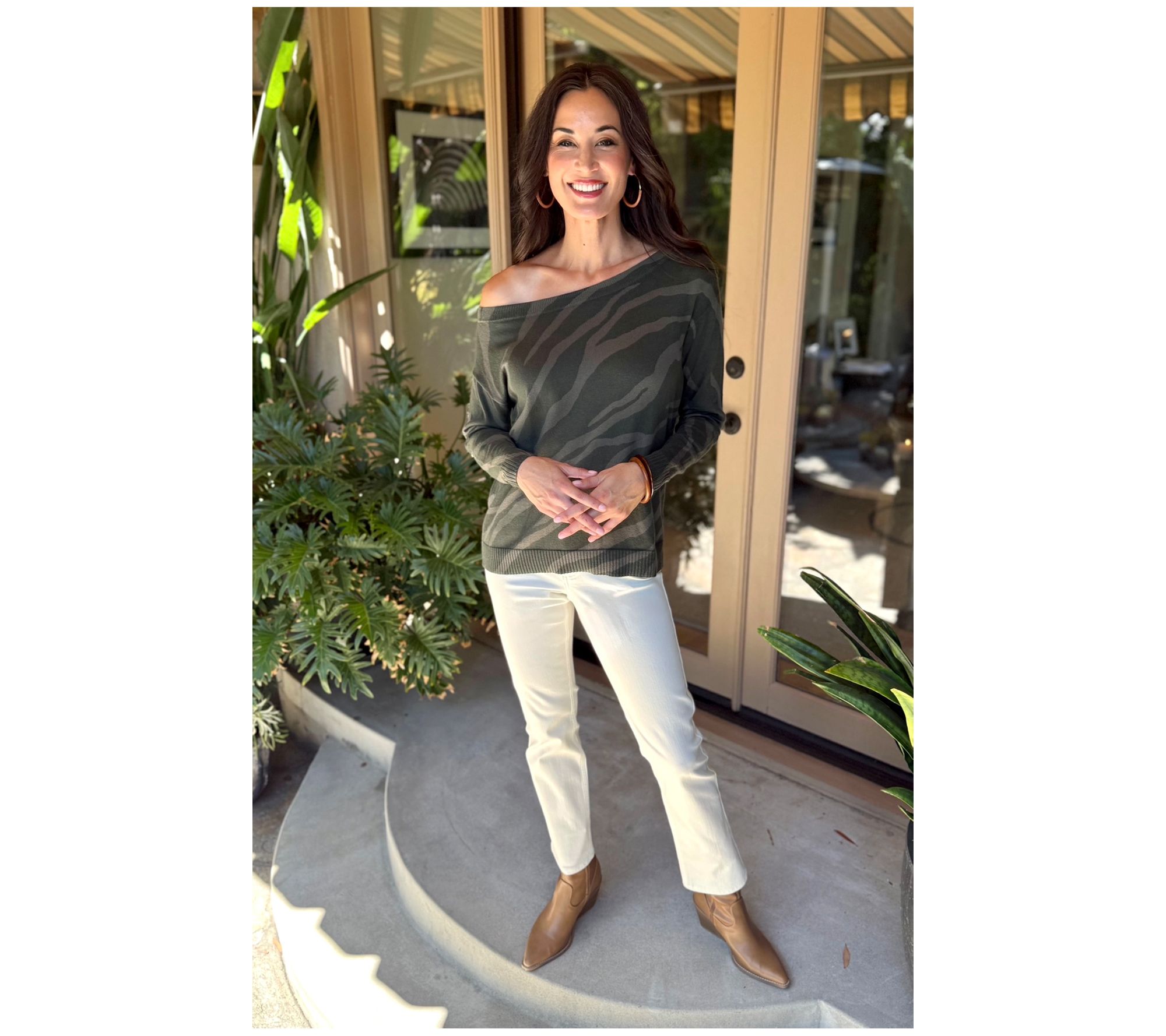 Features: allover print, off-the-shoulder style, dropped shoulder, rib at neck, sleeve hems, and bottom hem