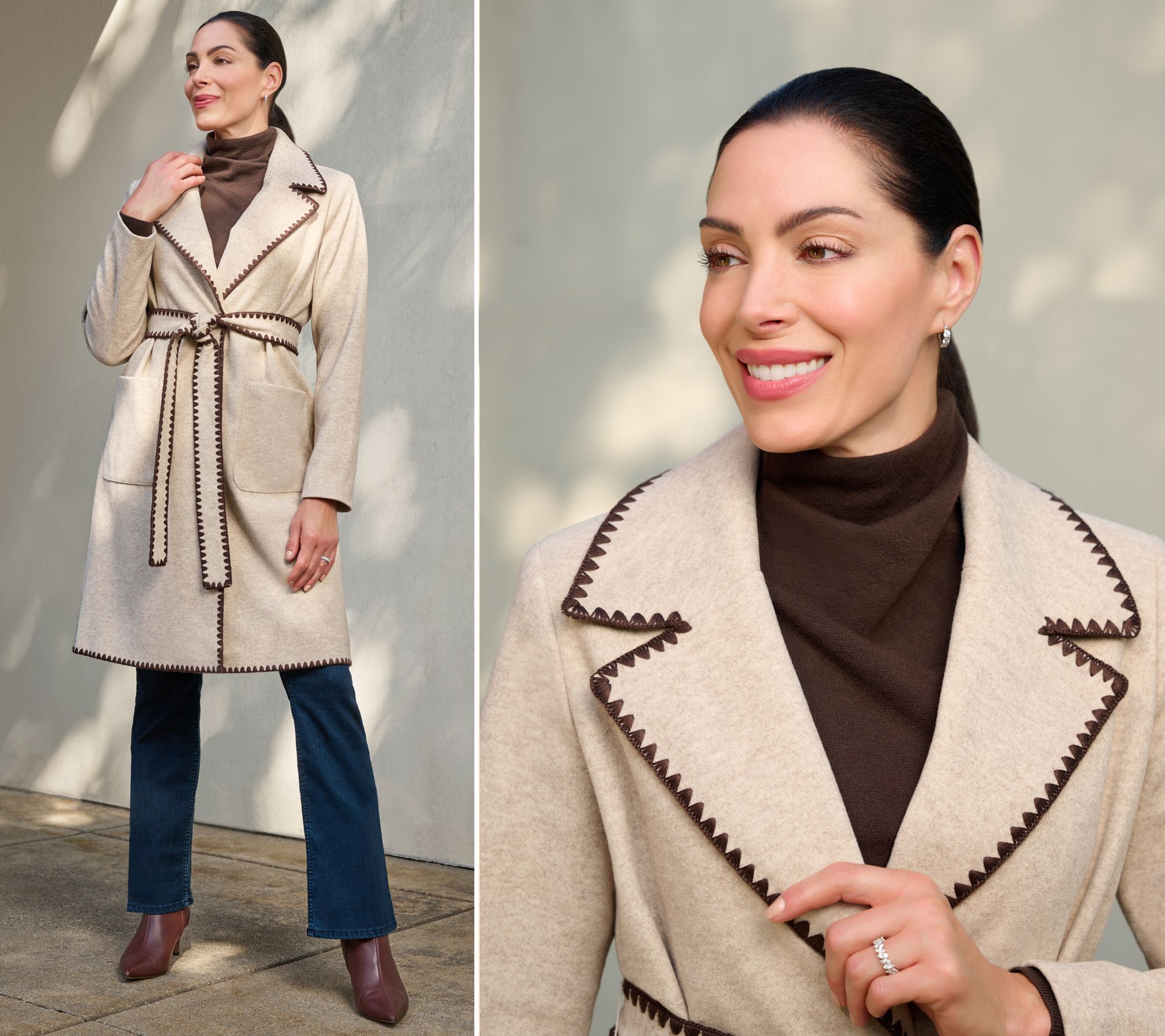 Bundle up, beautifully. This belted double-knit coat from BEAUTIFUL by Lawrence Zarian is the timeless, tailored outerwear revamp your closet's been craving -- made extra luxurious with contrast blanket stitching and a full lining. Its clean lines get you out of the puffer zone, layering elegantly over fall's blouses and denim, winter's sweaters, and dresses for all seasons and celebrations. Brushed double knit is a fine-quality, mid-weight fabrication that's versatile enough to wear throughout fall/winter.