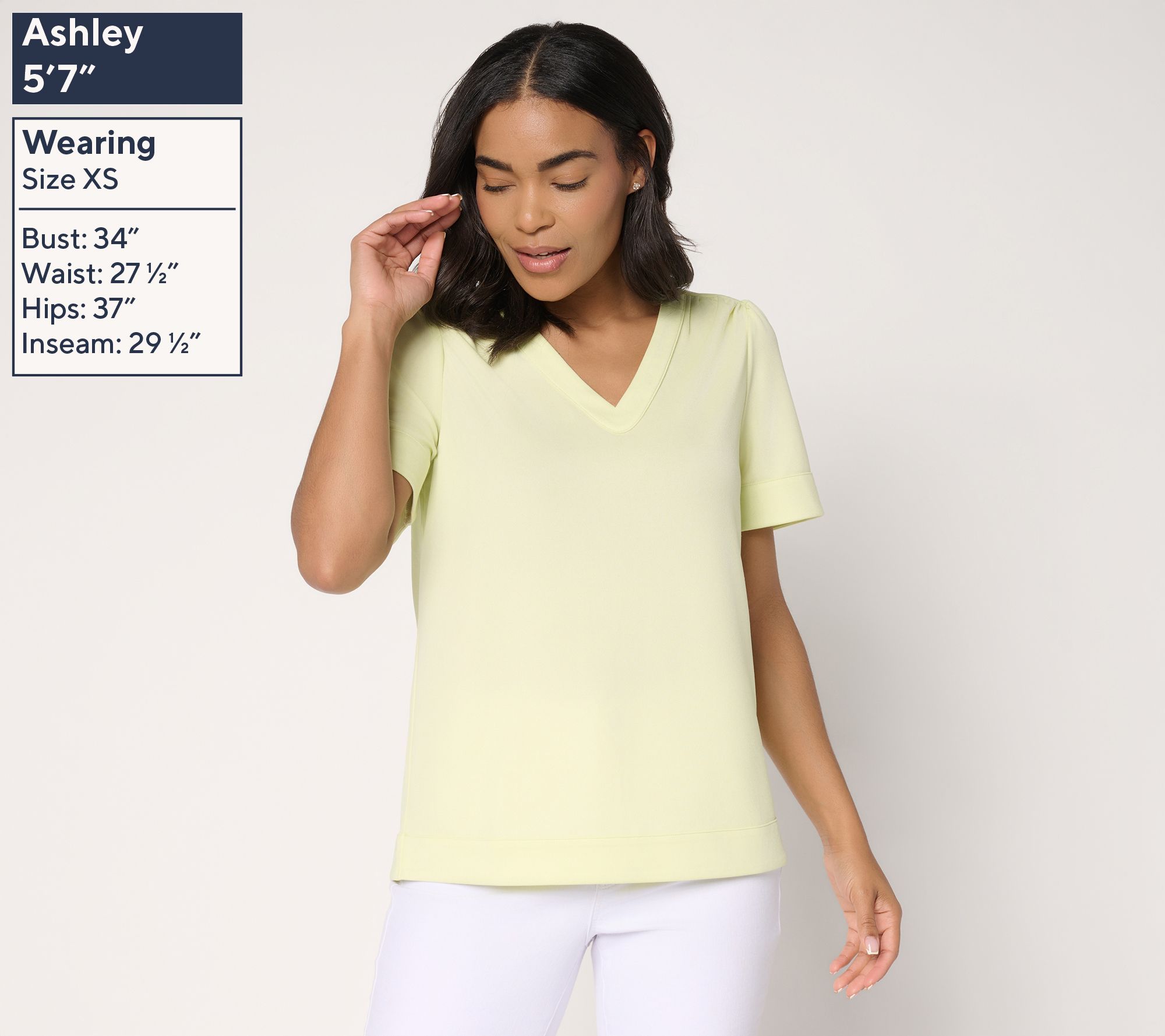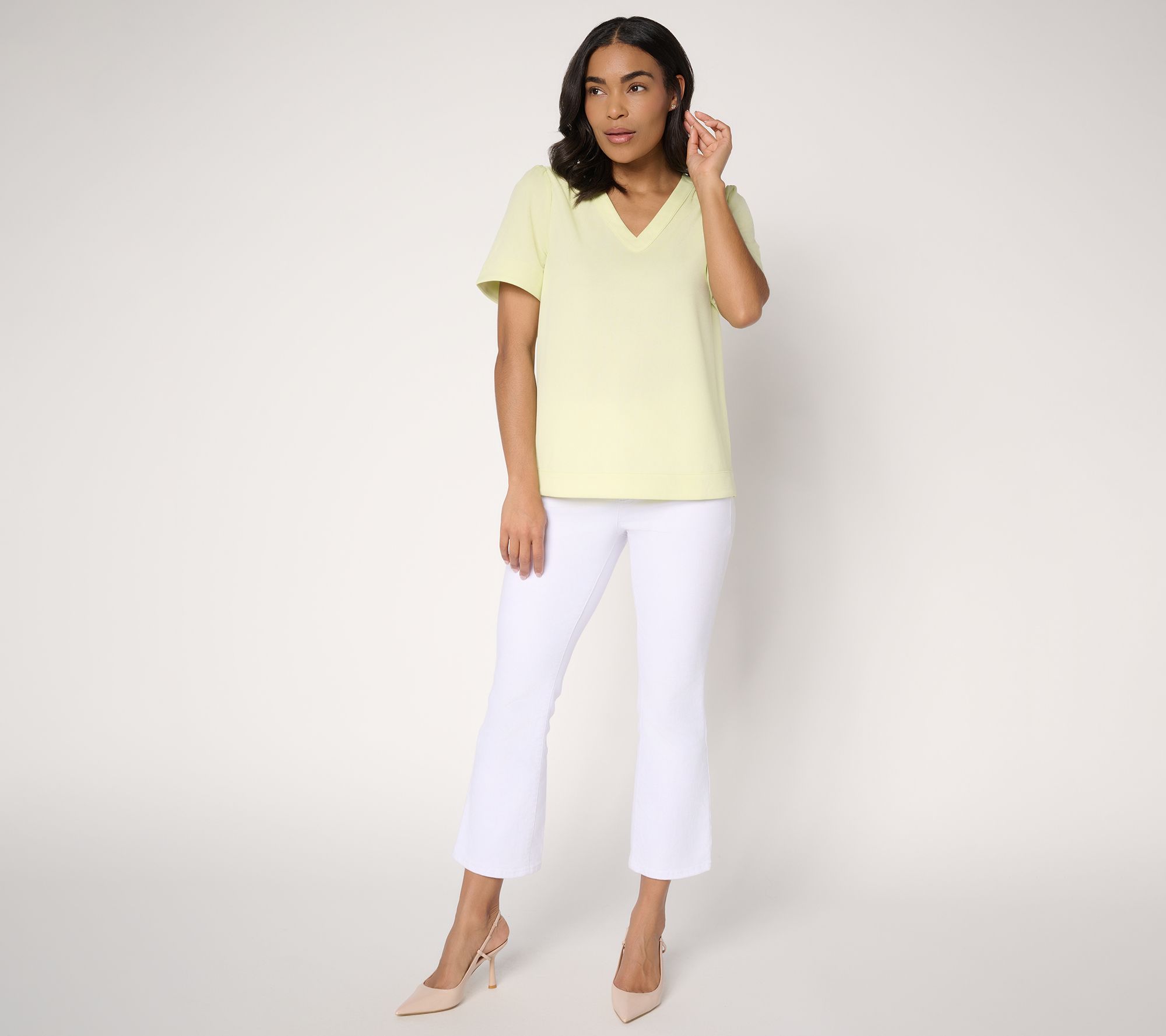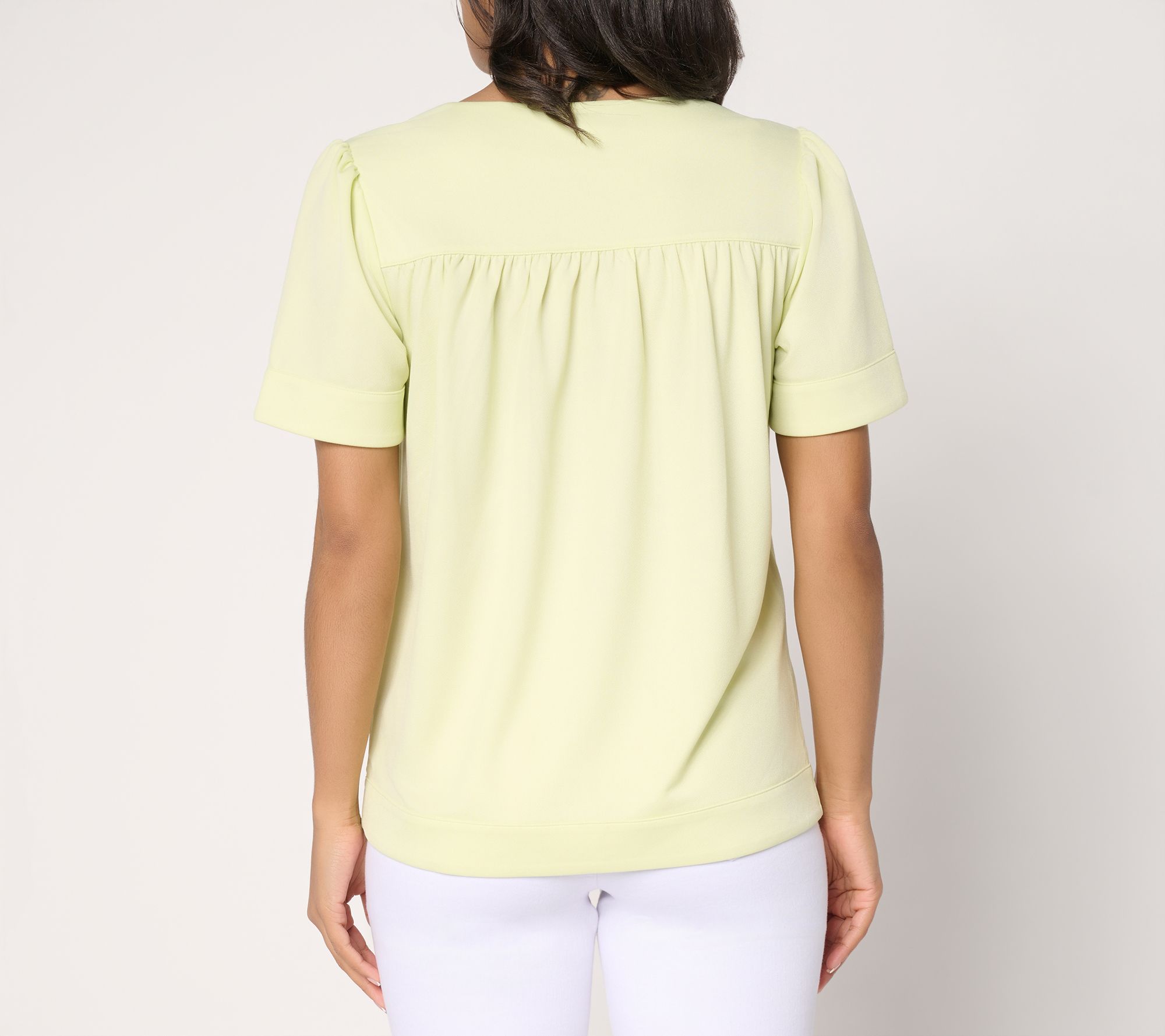 Easygoing afternoons and evenings out both feel a little more special with this knit top, featuring shirred shoulders, a back yoke detail, and a flattering V-neckline. Its textured pebble crepe stretches comfortably and adapts to your plans, whether you style it with jeans or a skirt for an effortless look. From BEAUTIFUL by Lawrence Zarian.