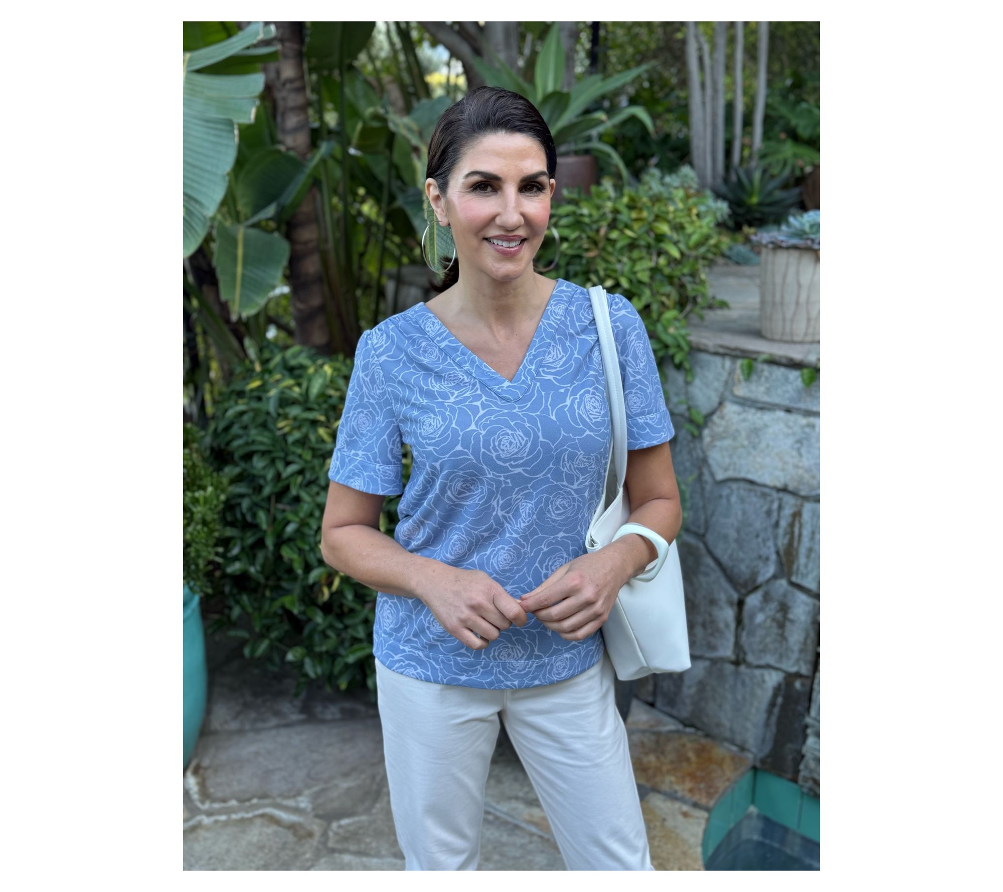 Features: shirring at shoulders, shirring at back yoke, V-neckline