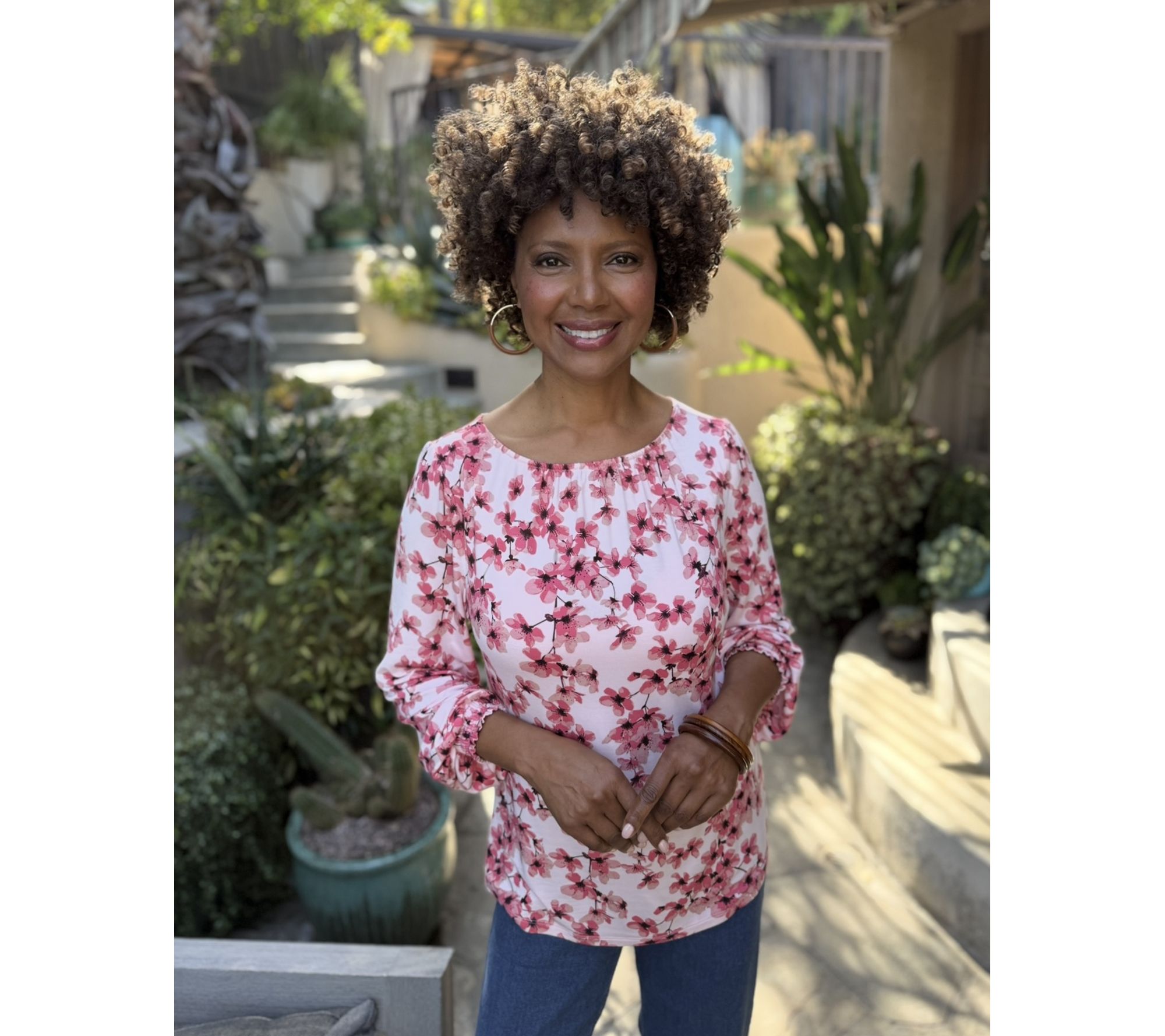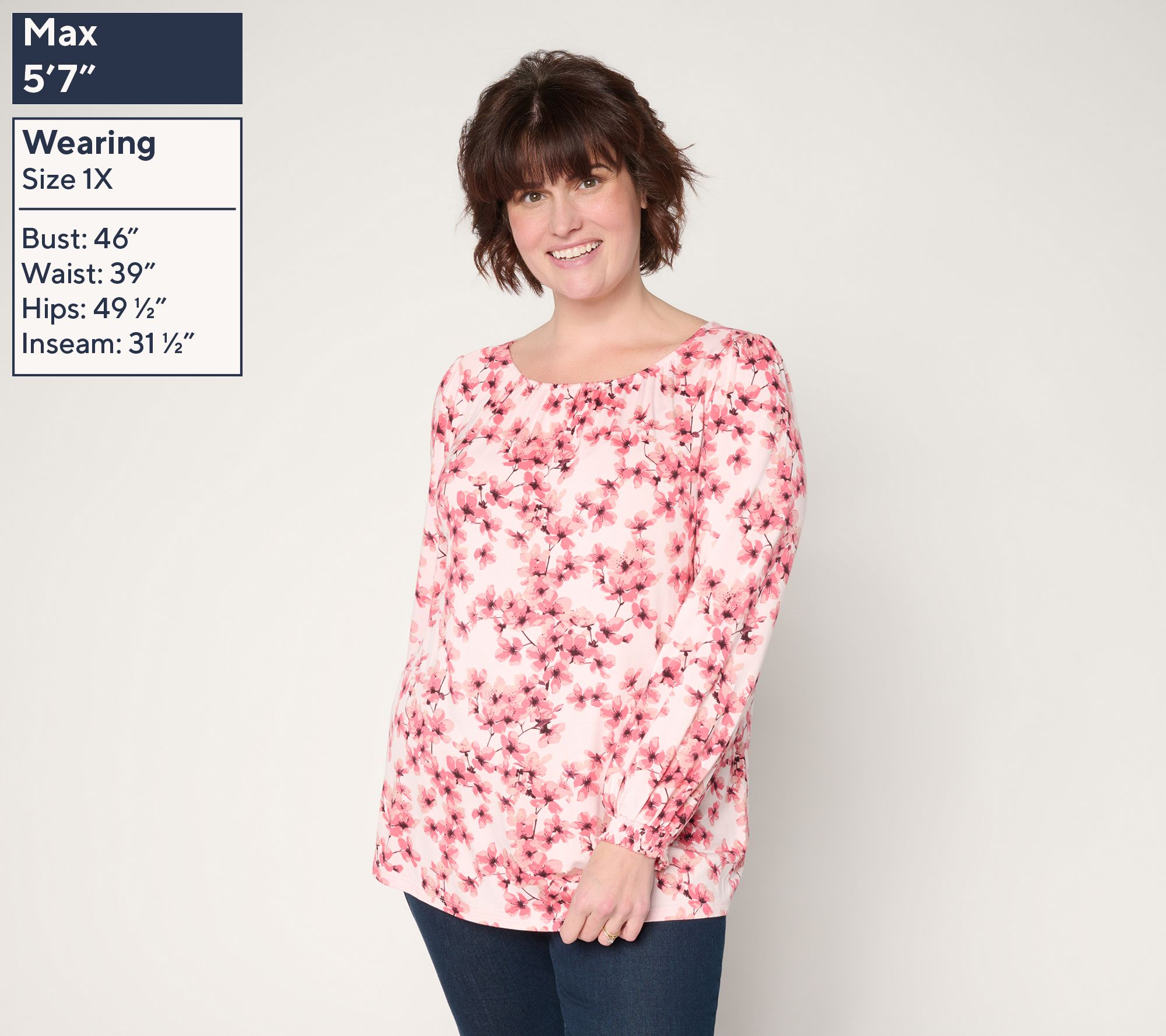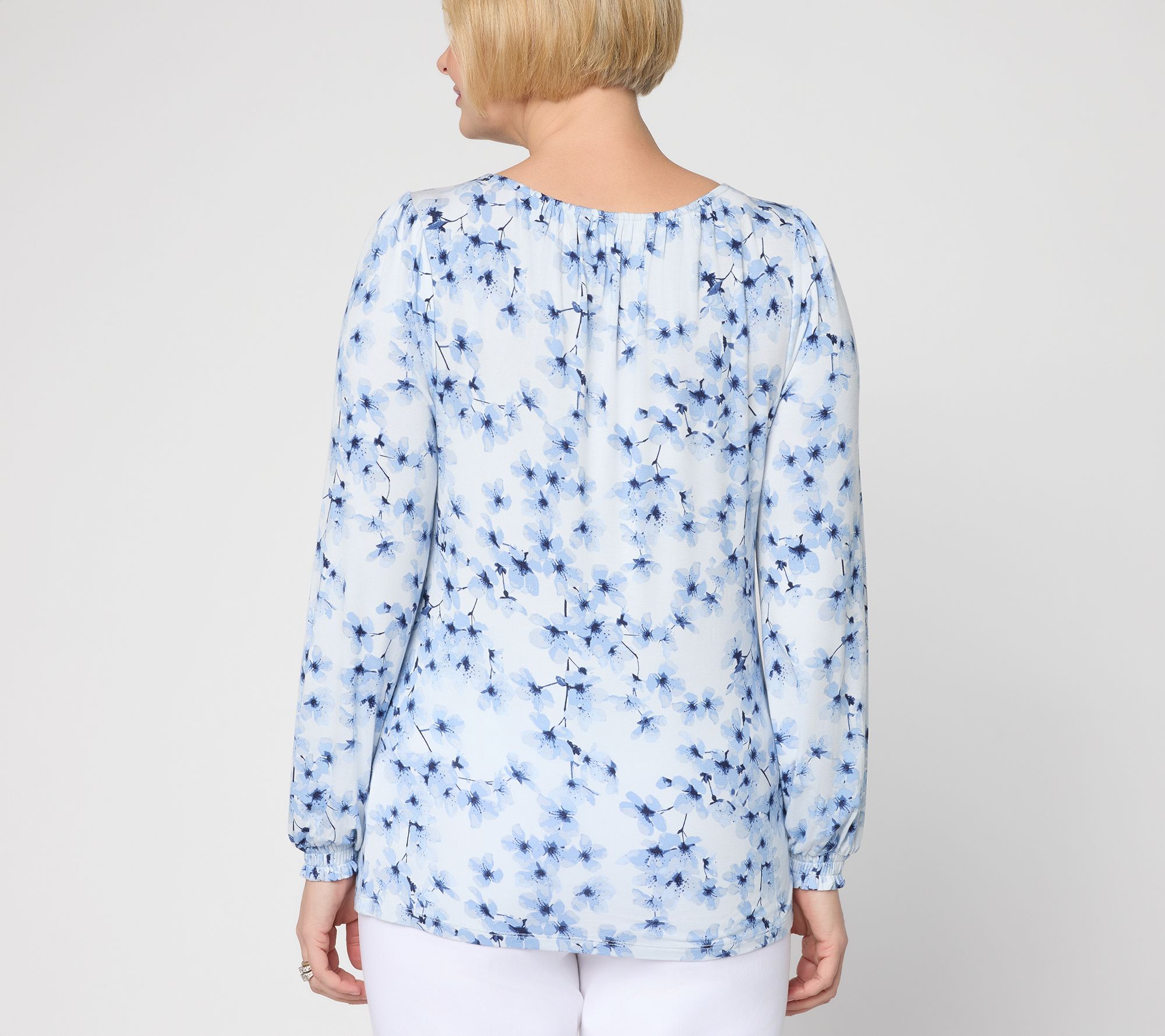 Features: printed, gathered boatneck, long sleeves, smocked cuffs