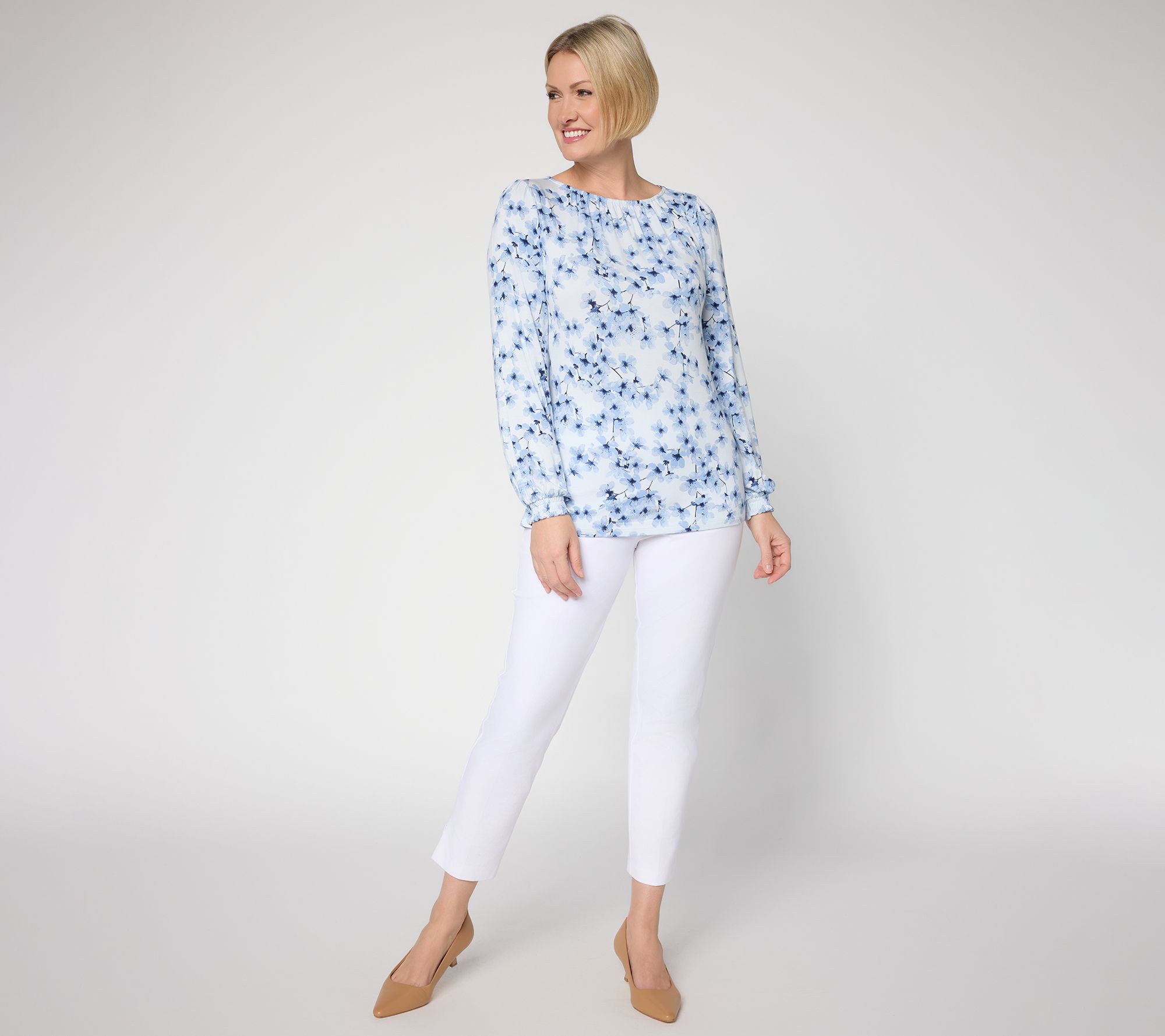 Chic gatherings and mornings at the office feel instantly elevated with this printed boatneck blouse. A softly shirred neckline and smocked cuffs add stylish detail to the semi-fitted silhouette, making this top an easy pick for dinner dates or weekend brunch. From BEAUTIFUL by Lawrence Zarian.