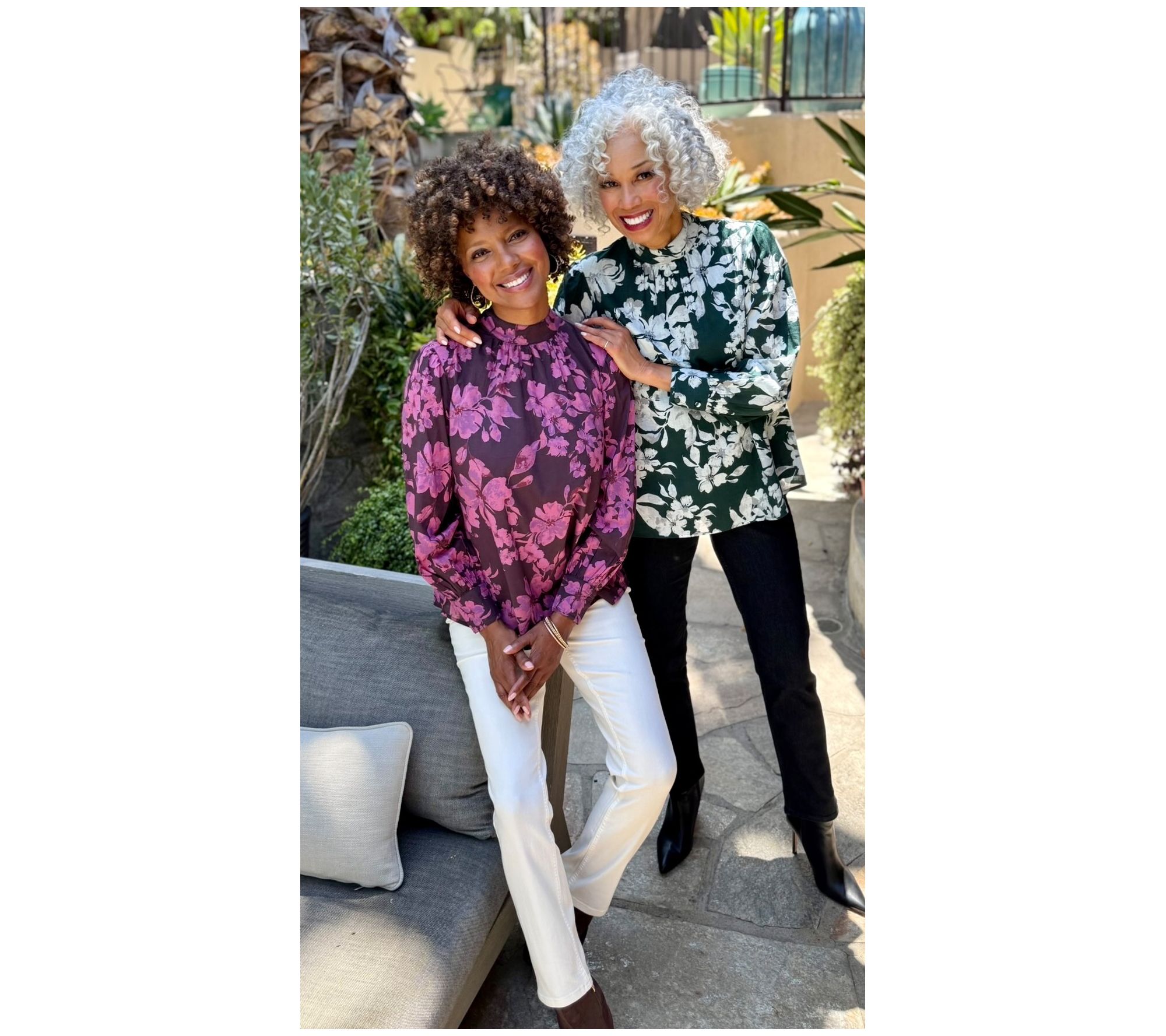 Features: printed, long blouson sleeves, two-button cuffs, high neckline with back slit and elastic-loop button closure
