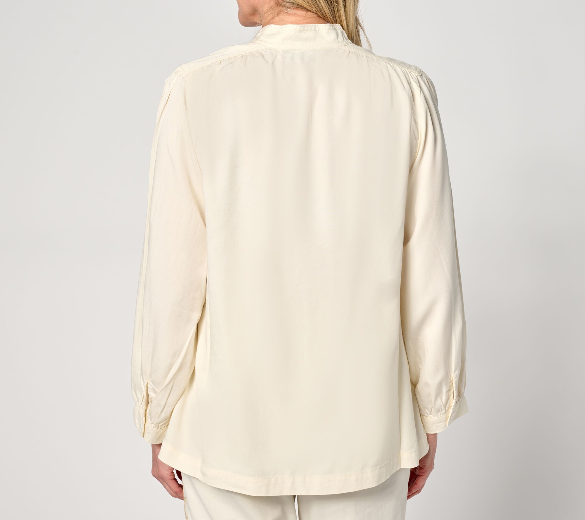 Features: mandarin collar, V-neckline, shirred shoulder detailing, long puff sleeves, cuffs, straight bottom hem