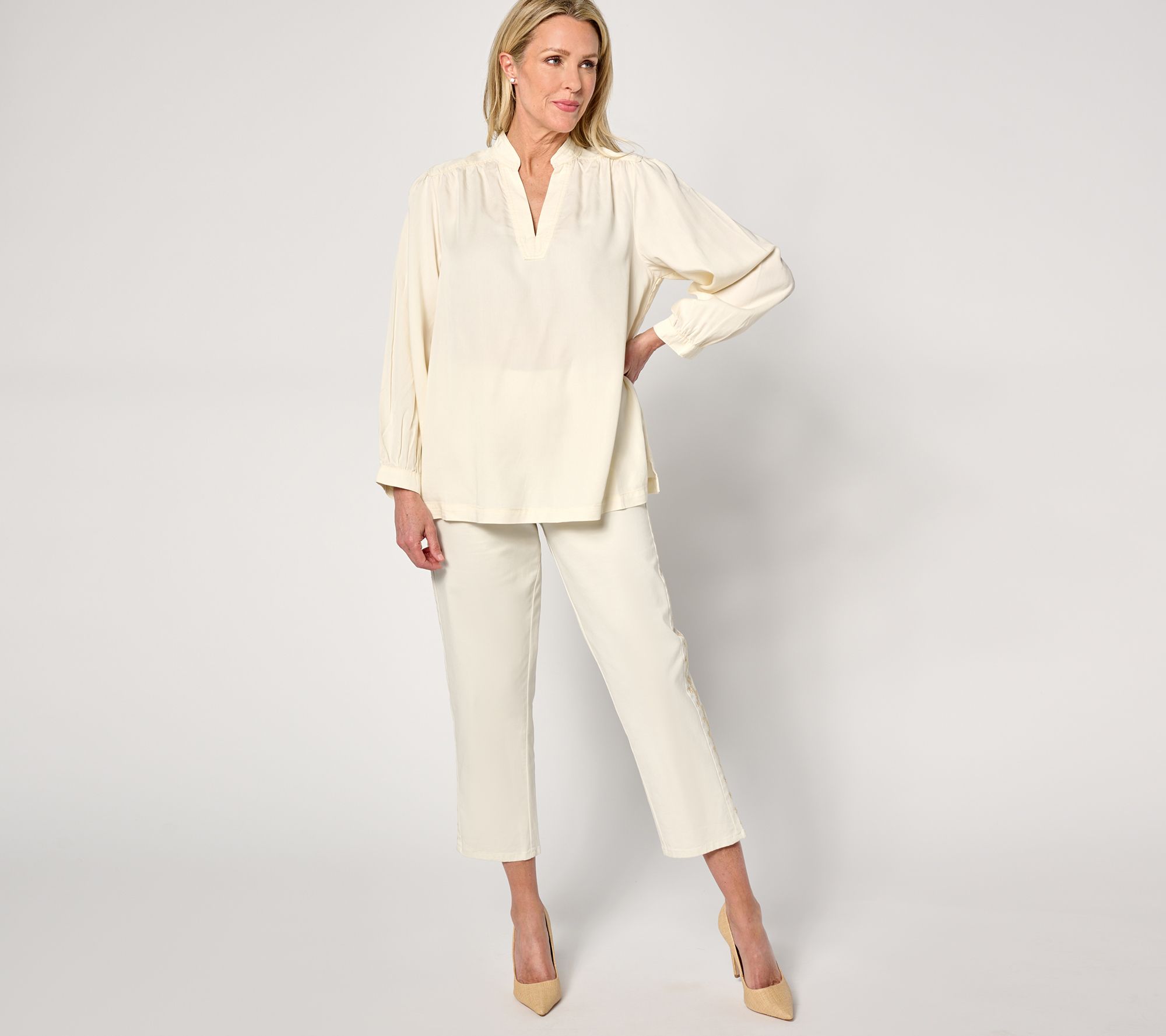Did somebody say denim? This woven top looks anything but basic with a V-neckline that shows just the right amount of decollete, Mandarin collar, and delicate puff sleeves. From BEAUTIFUL by Lawrence Zarian.