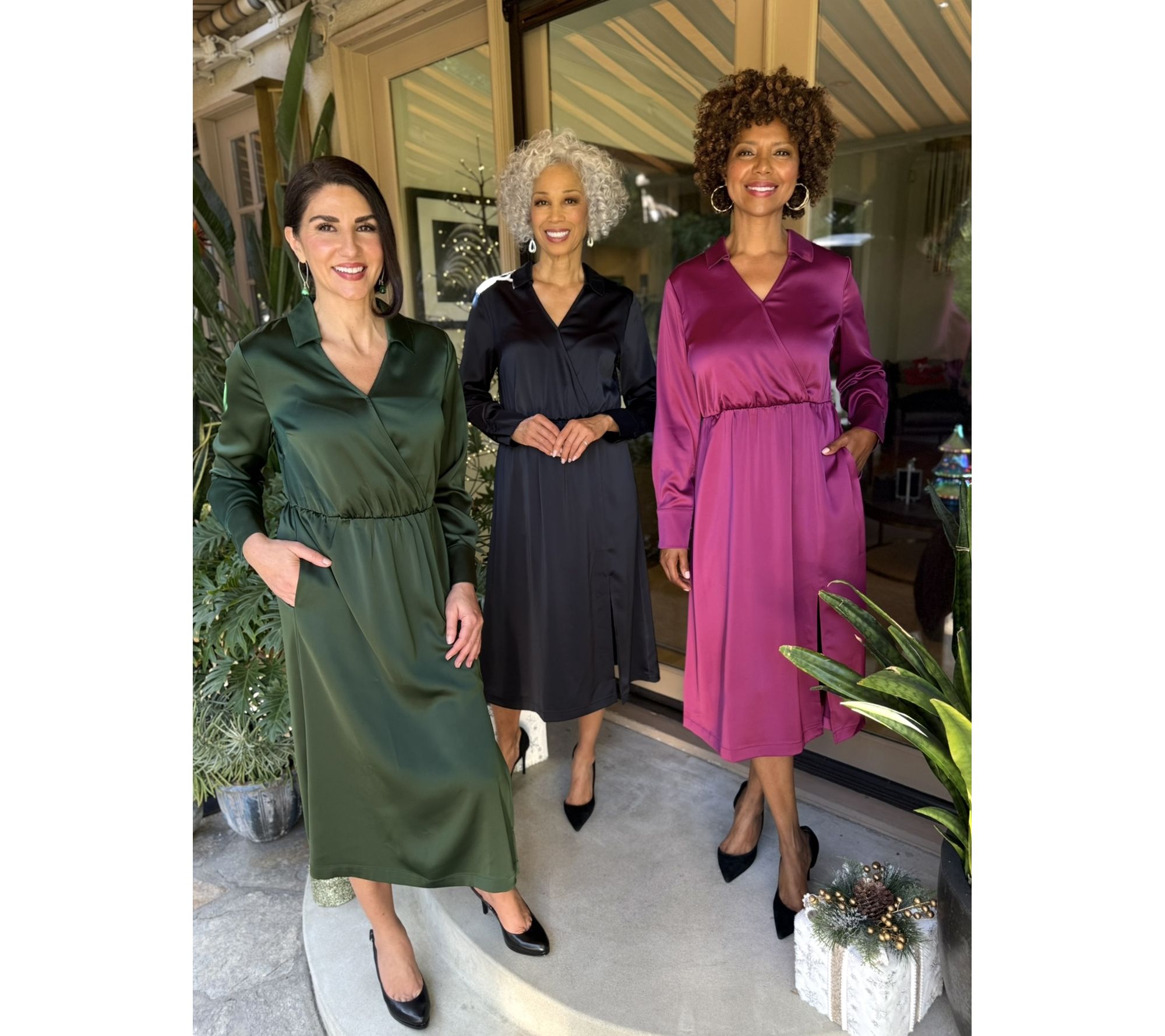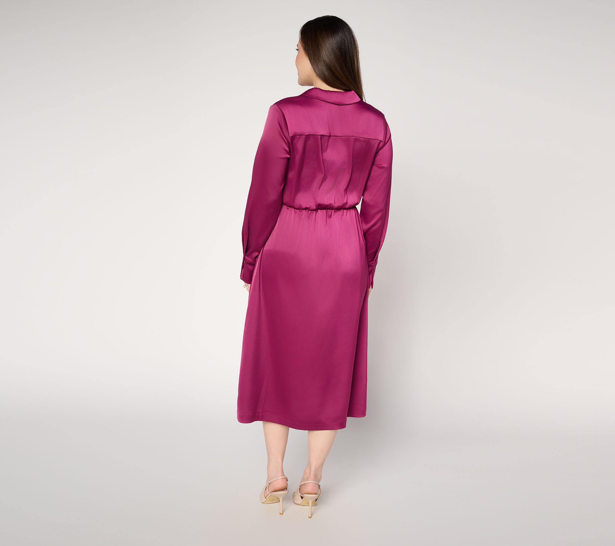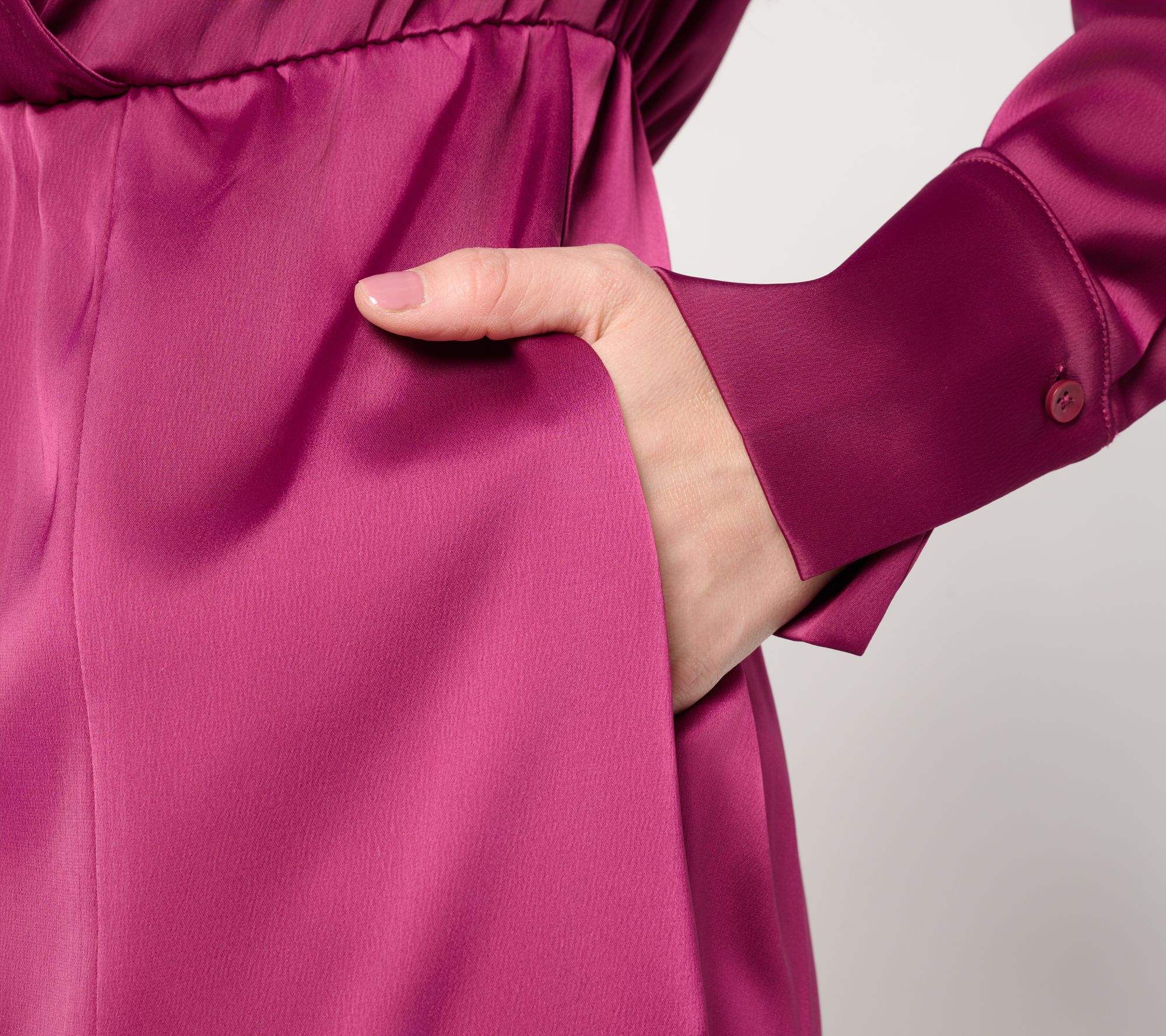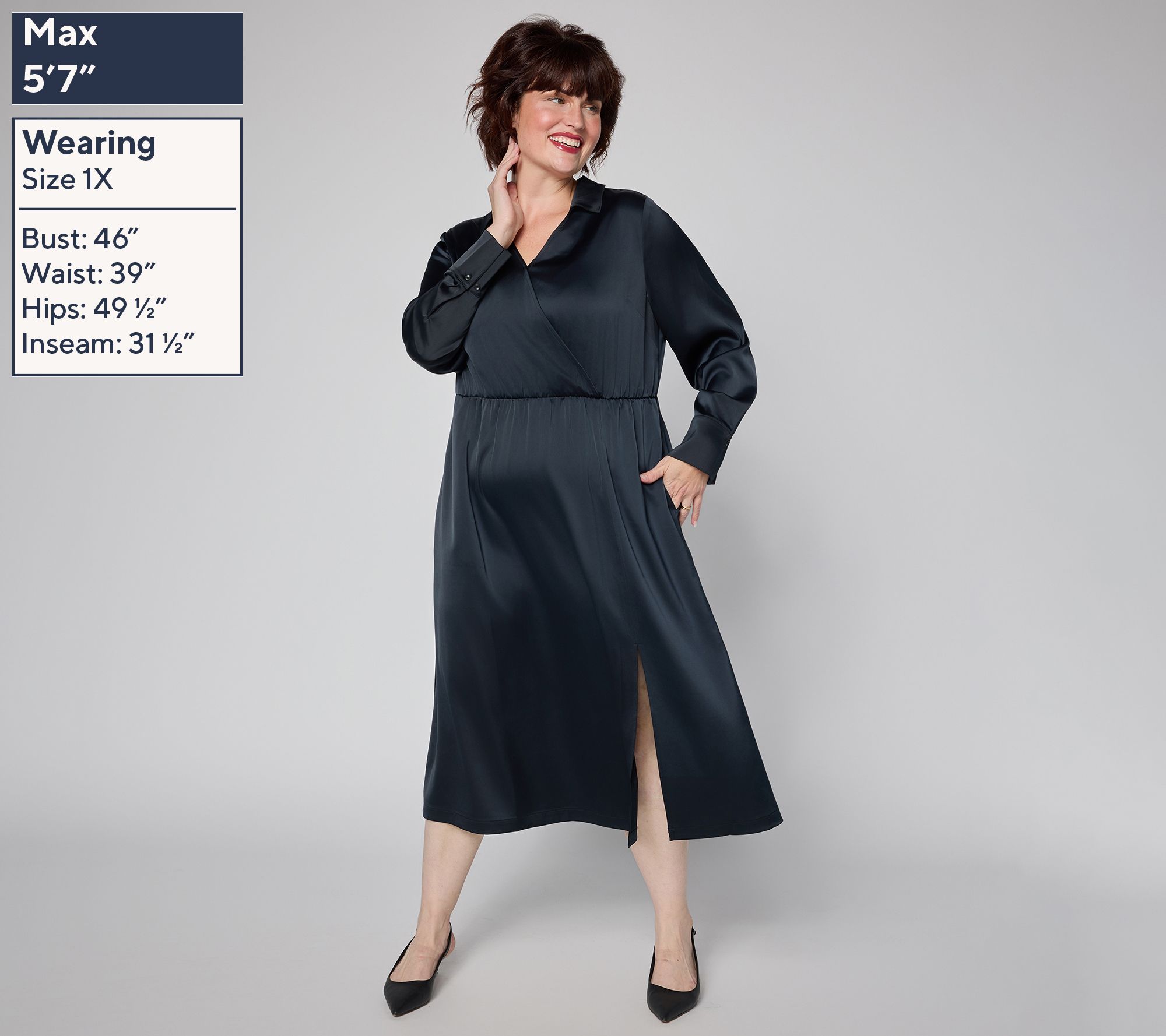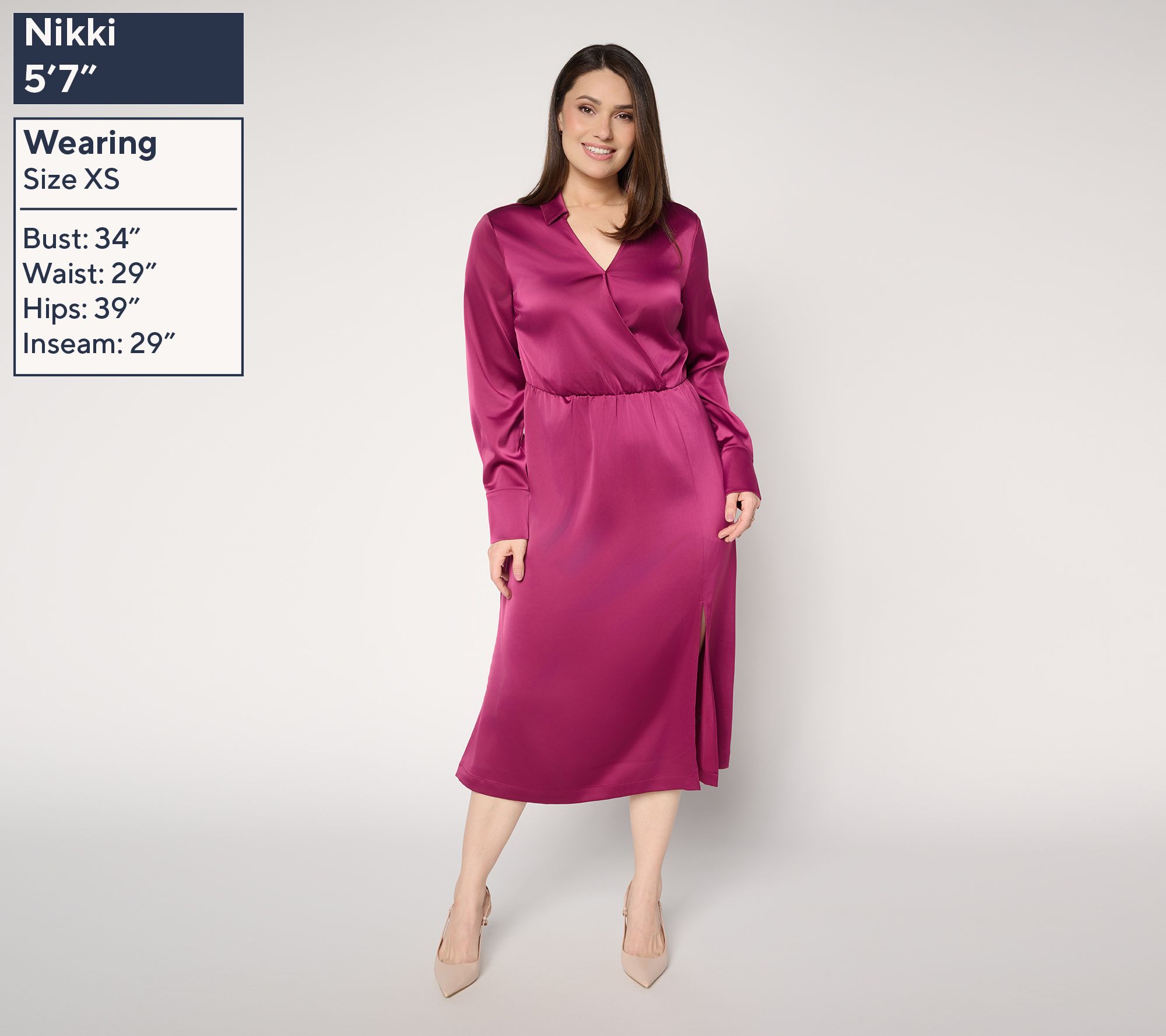 Bring a touch of sophistication to celebratory dinners or holiday soirees with this woven satin dress. The faux wrap design, elegant roll collar, and skirt slit create a refined silhouette, while handy on-seam pockets and an elastic waist offer comfort and ease from cocktails through dessert. From BEAUTIFUL by Lawrence Zarian.
