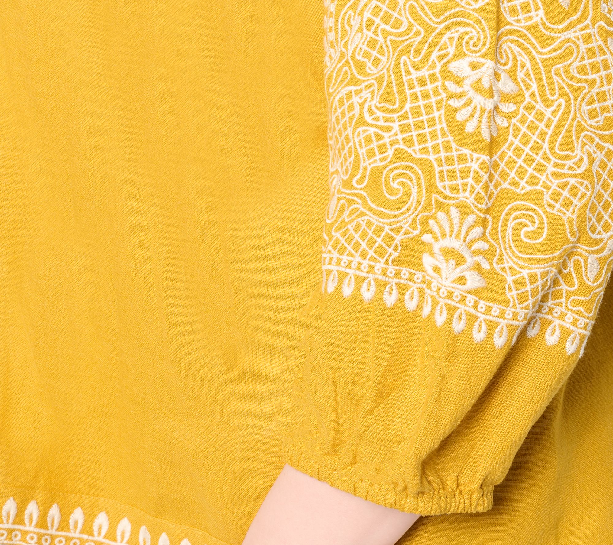 Features: round neckline with embroidery, 3/4-length sleeves with elastic cuff and embroidery, front and back yoke with embroidery