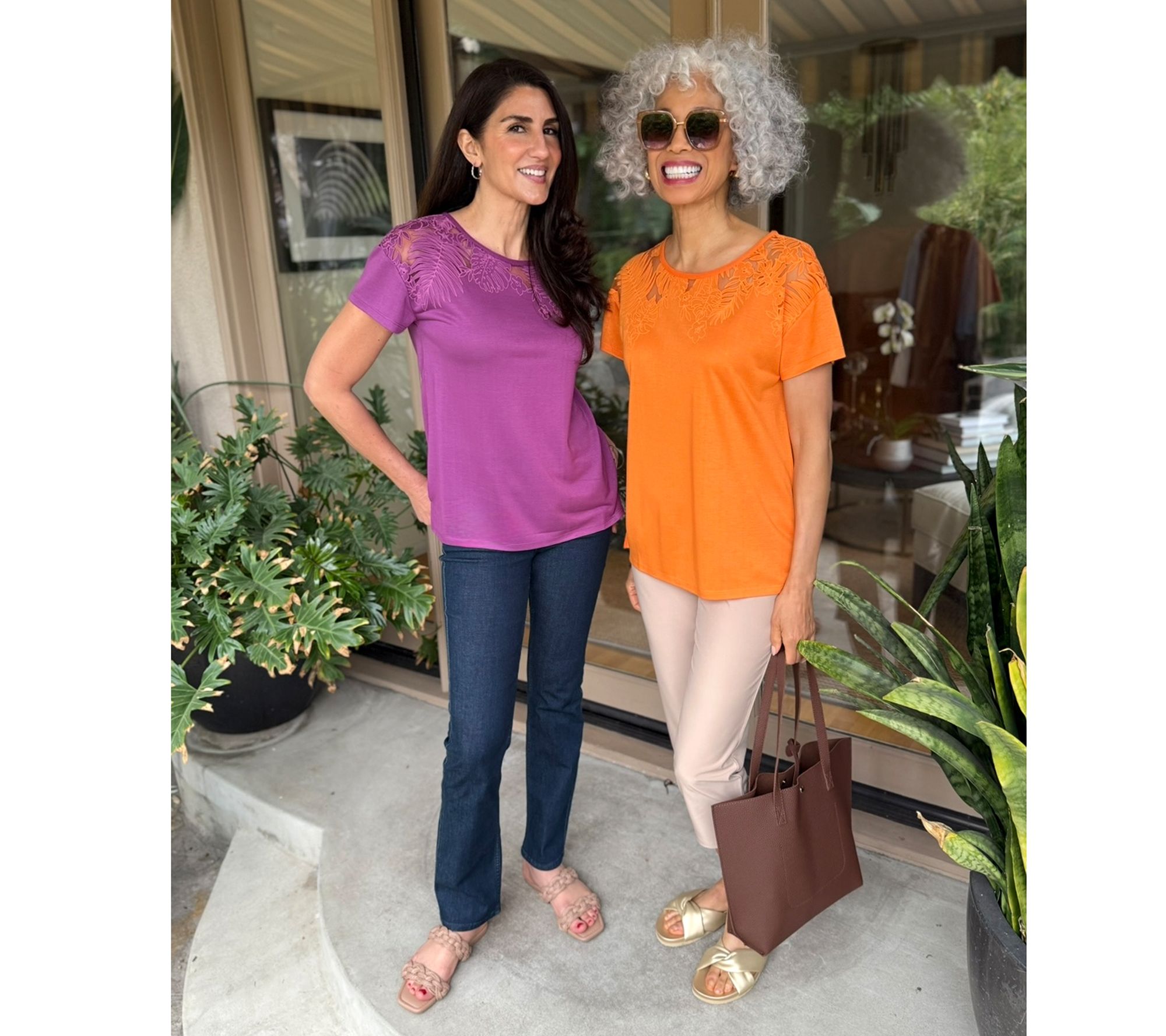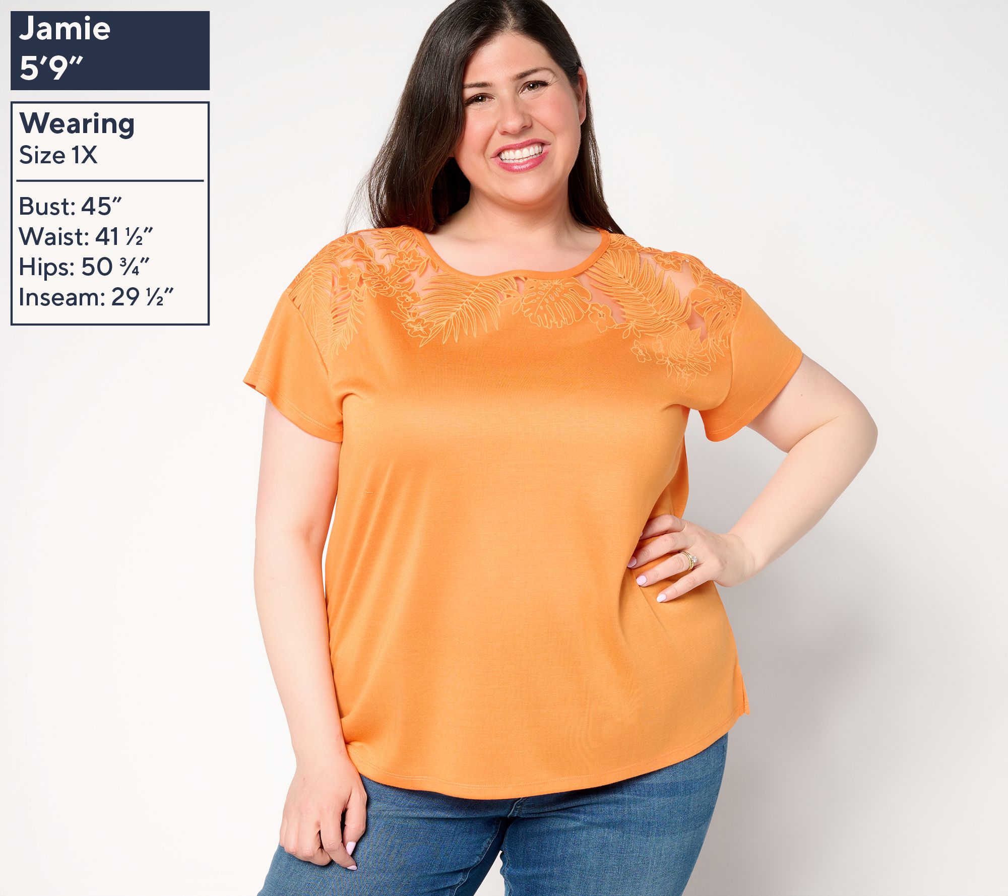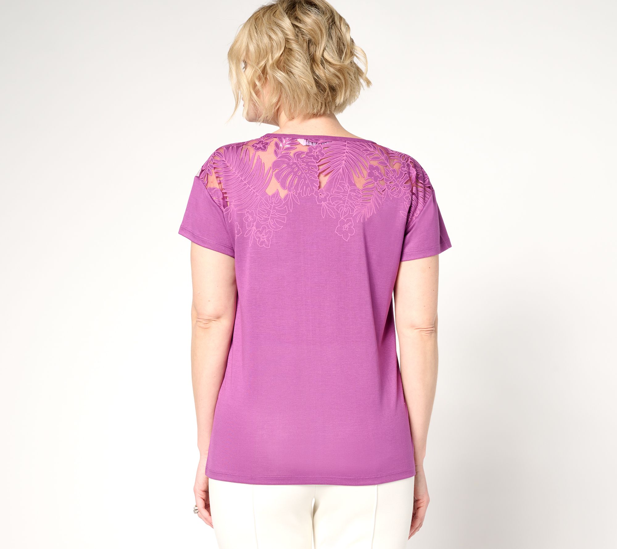 Not your everyday T-shirt. This Lawrence Zarian design will catch everyone's attention with its delicate floral burnout motif, affording a casual-chic choice for denim as well as an easy yet sophisticated option for skirts and tailored trousers. From BEAUTIFUL by Lawrence Zarian.
