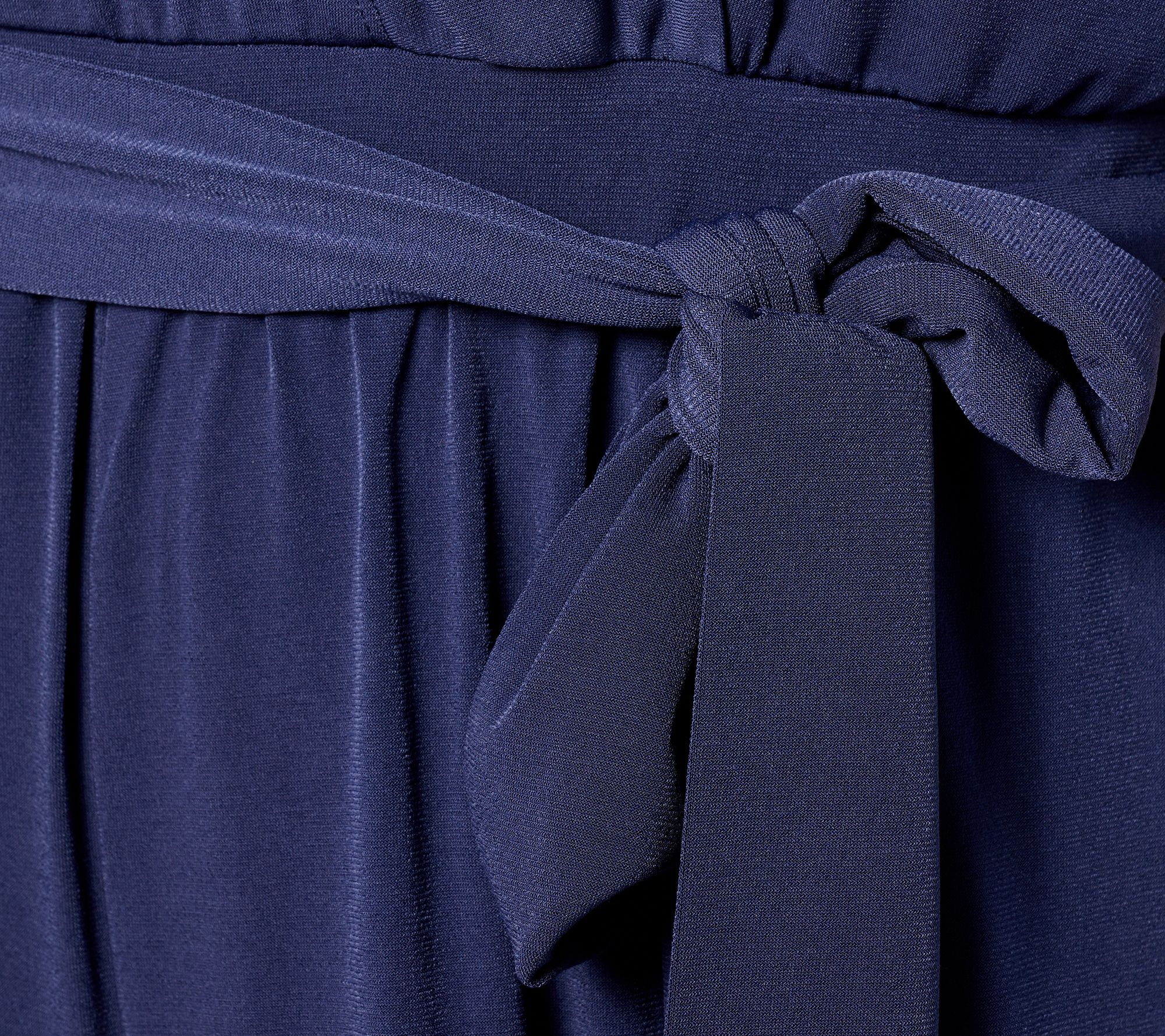 Features: V-neckline, elastic at waistband with self belt, wrapped upper body, elbow-length flutter sleeves