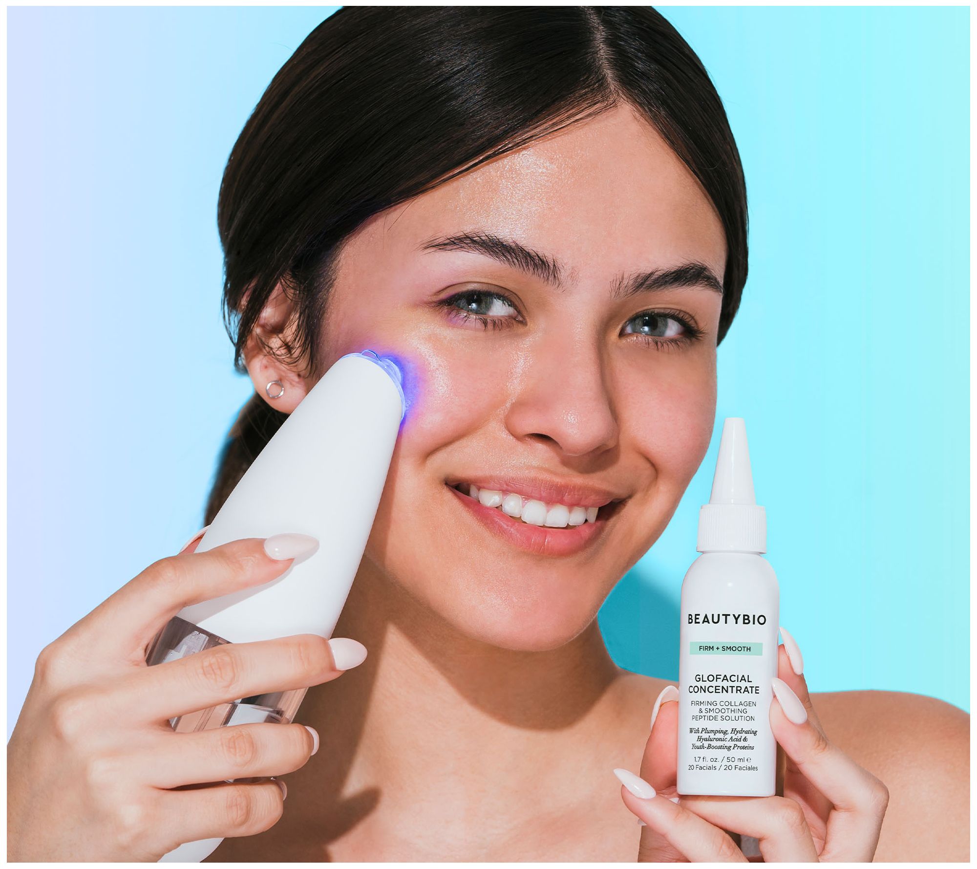 BeautyBio 2-in-1 Beauty Tool helps clean dirt, debris, and makeup from pores while simultaneously delivering a skincare treatment. It comes with Collagen Concentrate that helps improve the look of fine lines while hydrating and exfoliating the look of skin and contains collagen and peptides. GLOfacial helps exfoliate dead skin cells on the surface of the skin, hydrate skin, and brighten the appearance of skin.