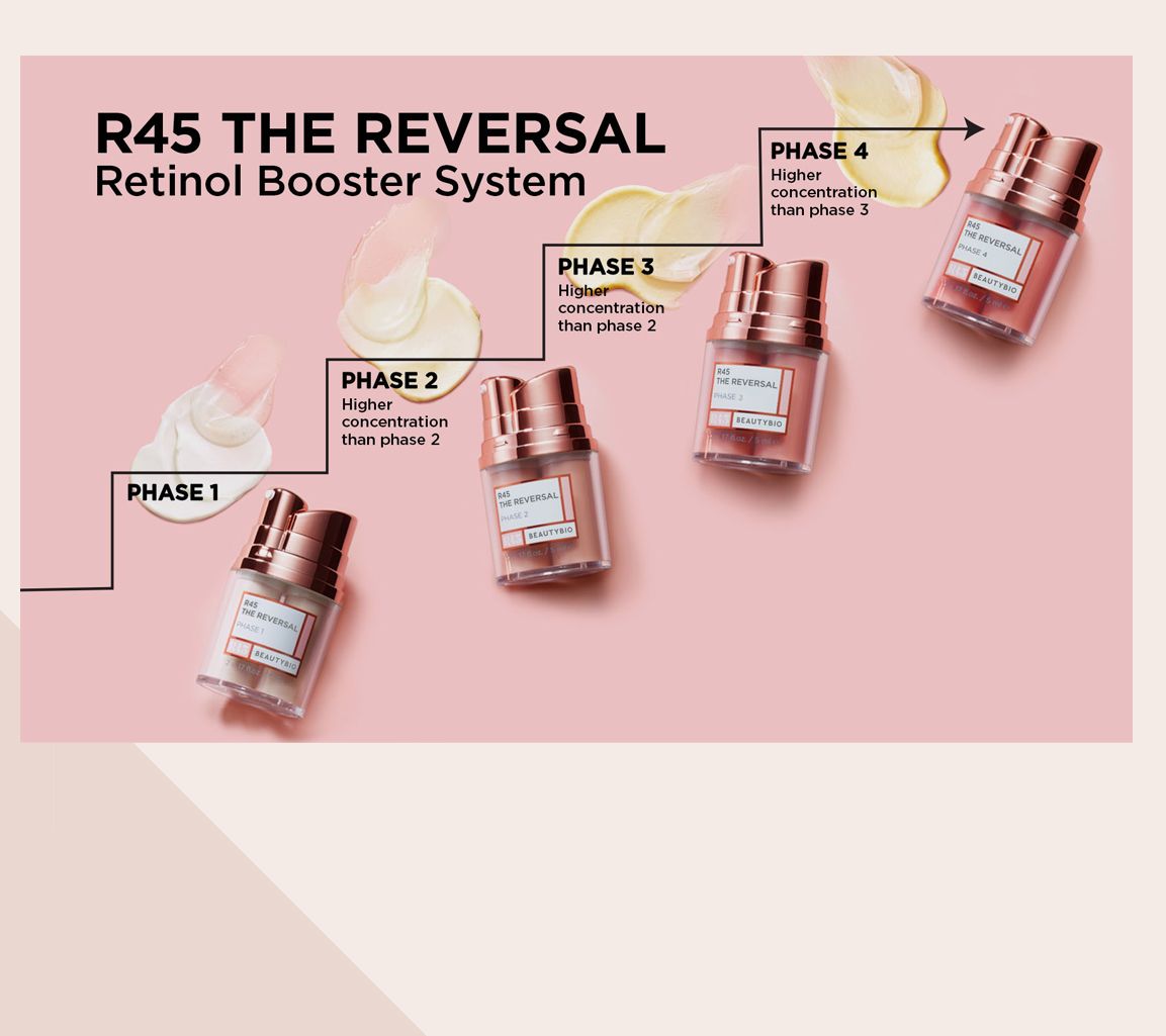 BeautyBio R45 The Reversal Retinol Cream is a patented three-phase Retinol Cream Booster System that helps address the appearance of fine lines and wrinkles. R45 The Reversal is a proprietary mixture of vitamin A and peptides that helps improve the appearance of wrinkles, skin tone evenness, and pores by optimizing the epidural layers of the skin, assisting with natural cell turnover and acting as a wrinkle-filler alternative by helping to plump wrinkles. Titration Therapy helps mitigate the traditional side effects associated with highly active vitamin A products -- concentration of ingredients increases from Phase 1 through Phase 3. Each phase takes approximately two weeks to complete. Phase 4 is the most concentrated phase from the R45 multi-phase beauty treatment. Phase 4 contains increased concentrations of key ingredients to help address the look of fine wrinkles, skin tone evenness, and pores for overall younger-looking skin. The retinoid concentration in Phase 4 is 67% more concentrated than Phase 3; Phase 4 is the highest level of concentration within R45's Titration Therapy.