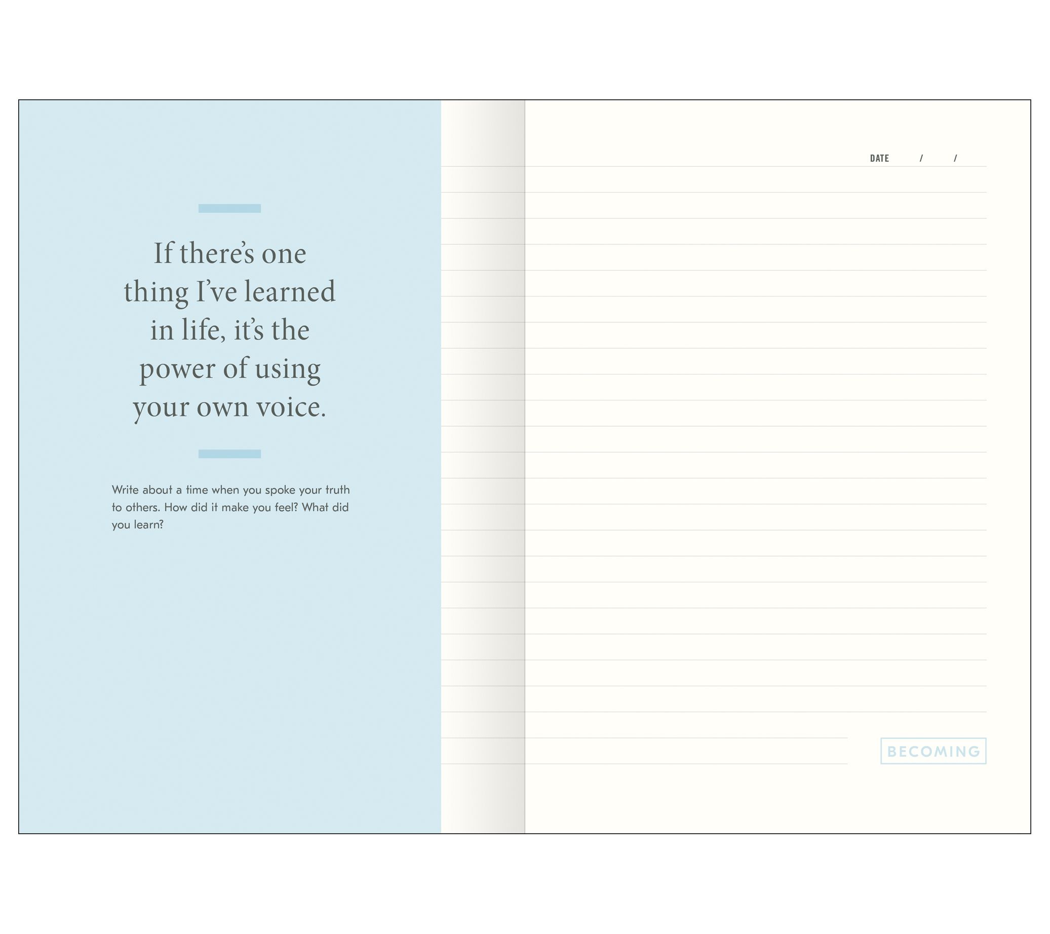 With this journal, she now provides you with the encouragement to find value in your own personal journey of becoming. Printed on cream writing paper, with a grosgrain ribbon, foil-stamped cover, and removable half-jacket, Becoming: A Guided Journal for Discovering Your Voice includes thought-provoking prompts designed to help you reflect on your personal and family history; your goals, challenges, and dreams; what moves you and brings you hope; and what future you imagine for yourself and your community. Writes Mrs. Obama in the Introduction to the Becoming journal, "I hope you'll use this journal to write down your experiences, thoughts, and feelings, in all their imperfections, and without judgment...We don't have to remember everything. But everything we remember has value."