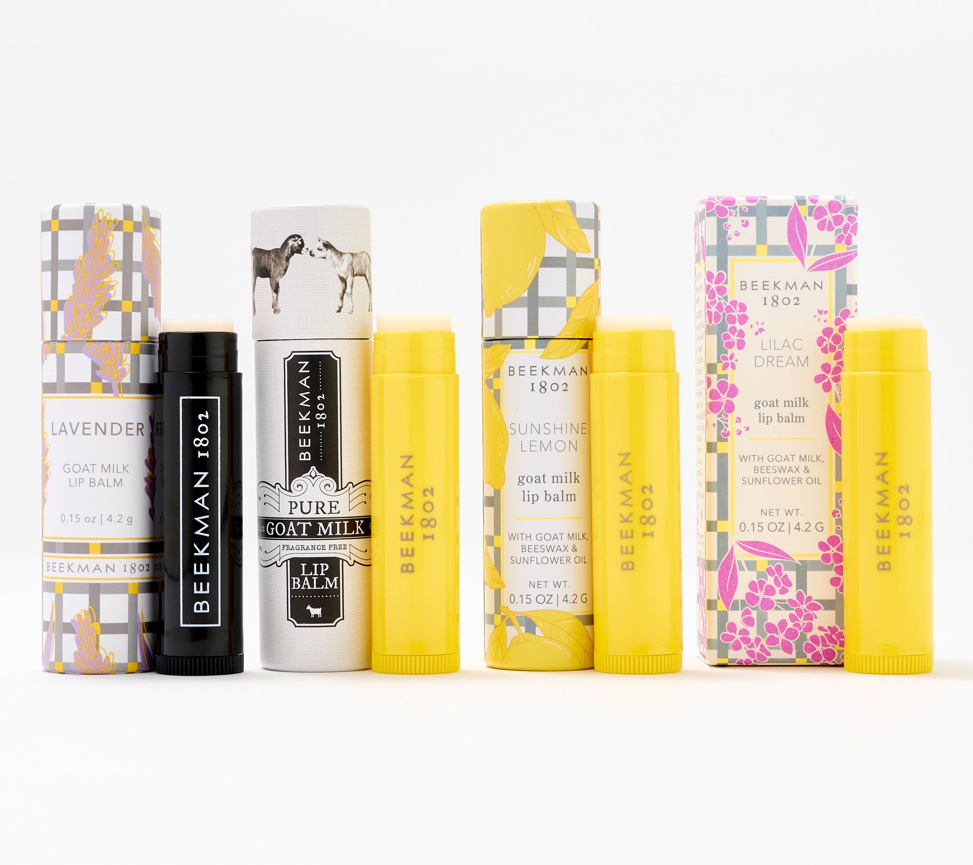 Enjoy the first kiss of spring with Beekman 1802's four-piece Goat Milk Lip Balm collection! Featuring four goat milk-based lip balms, one each in Pure Goat Milk, Lilac Dream, Sunshine Lemon, and Lavender, these rich lip balms help to soften and smooth the appearance of lips. Sulfate-, paraben-, petroleum-, and phosphate-free.