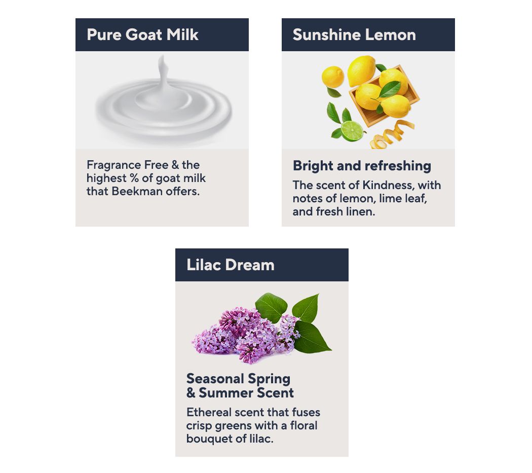 Cleanse with Beekman 1802 Goat Milk Hand & Body Wash, formulated with vitamin-rich goat milk, shea butter, and aloe vera to help soothe and moisturize skin.
