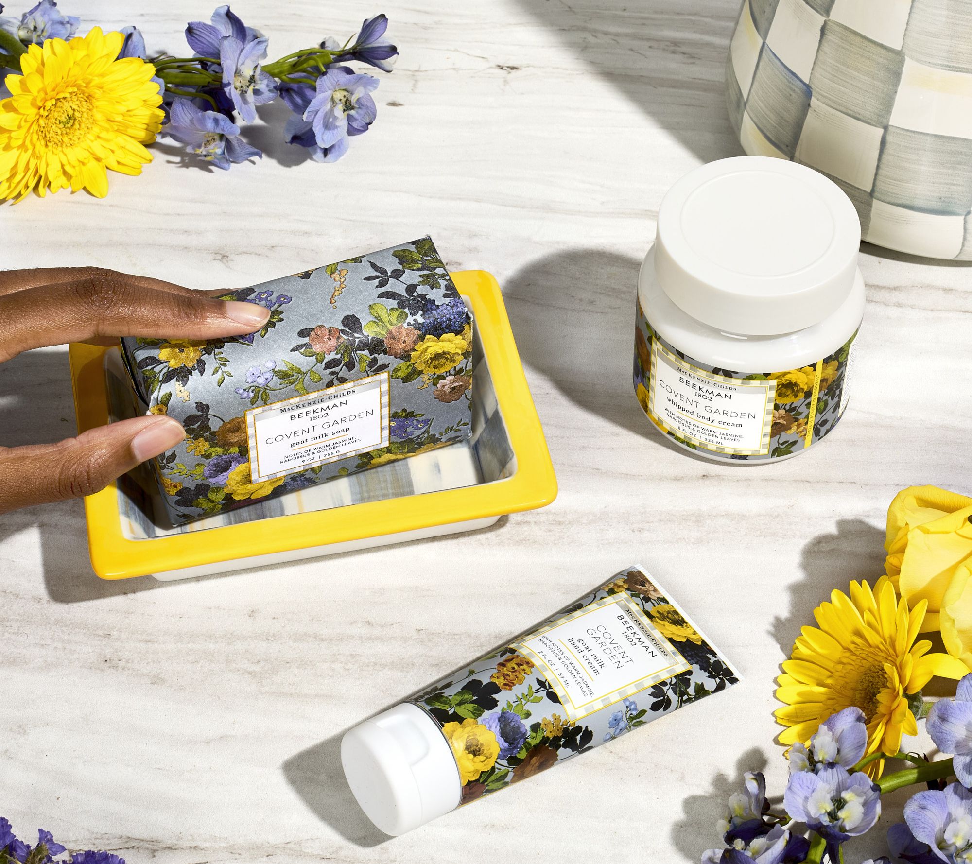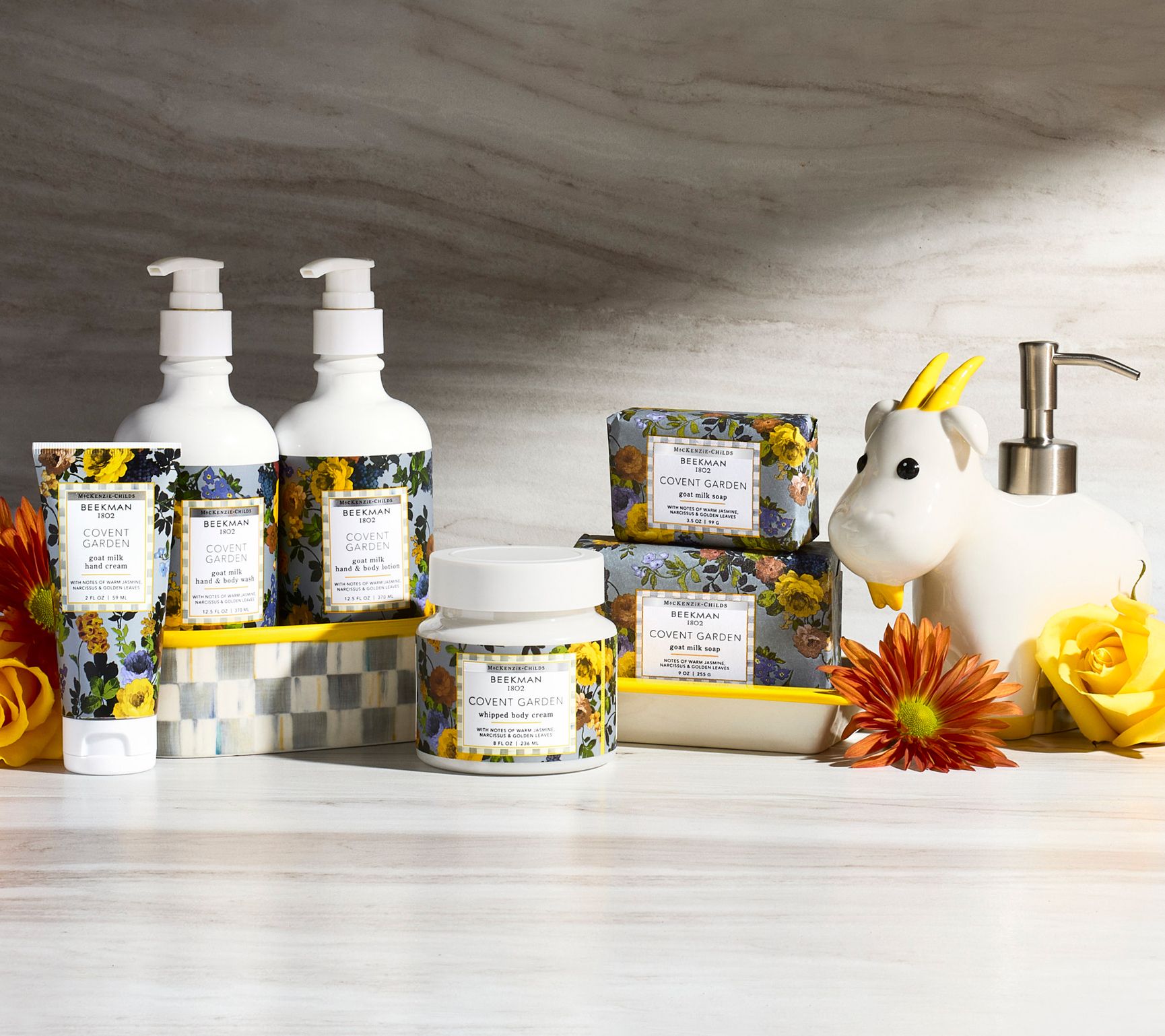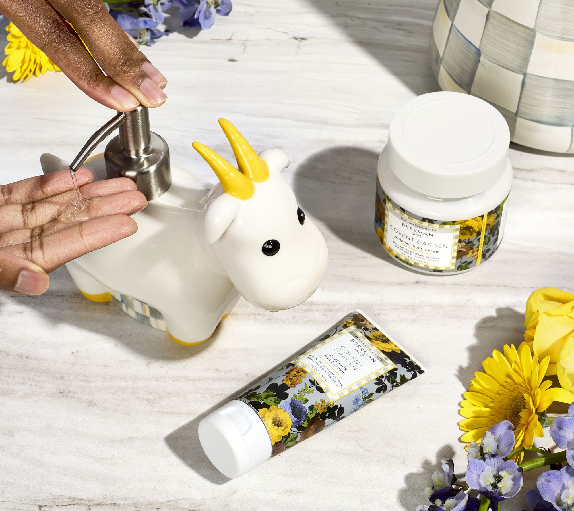 From Beekman 1802 and MacKenzie-Childs comes a special-edition collaboration! In honor of their neighboring farms, Beekman 1802 and MacKenzie-Childs have partnered to bring you the ultimate head-to-toe self-care collection (and collectible ceramic pieces!), all enriched with goat milk and in the Covent Garden fragrance. This bundle includes bar soap, body cream, hand & body wash, lotion, hand cream, and three MacKenzie-Childs ceramics: Goatie soap pump, caddy, and soap dish. Holiday gifting has never been so easy!