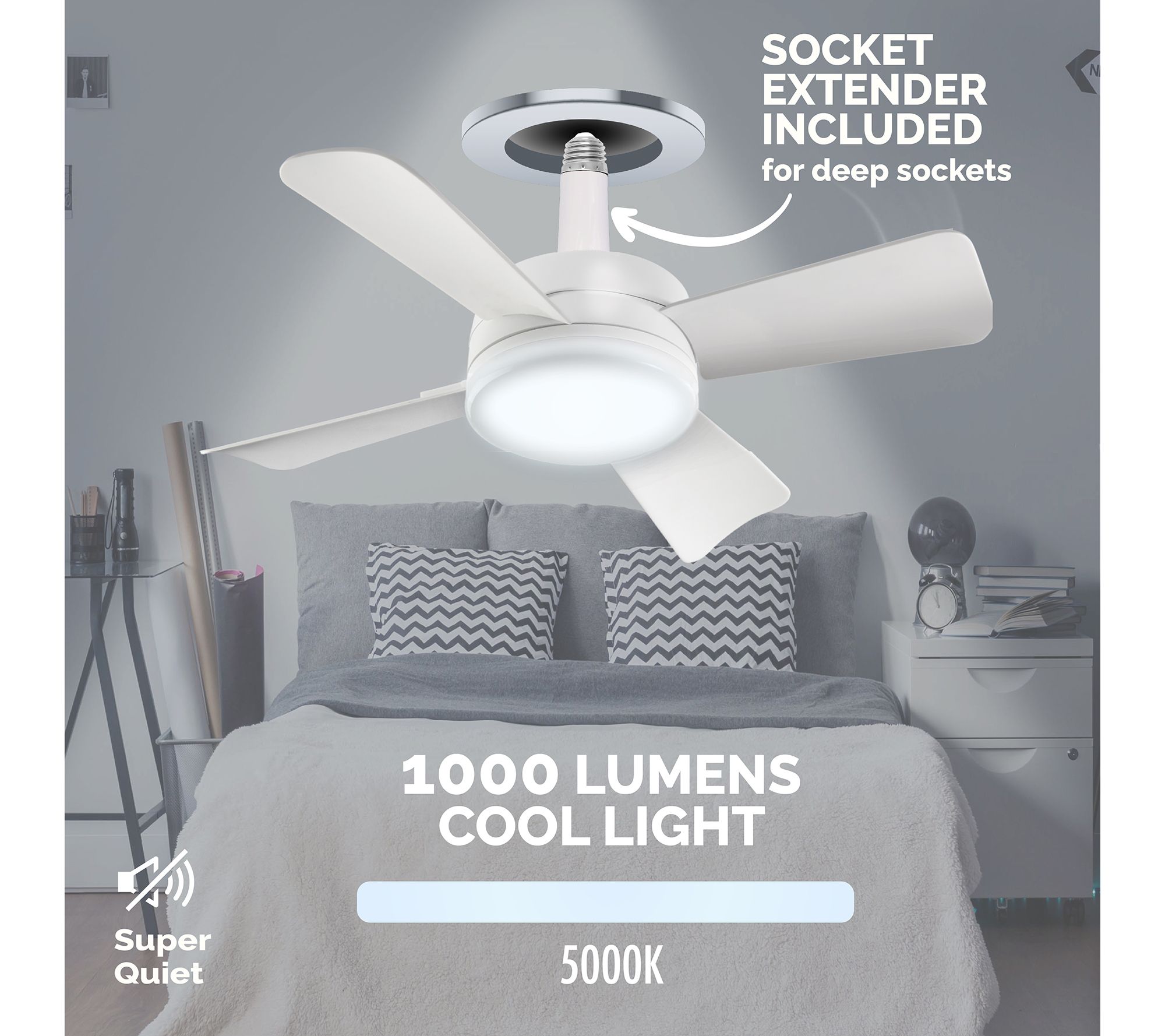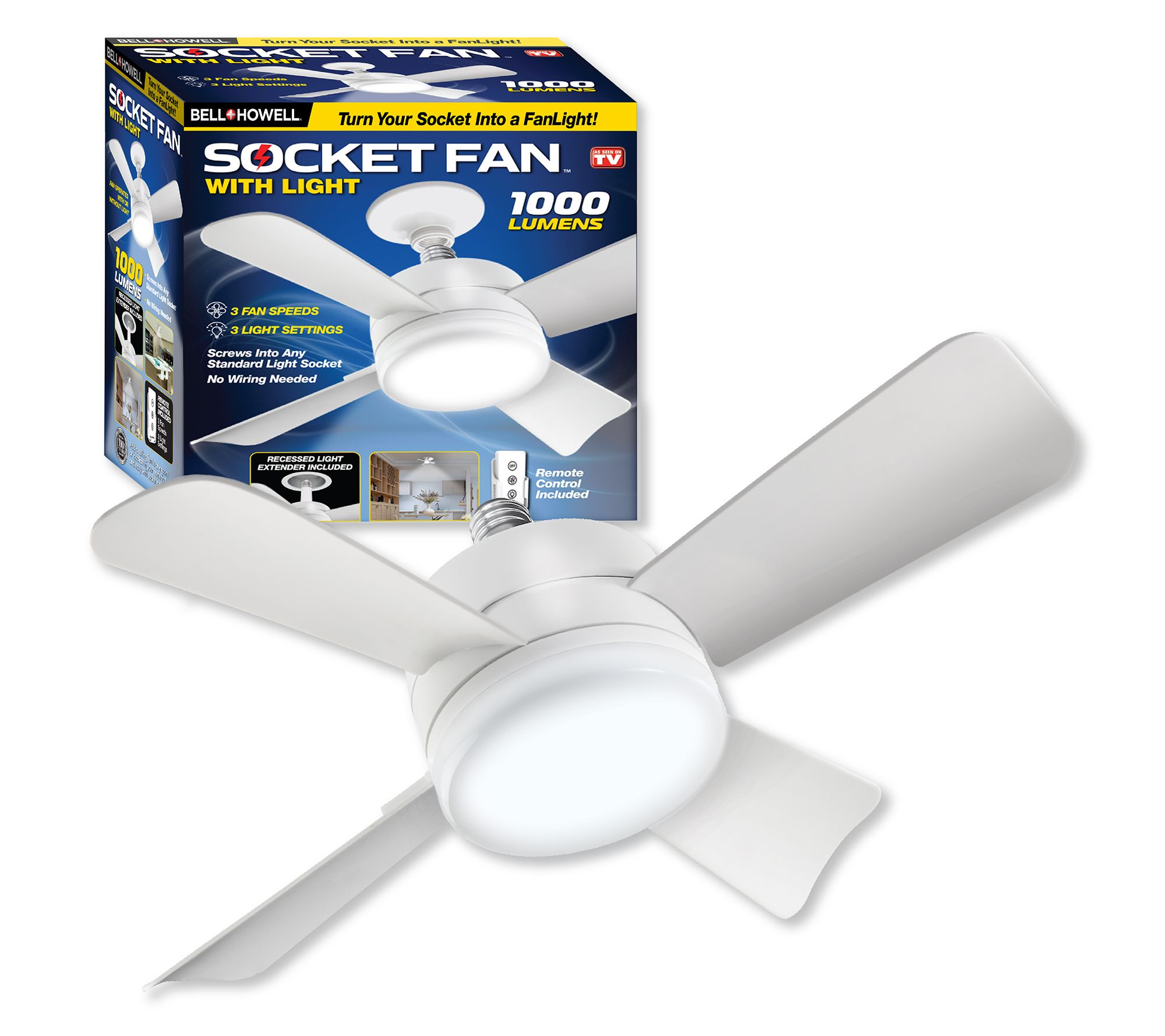 Banish that old box fan. There's a better way to bring about a breeze indoors. This sleek ceiling fan not only cools with three different speeds, but it sheds light on your living space, too. Easy to install, it simply screws into an existing light socket. From Bell & Howard.
