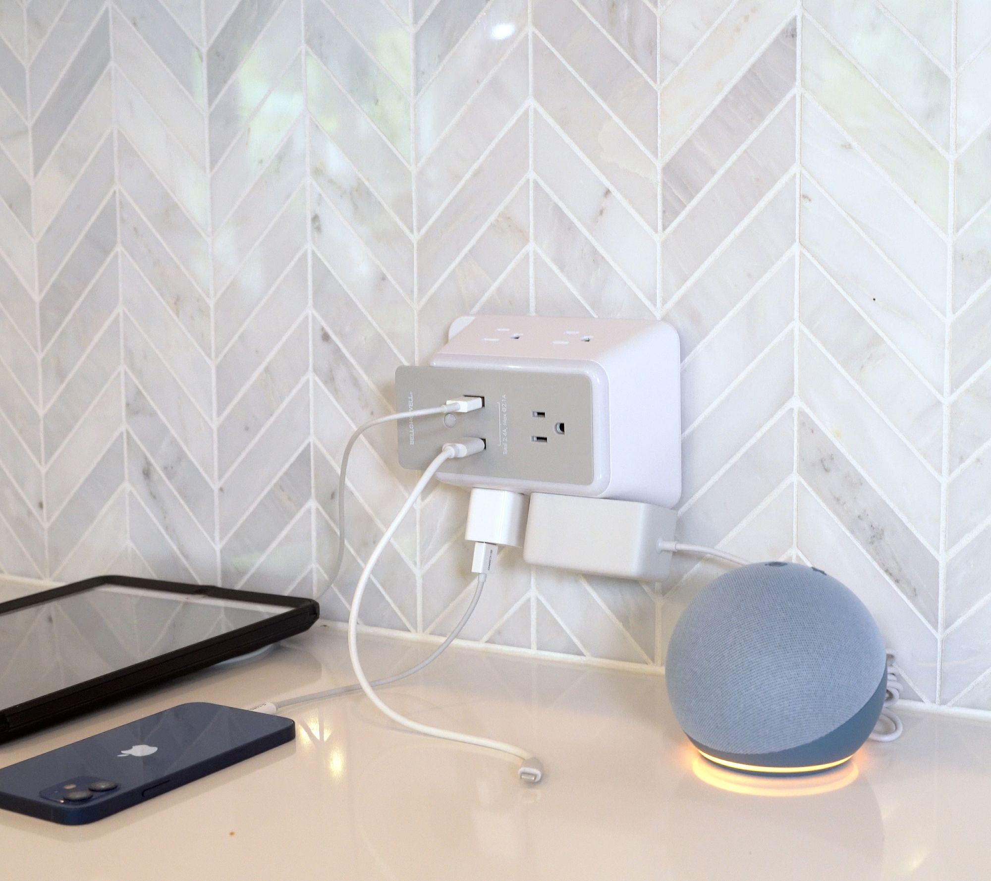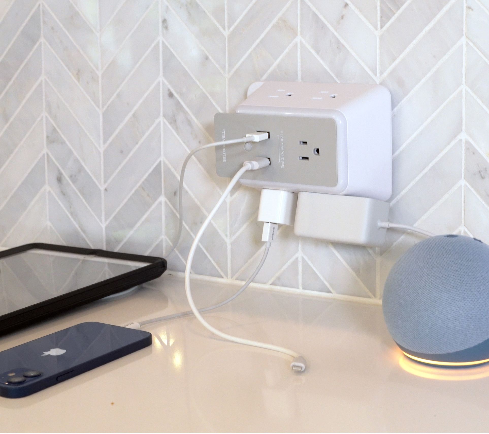 Plug in and power up! This set of two nightlight wall power hubs from Bell & Howell keeps everything you need to charge in one place. With two USB ports and five AC power outlets, you have the ability to power up to seven devices all at one time. An LED dusk-to-dawn sensor automatically illuminates dim spaces in dark conditions. Plus, a space-saving docking shelf holds up to two devices while charging. From Bell & Howell.