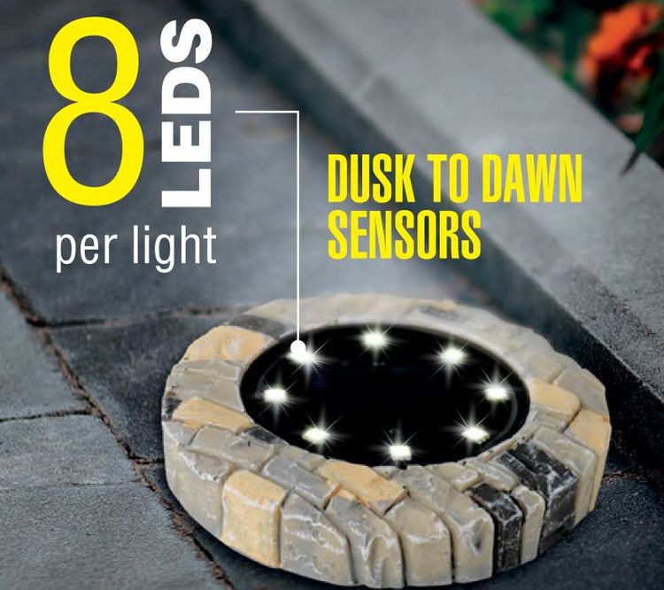 • Includes eight solar LED stake lights, each with a rechargeable battery