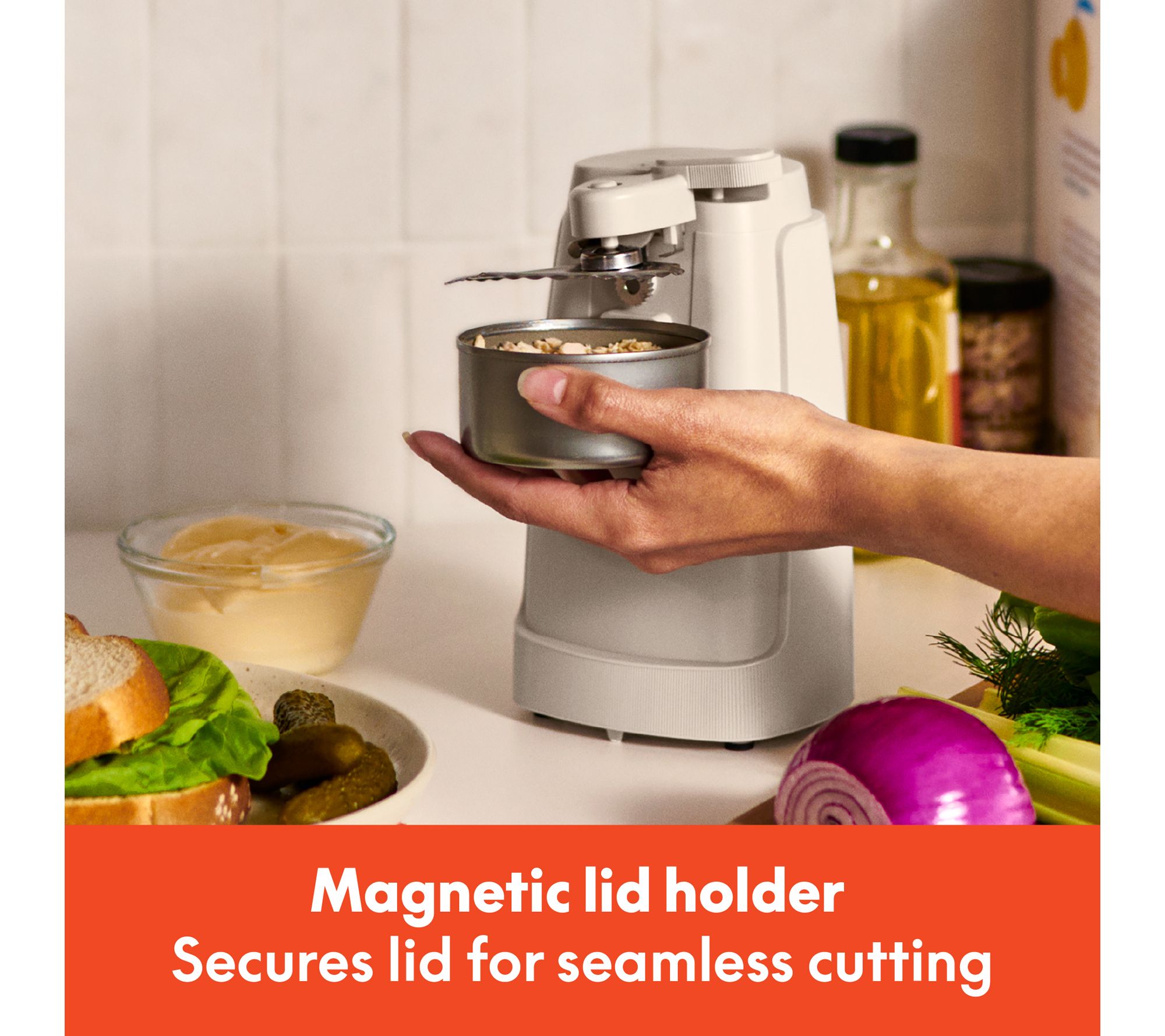 • Stainless steel cutting blade and magnetic lid holder open small, standard, and tall cans