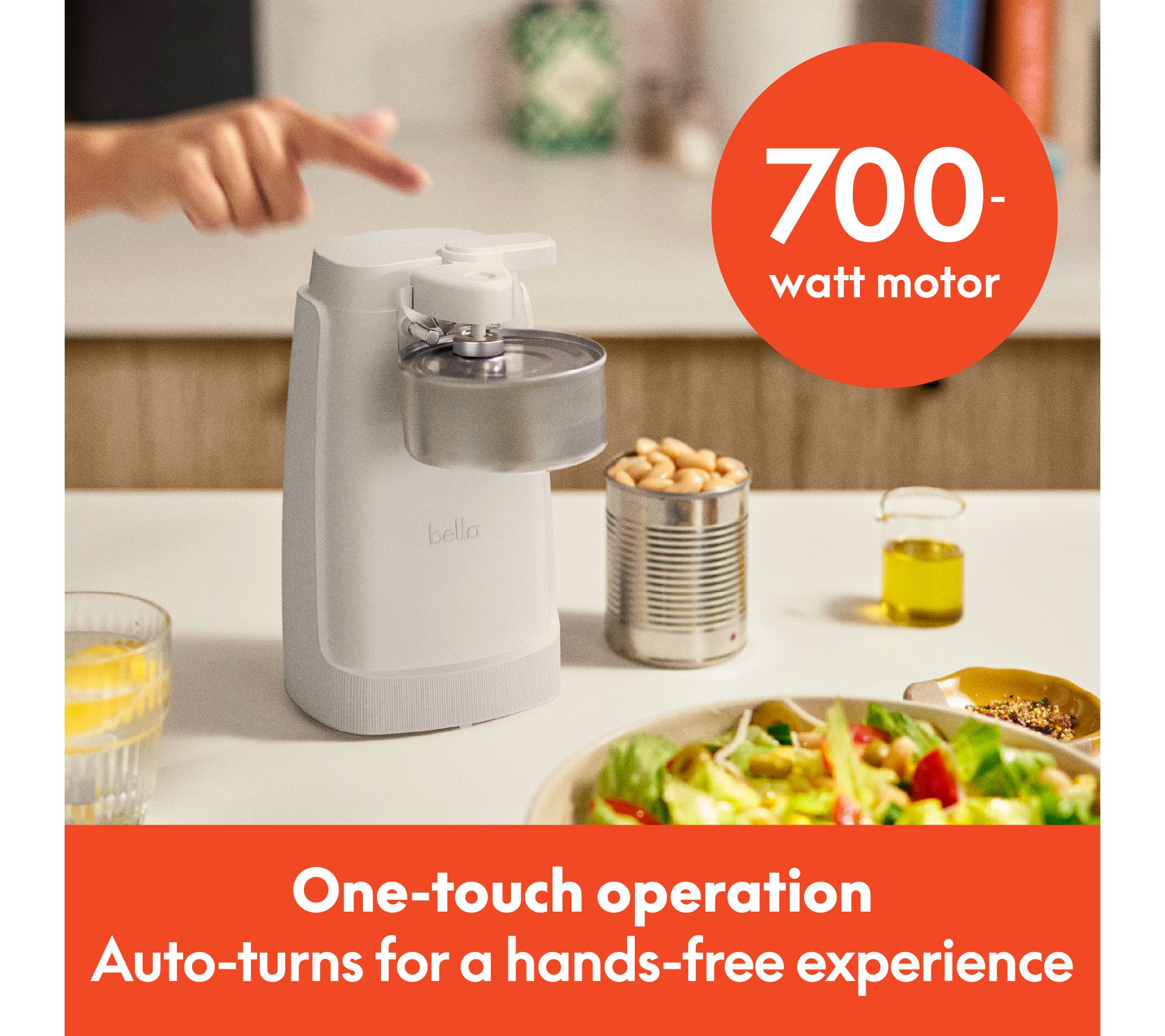 Open cans and jars with ease and confidence thanks to this electric can opener, designed for quick one-touch operation. Its powerful stainless steel cutting blade and magnetic lid holder handle everything from small ingredients to tall pantry staples, while a built-in knife sharpener means you'll always be ready for meal prep. From Bella.